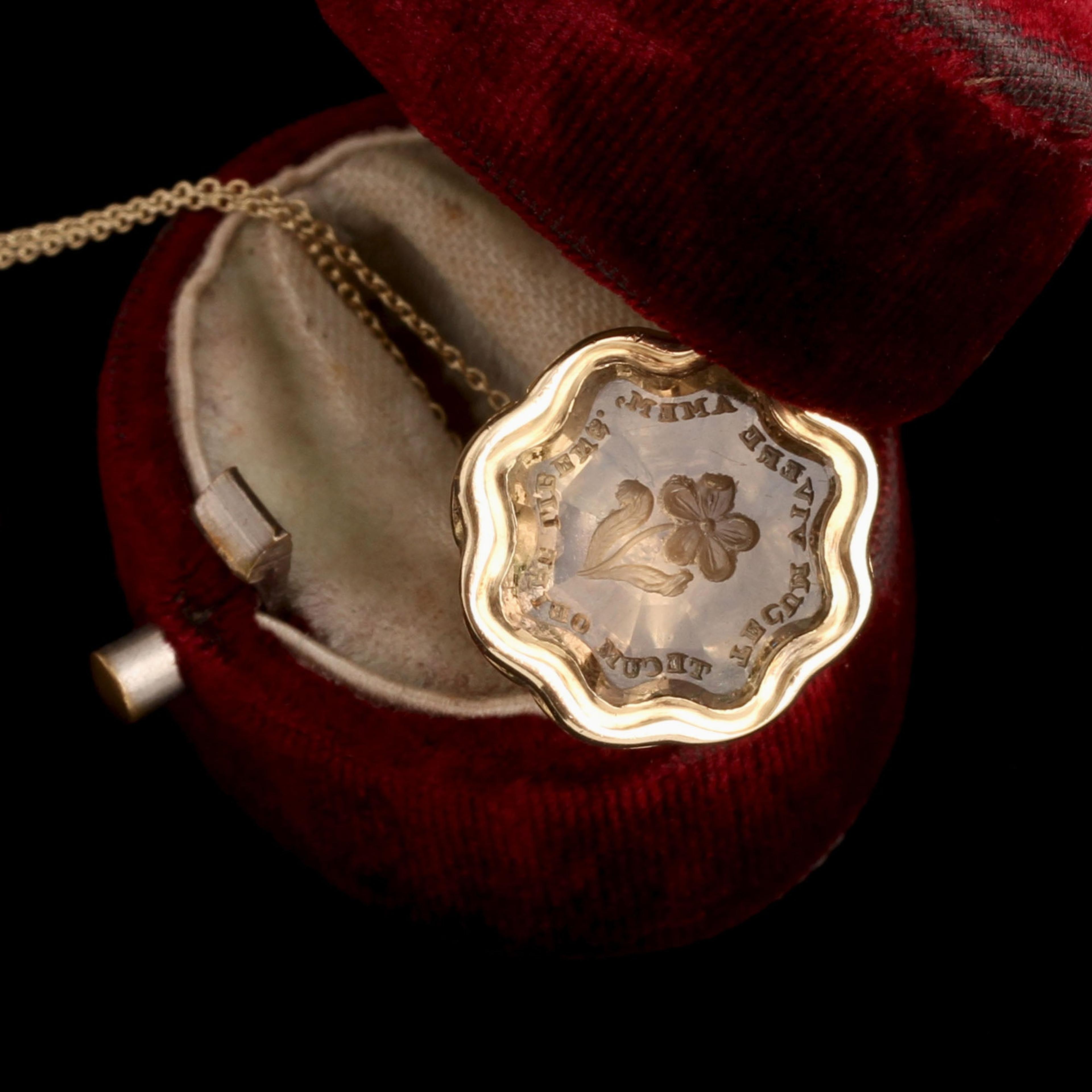 This early 1800s fob was designed to be stamped in hot wax to create a seal correspondence. A Georgian era writer of letters would have a variety of seals on hand with different images and phrases that would give the receiver an indication of the message’s tone. This gold-cased fob features a citrine intaglio with the Latin phrase “Tecum Vivere Amem, Tecum Obire Libens” surrounding a forget me not. The quote comes from the Roman poet, Horace, and translates as “I would love to live with you, willingly would I die with you.”