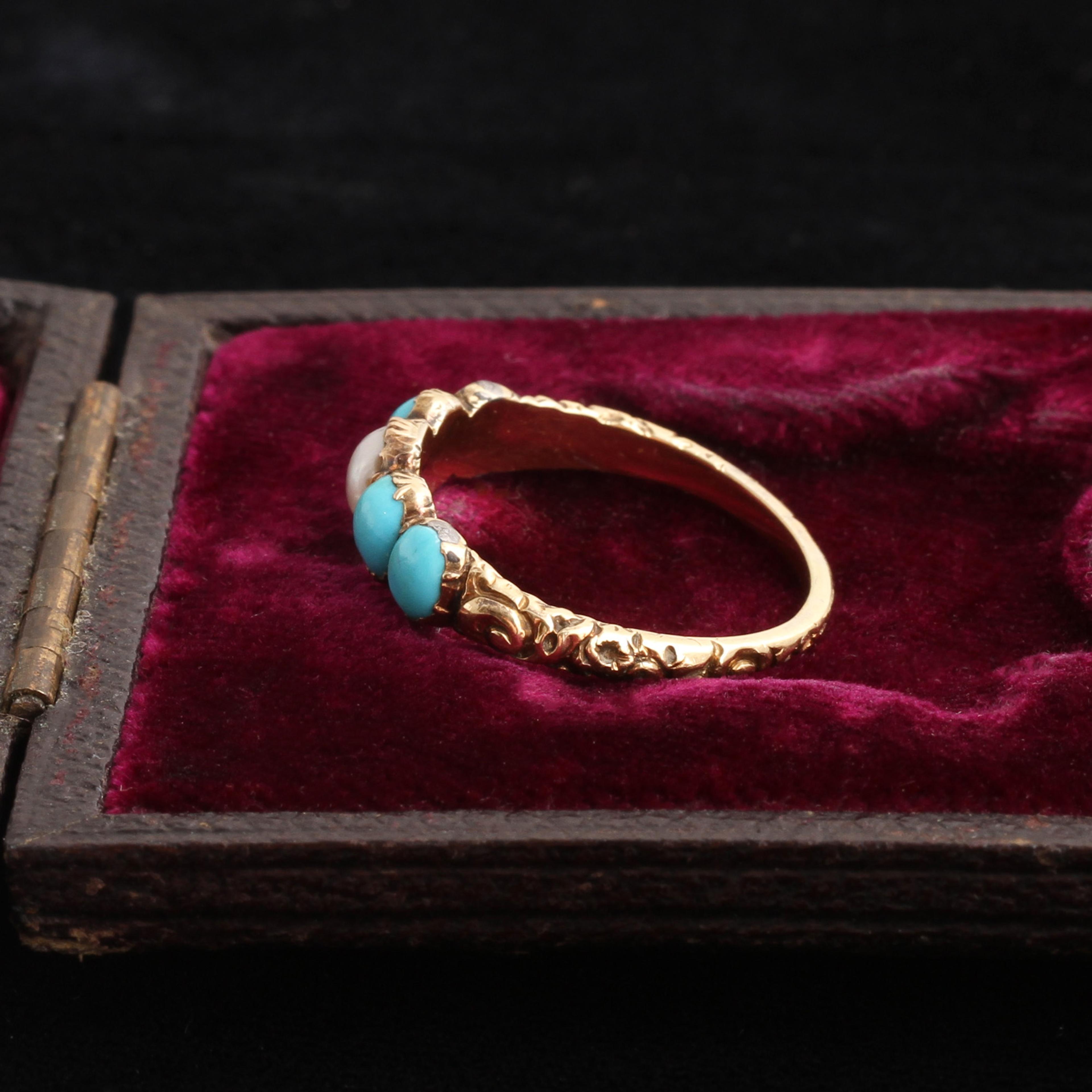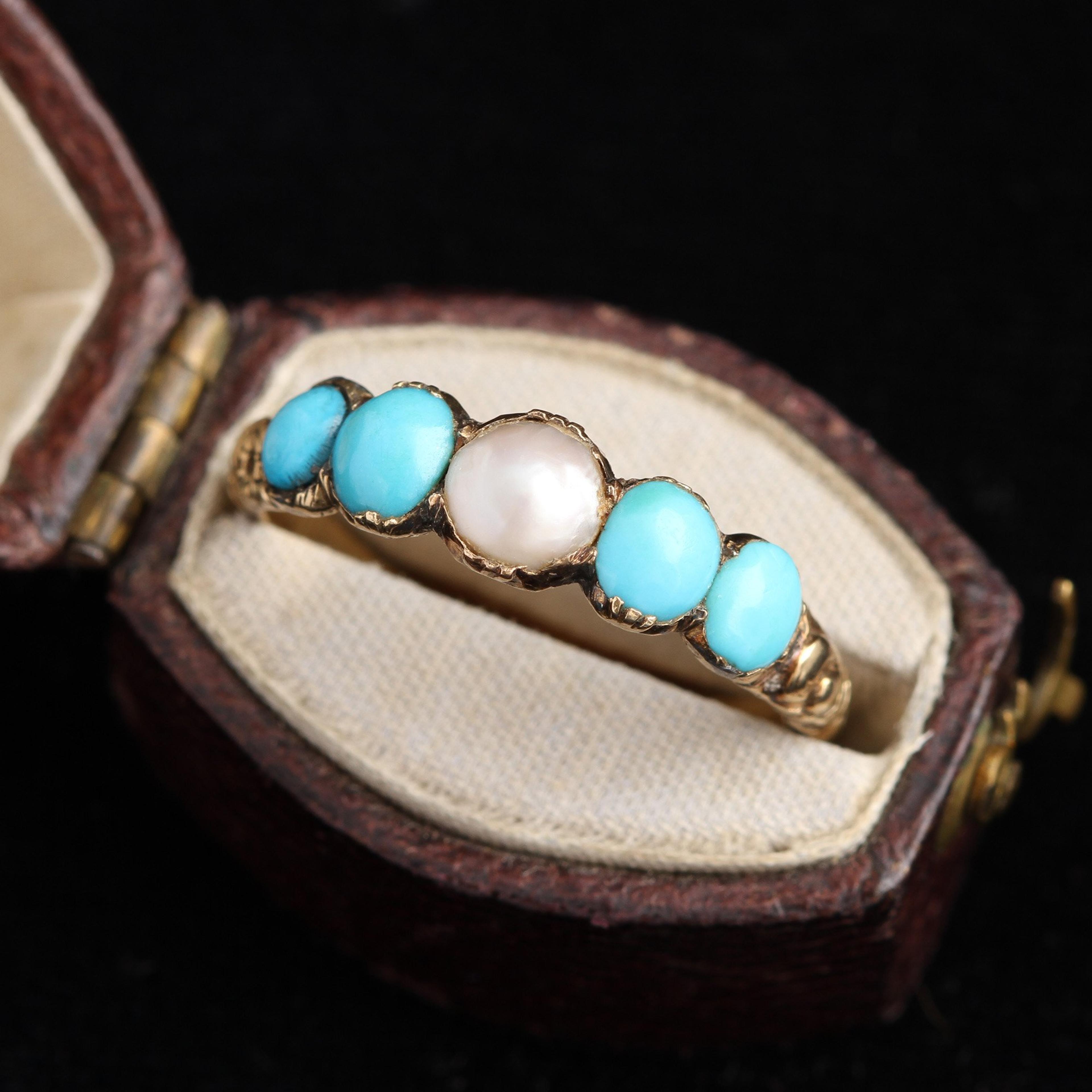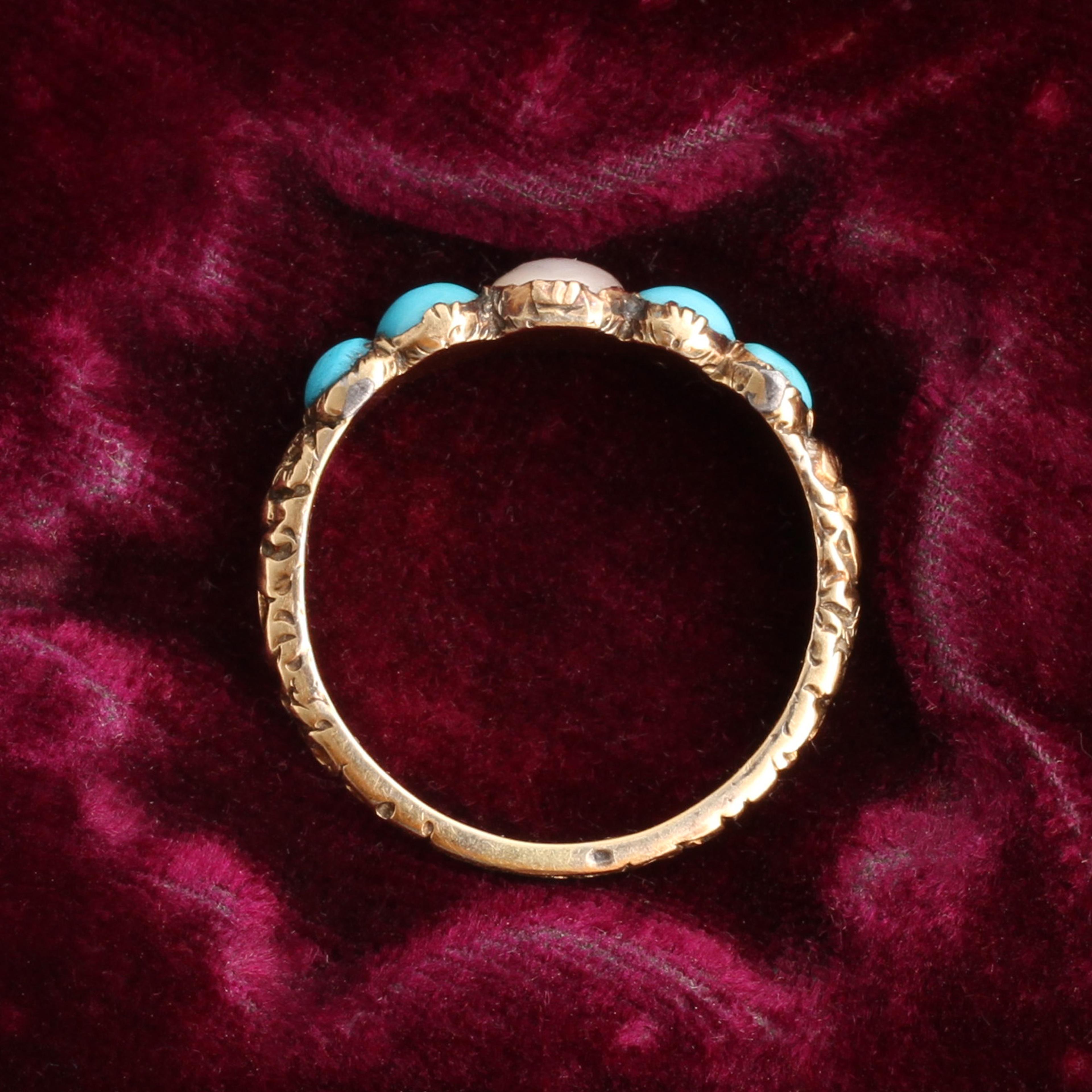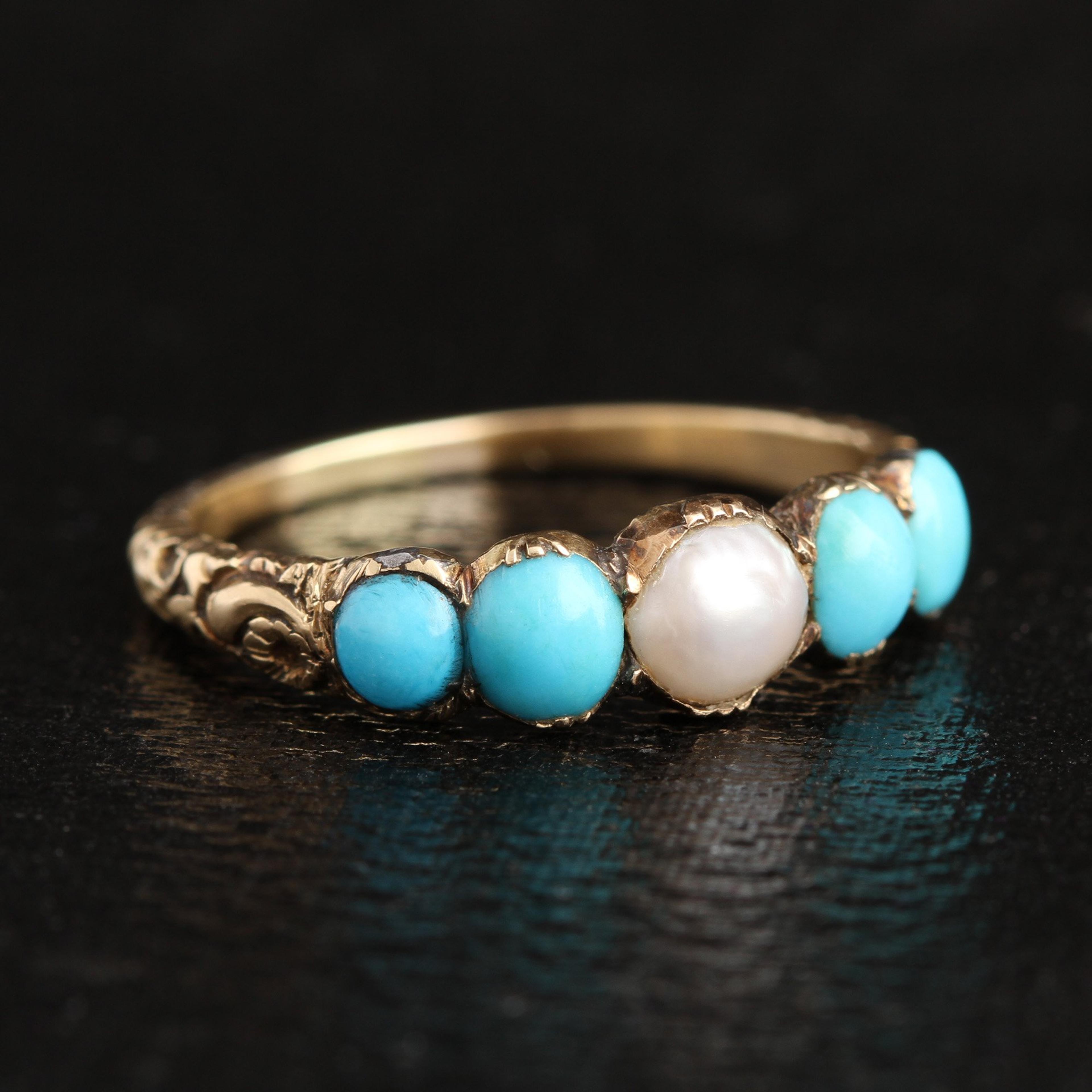 This Georgian ring features bright robin's egg blue turquoise cabochons and a single split pearl set in crimped collets. The shoulders and shank are decorated in high Gothic Revival style with floral-esque swirls and flourishes rendered in high relief.
