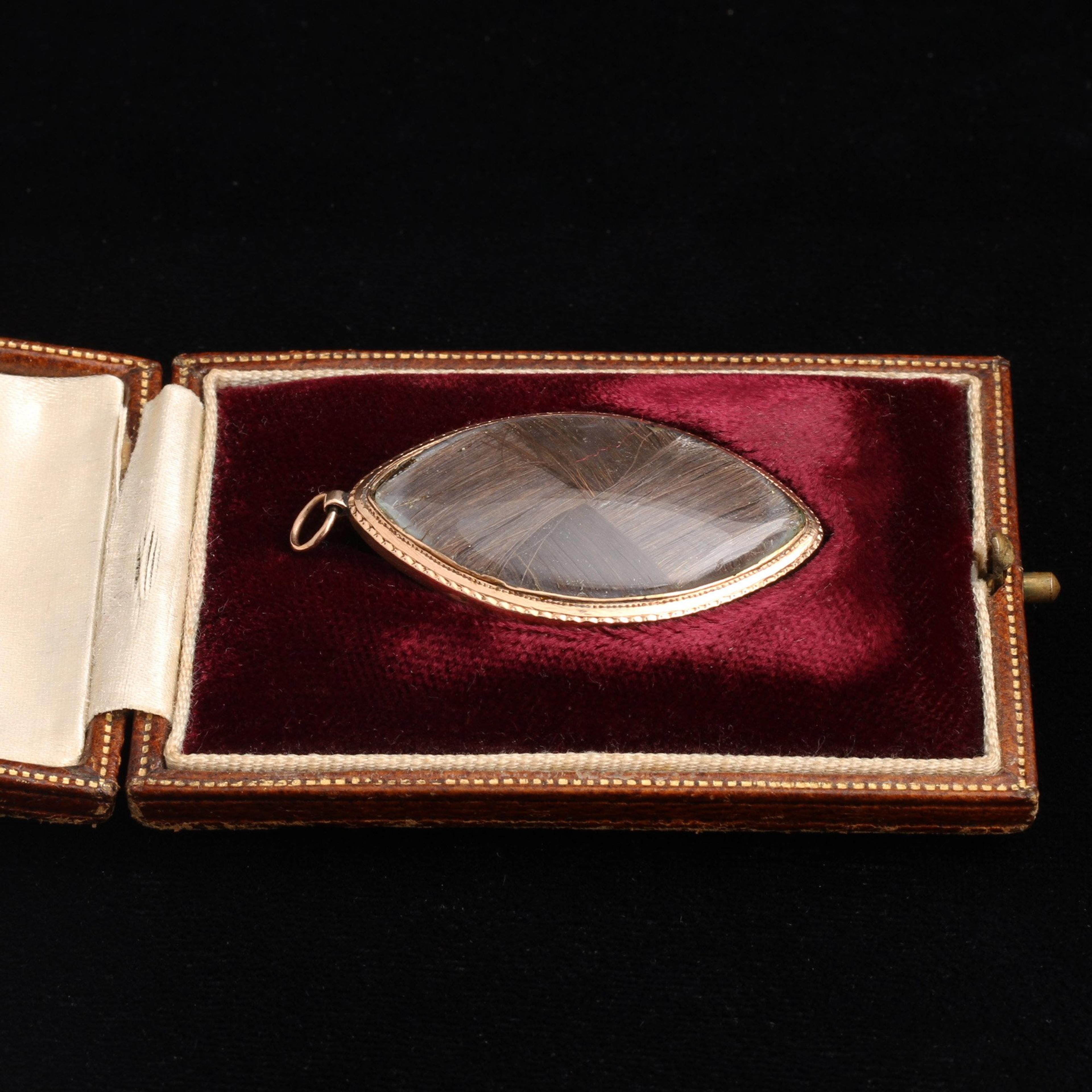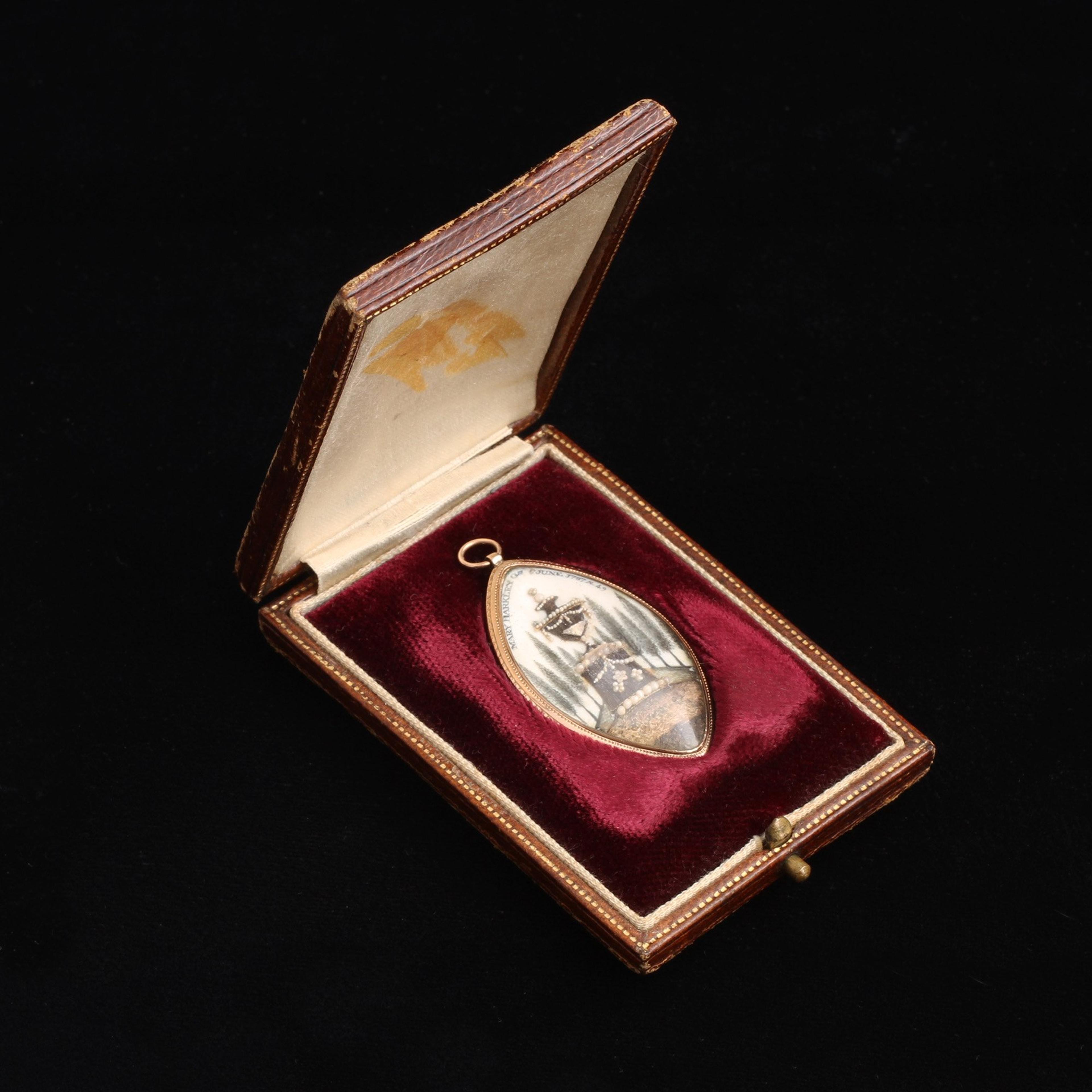 An urn on a plinth, hair, and seed pearls are classic symbols we see in mourning jewelry. On this incredible mourning miniature the urn and plinth are actually fashioned from hair and adorned with gold wire and seed pearls. In the background is an orderly stand of cypresses. The dedication at the top reads: Mary Barkely Ob 6 June 1787 Ae 49. This incredible piece is made all the more remarkable by the fact that it comes it its original fitted box.