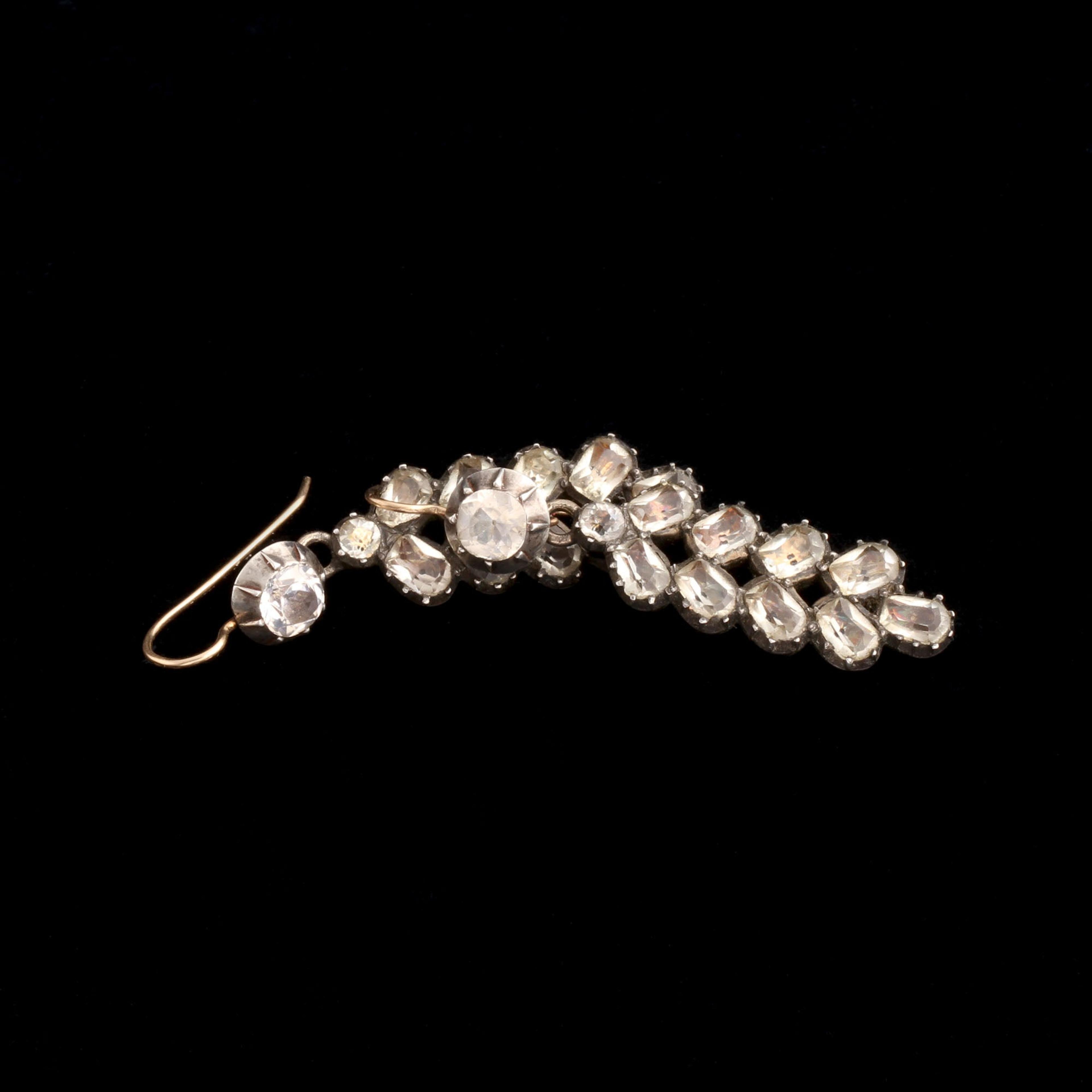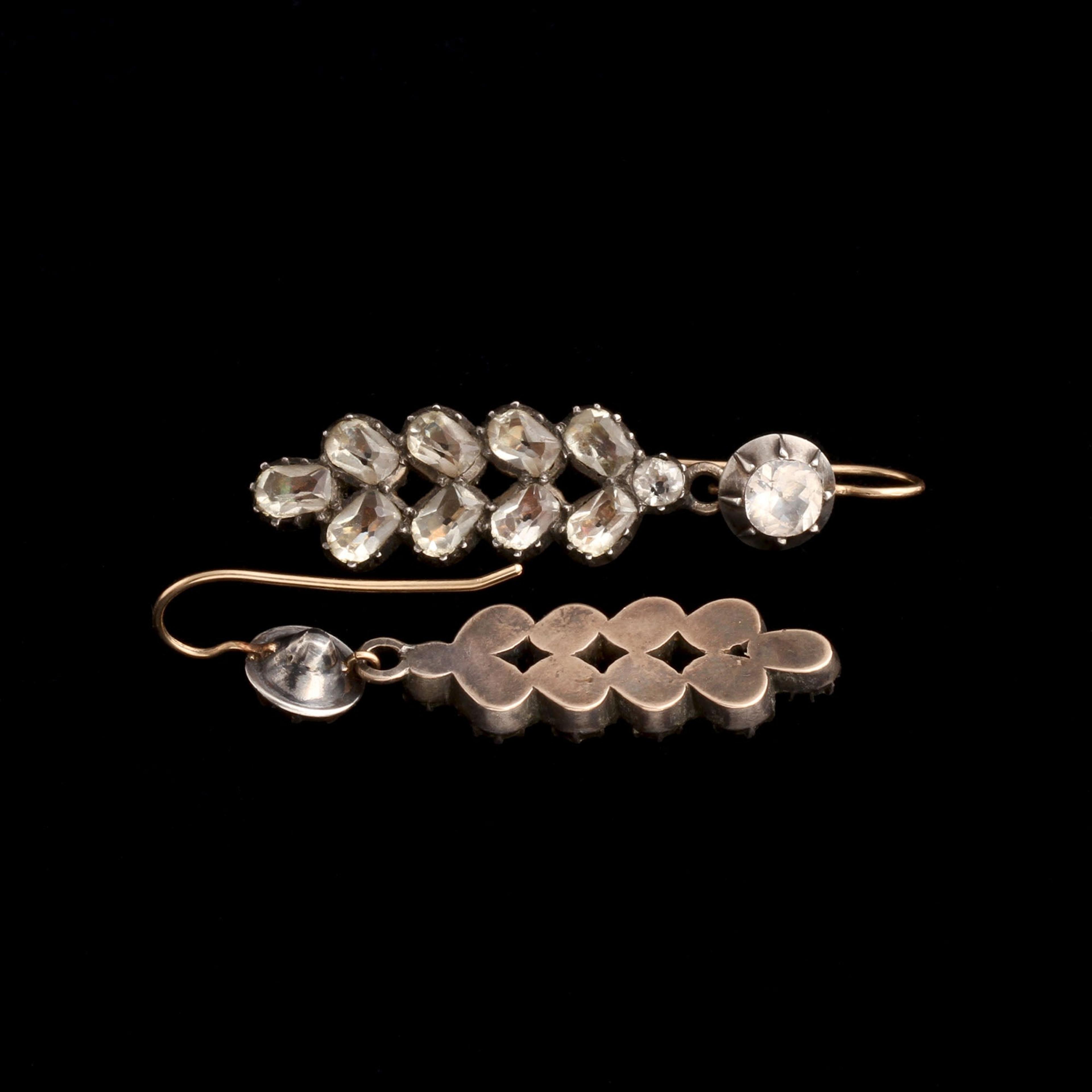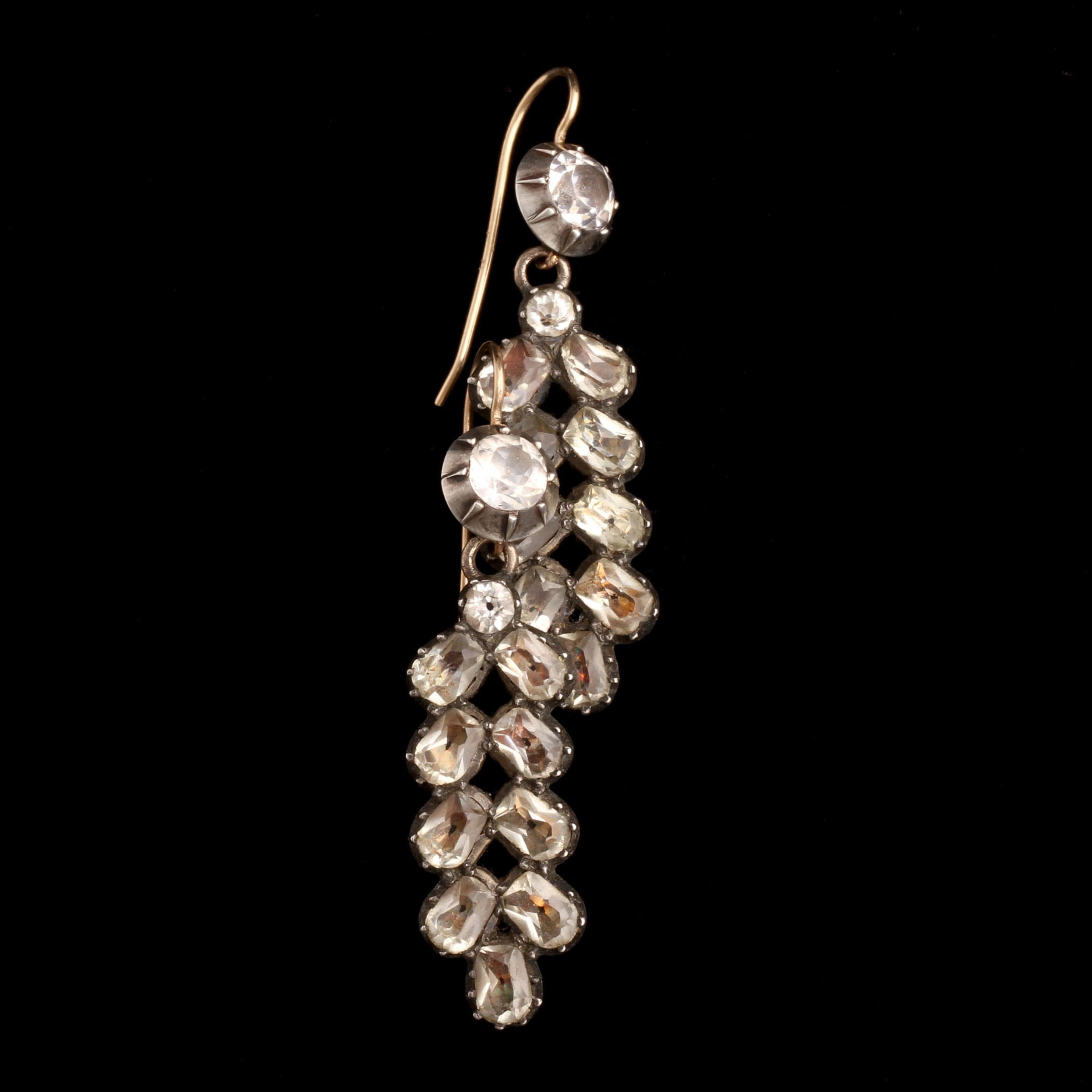 An exquisite pair of Georgian statement earrings with round and cushion cut white paste set in silver with gold washed backs and newer gold ear wires.