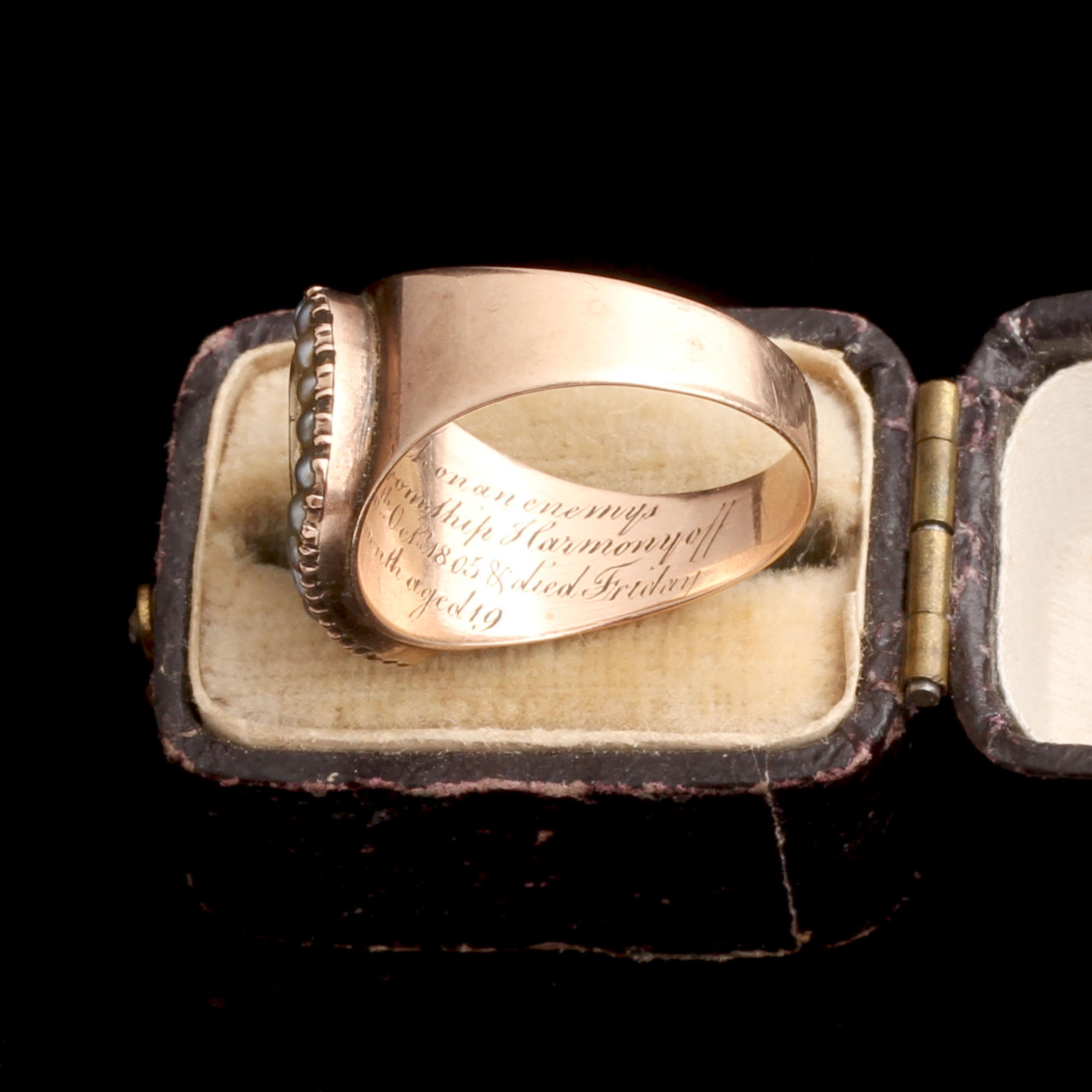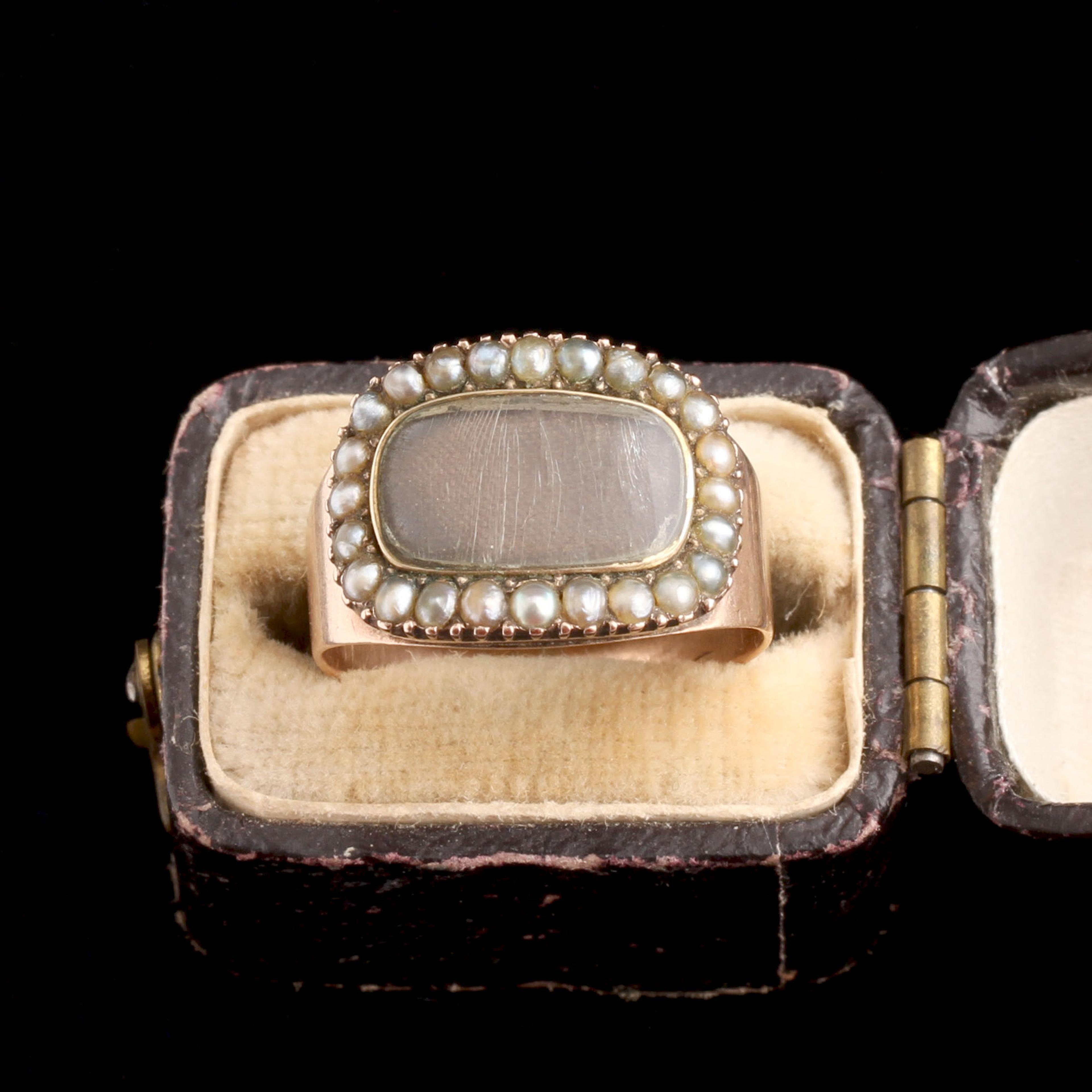 The boat-shaped marquise diamond cut was developed around this time, supposedly to imitate the smile of Louis XV’s mistress, the marquise de Pompadour. Paste — an imitation gemstone made from leaded glass — was newly developed in the 18th century, and set into jewelry with the same creativity and care as its more precious counterparts. Real and imitation gems were almost always set in closed-backed settings, lined on the underside with thin sheets of foil to enhance the color of the stone and highlight it's sparkle. This makes Georgian rings tough for modern women to wear, especially on an everyday basis: genteel, jewelry-owning ladies of the 18th century were not famous for working with their hands like we are. Nor did they wash their hands as much as we do. Water will virtually ruin a foiled setting, so take special care with your Georgian ring. Very little jewelry from this period is still in circulation, and it's very difficult to repair.
