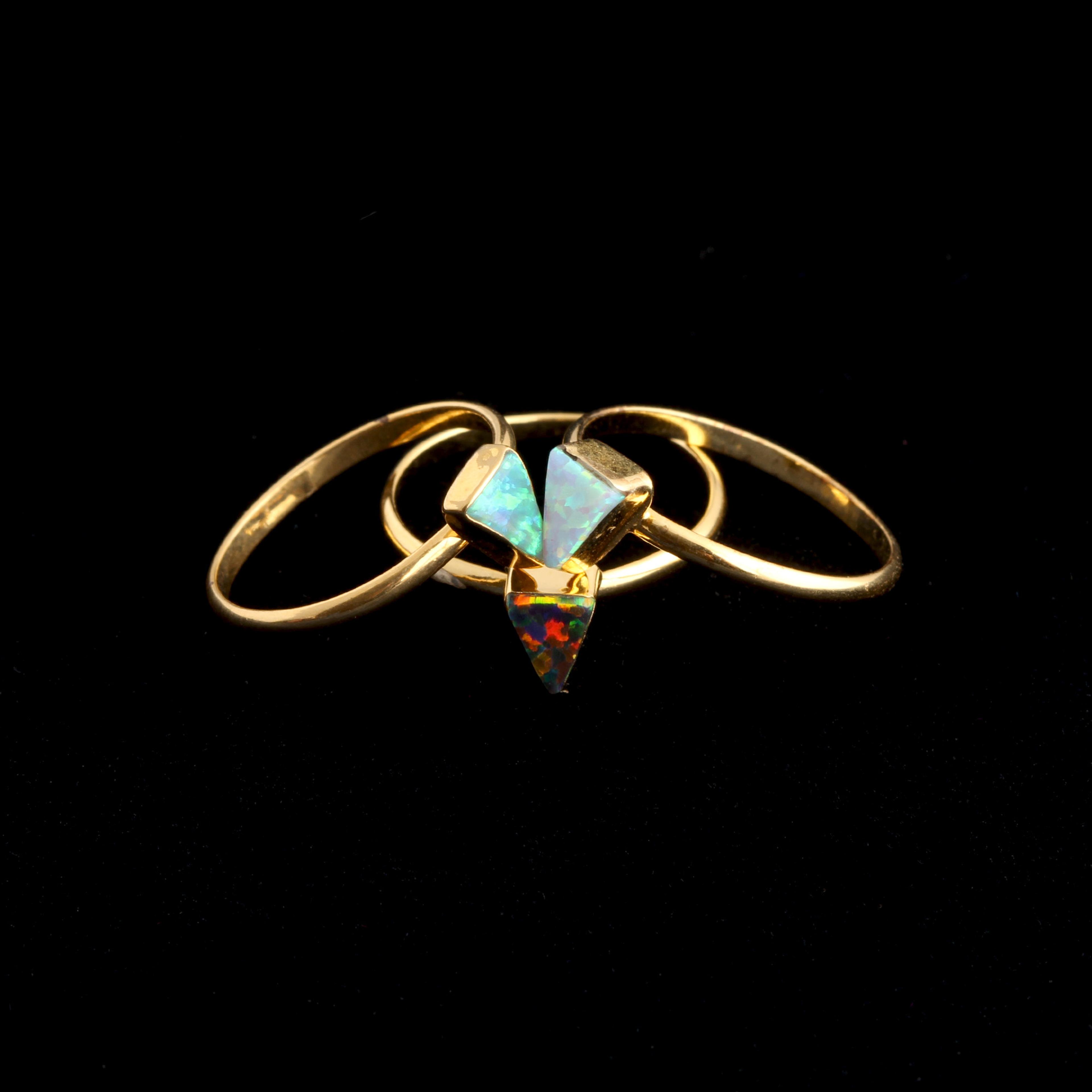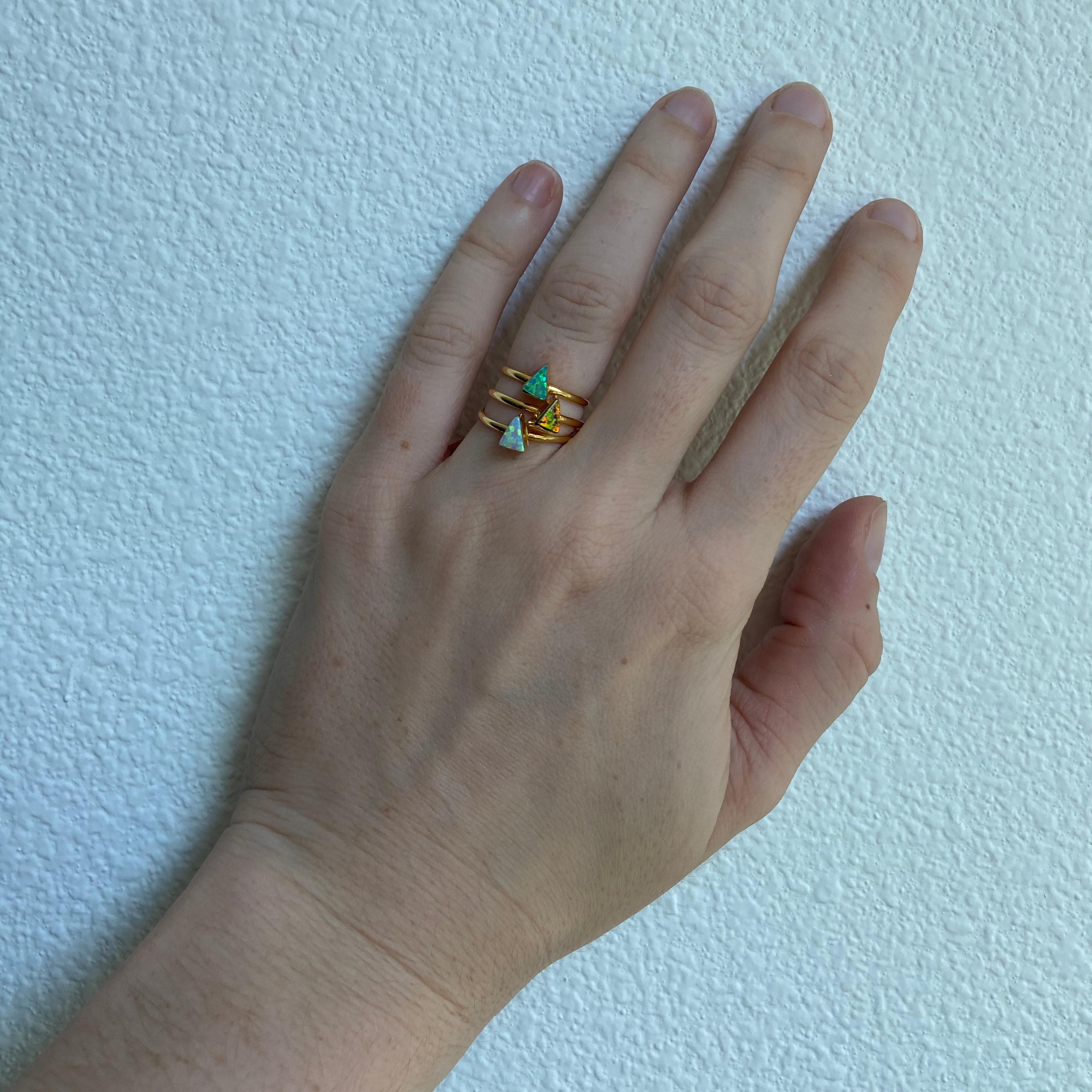 In addition to being gorgeous, opals are reputed to have healing properties and the ability to stimulate the creative imagination. These gold plated rings boast glittering rainbow stones and an easy-to-wear flat profile. We designed them as a variation on our isosceles opal studs, which are our most popular earrings of all time. Pick your color and size below - the price is for one ring, but as you can see, they look great stacked.