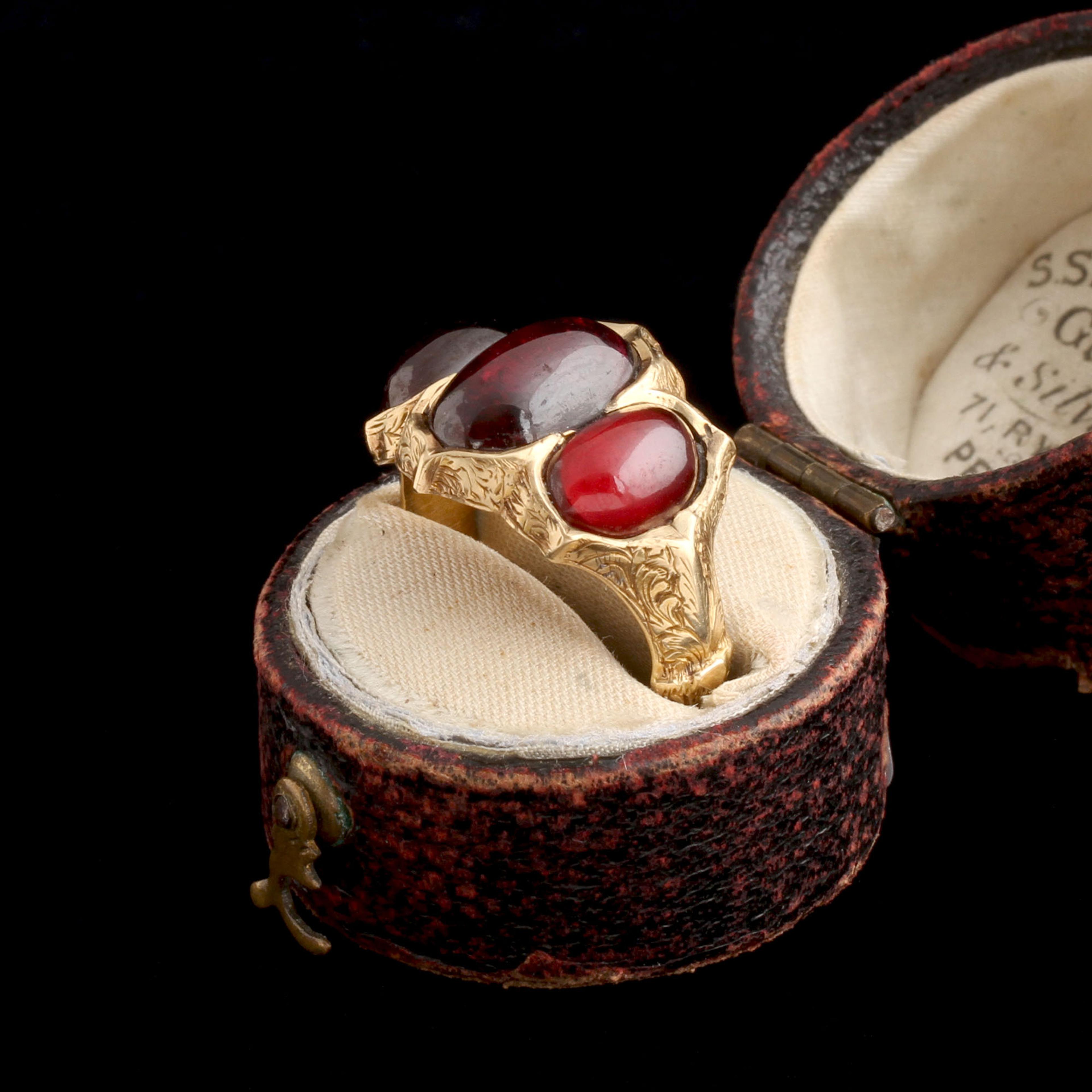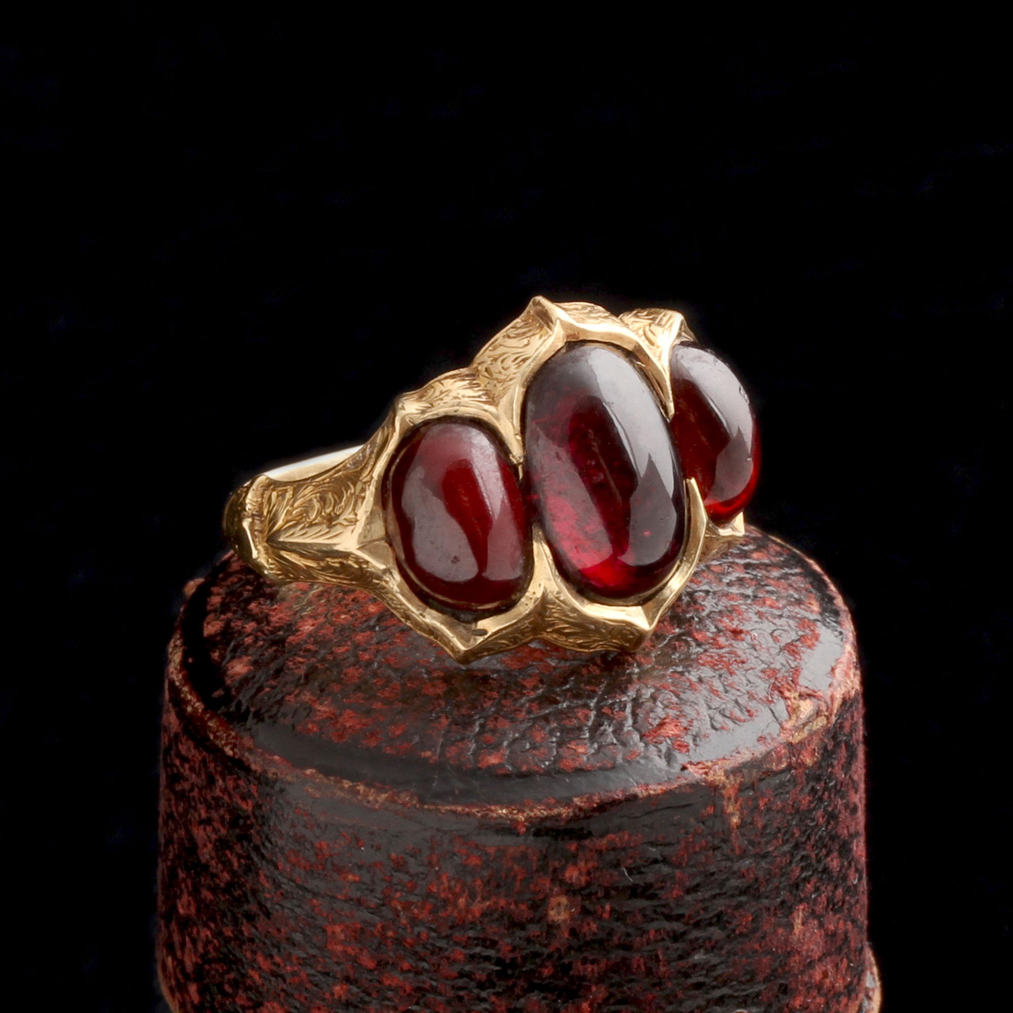OH MY GOTH! This ring is a classic expression of mid-19th-century Gothic Revival jewelry, a style that created emotional drama by borrowing medieval forms. The triple garnet head echoes reliquaries or tri-fold panels from the Middle Ages. The stones are left domed and closed-backed, emphasizing depth of color over brilliance. This was a hallmark of Gothic Revival design.