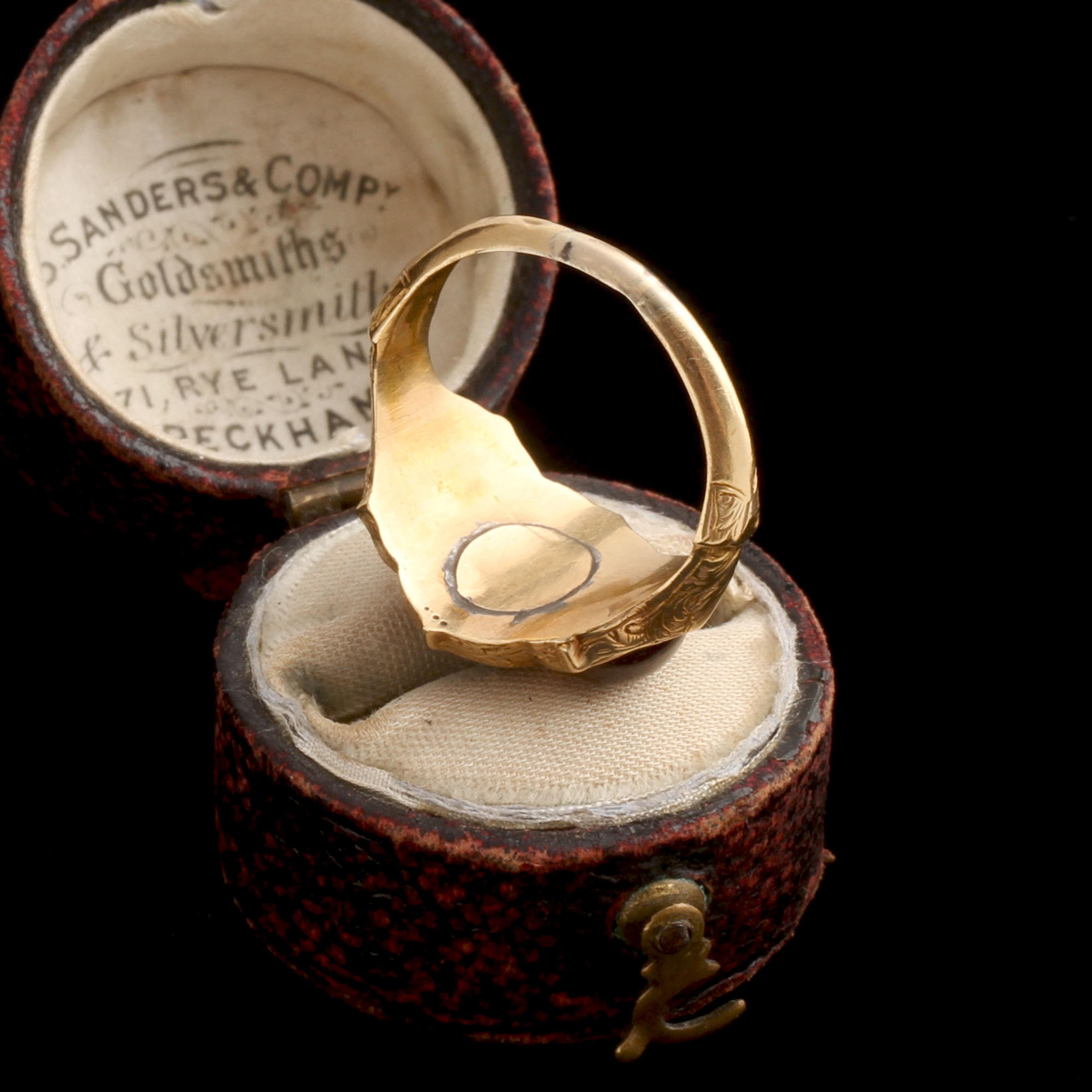 Good - mark on the shank from a previous resizing; repair on the underside of the head (probably to close the opening beneath the center stone)