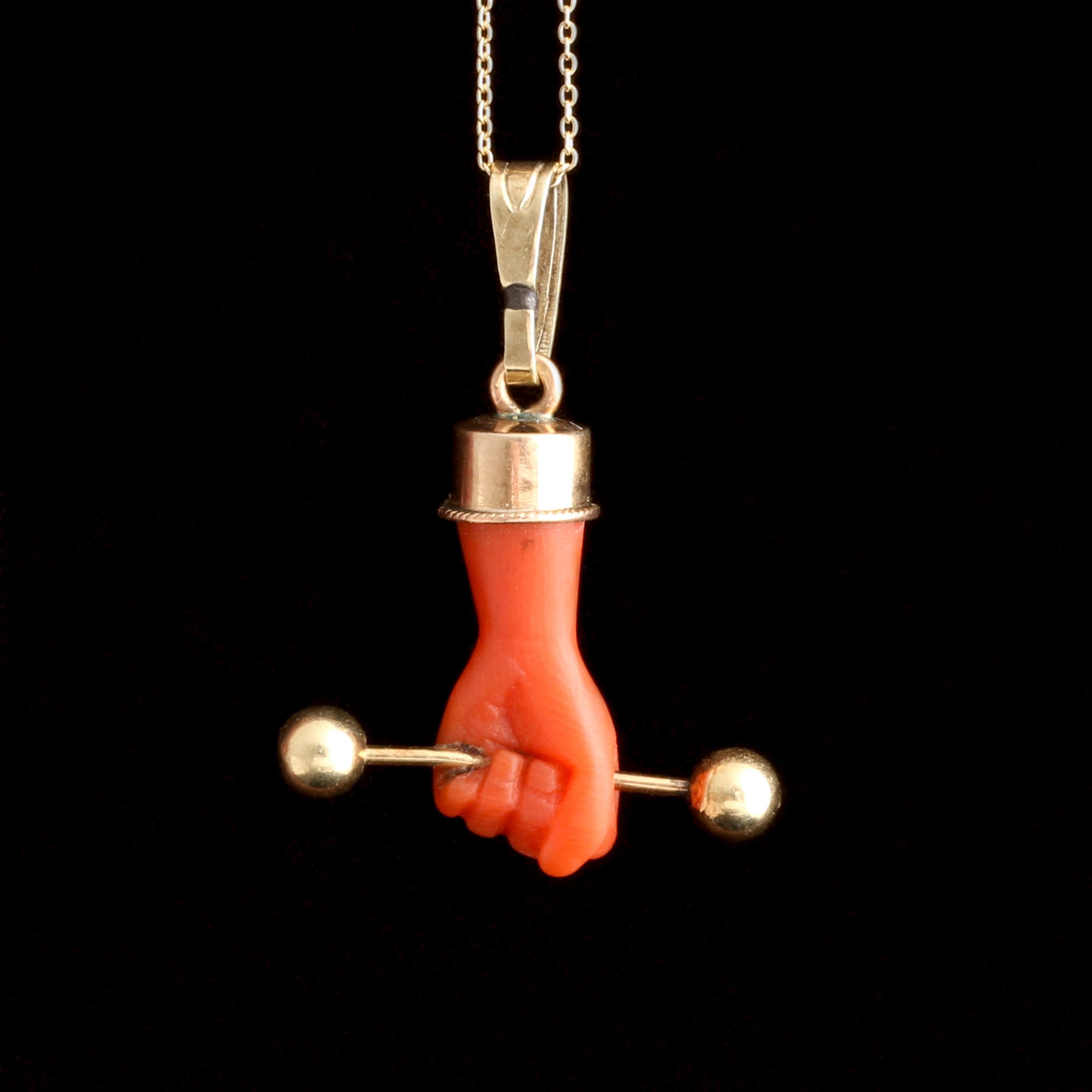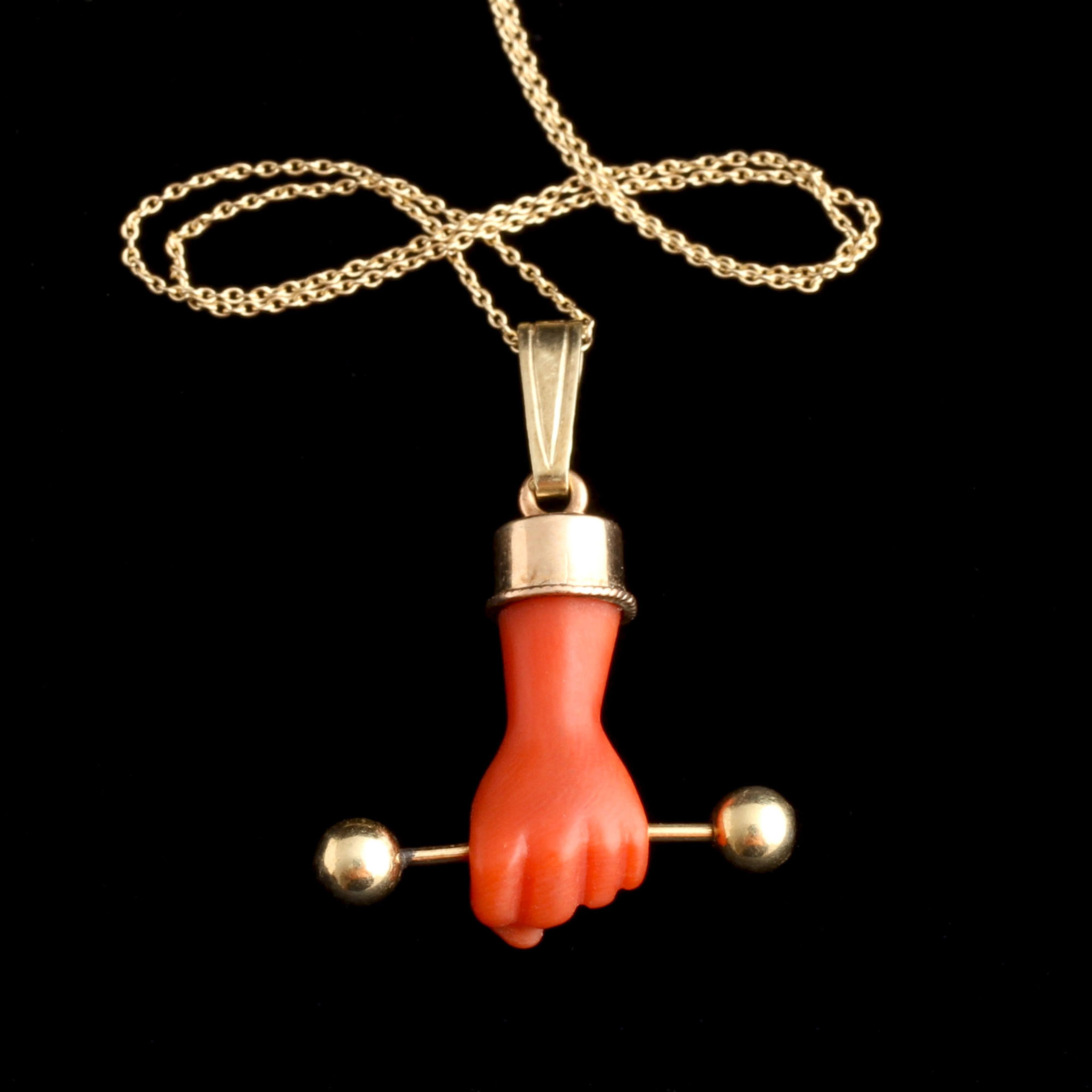 In Ancient Rome, a branch of coral worn around the neck was believed to shield the wearer from harm. Similarly, the Ancient Greeks thought that coral could reverse the ill effects of poisoning and evil spells. Coral, one of the most valuable of the organic gemstones, has been regarded as a sacred gem with talismanic properties across many cultures and even more centuries. In the mid 19th century, Italian jewelry-carvers used the gem as a medium to create cameos and miniatures like this coral fist as souvenirs for upper class Brits to buy while on the Grand Tour.