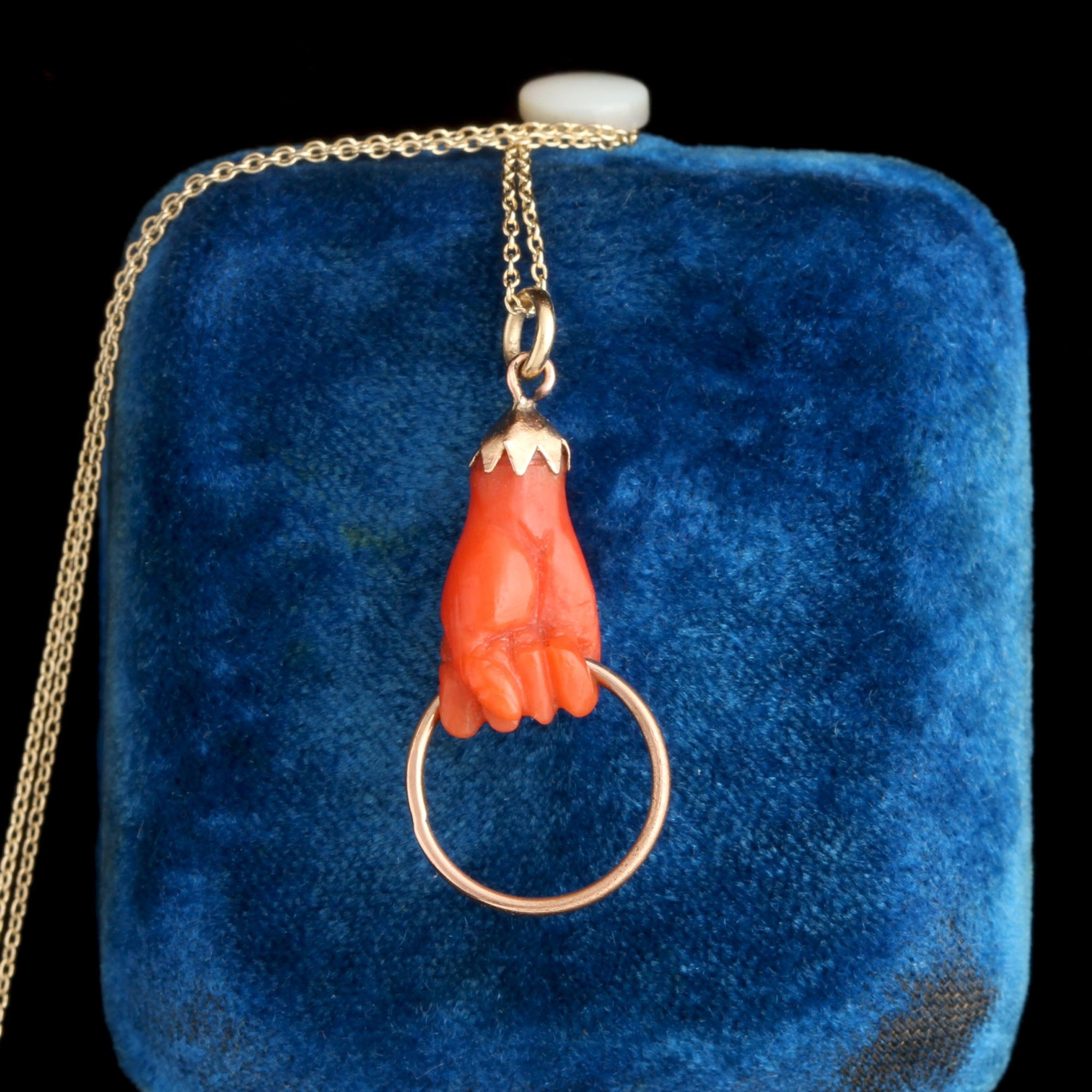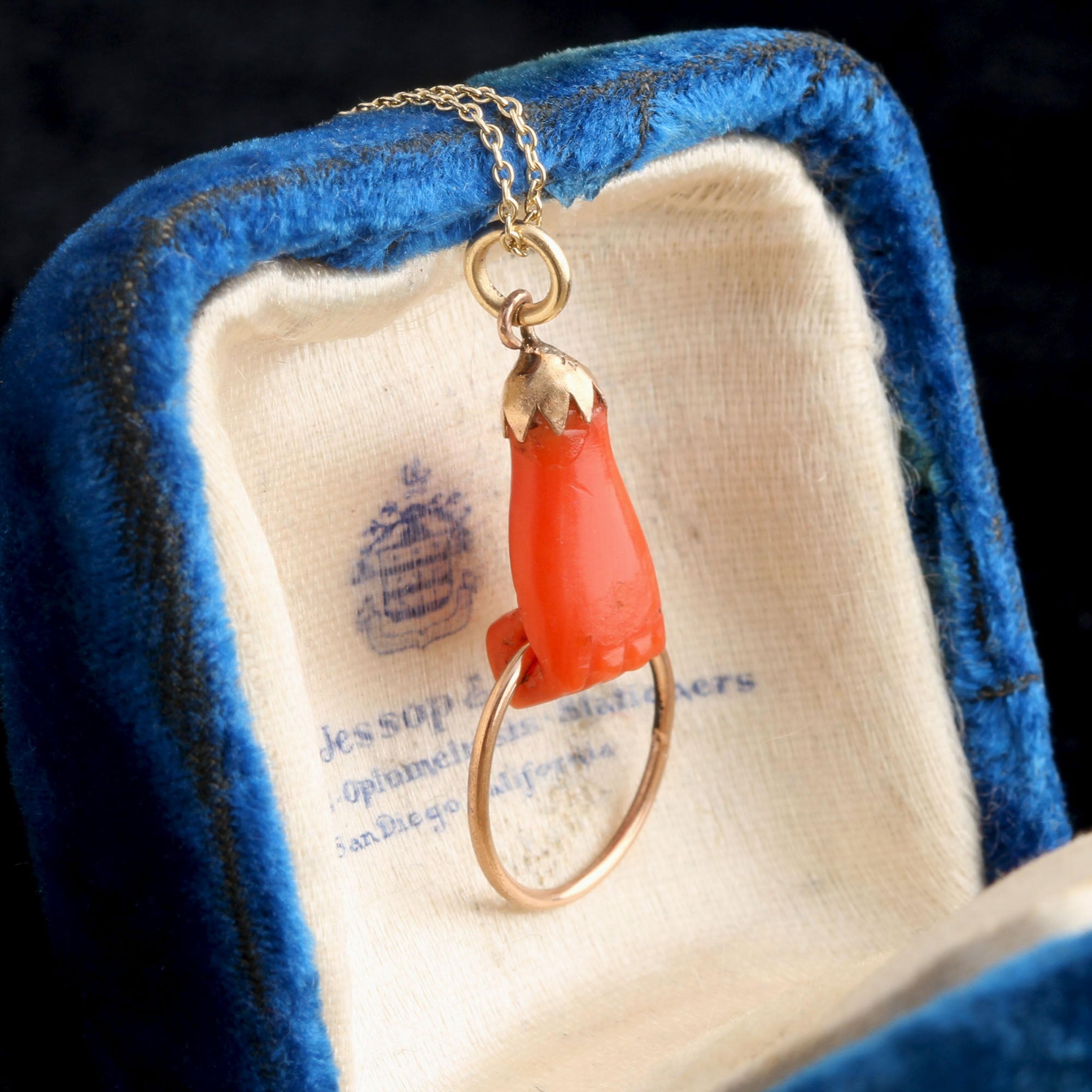 In Ancient Rome, a branch of coral worn around the neck was believed to shield the wearer from harm. Similarly, the Ancient Greeks thought that coral could reverse the ill effects of poisoning and evil spells. Coral, one of the most valuable of the organic gemstones, has been regarded as a sacred gem with talismanic properties across many cultures and even more centuries. In the mid 19th century, Italian jewelry-carvers used the gem as a medium to create cameos and miniatures like this coral fist grasping a ring as souvenirs for upper class Brits to buy while on the Grand Tour.