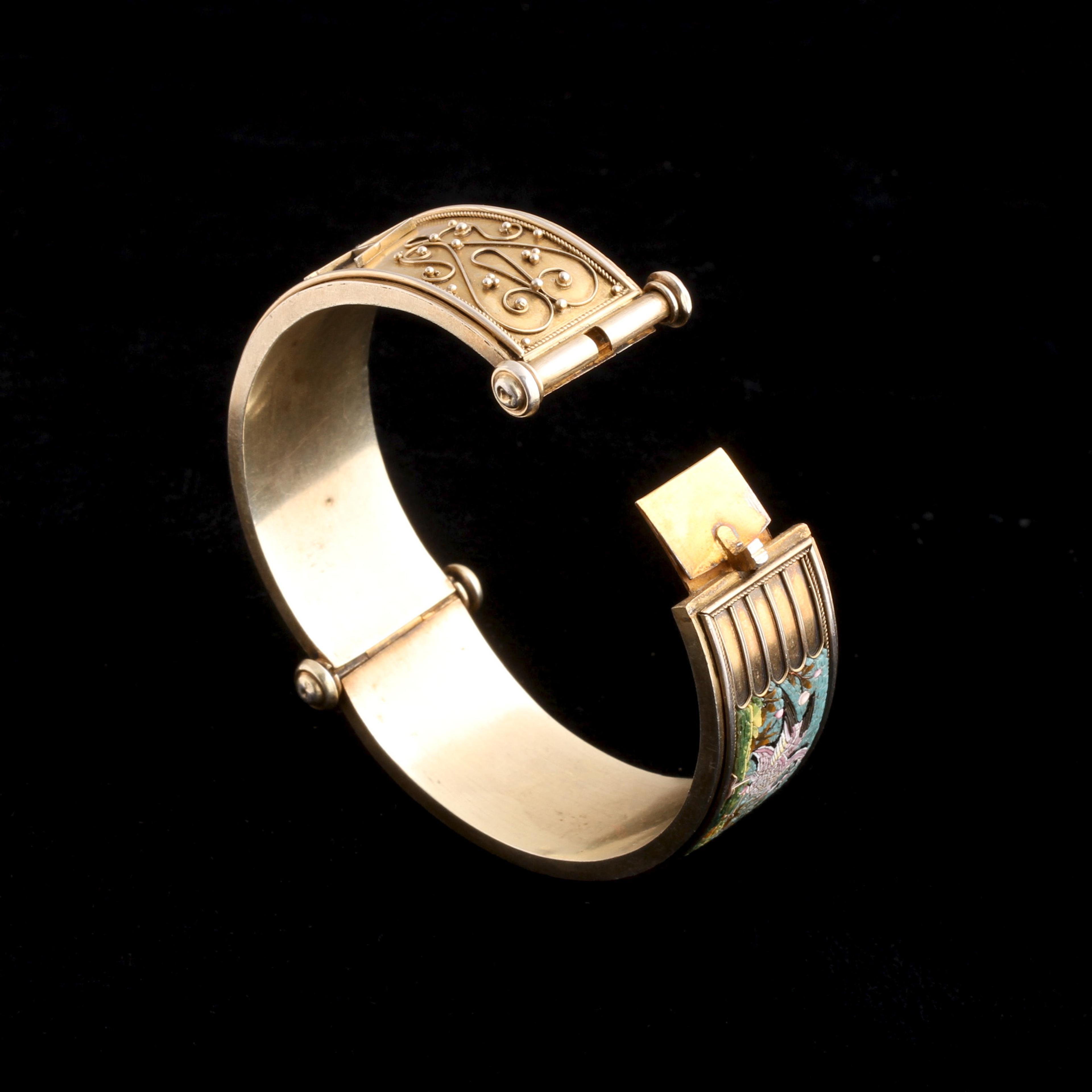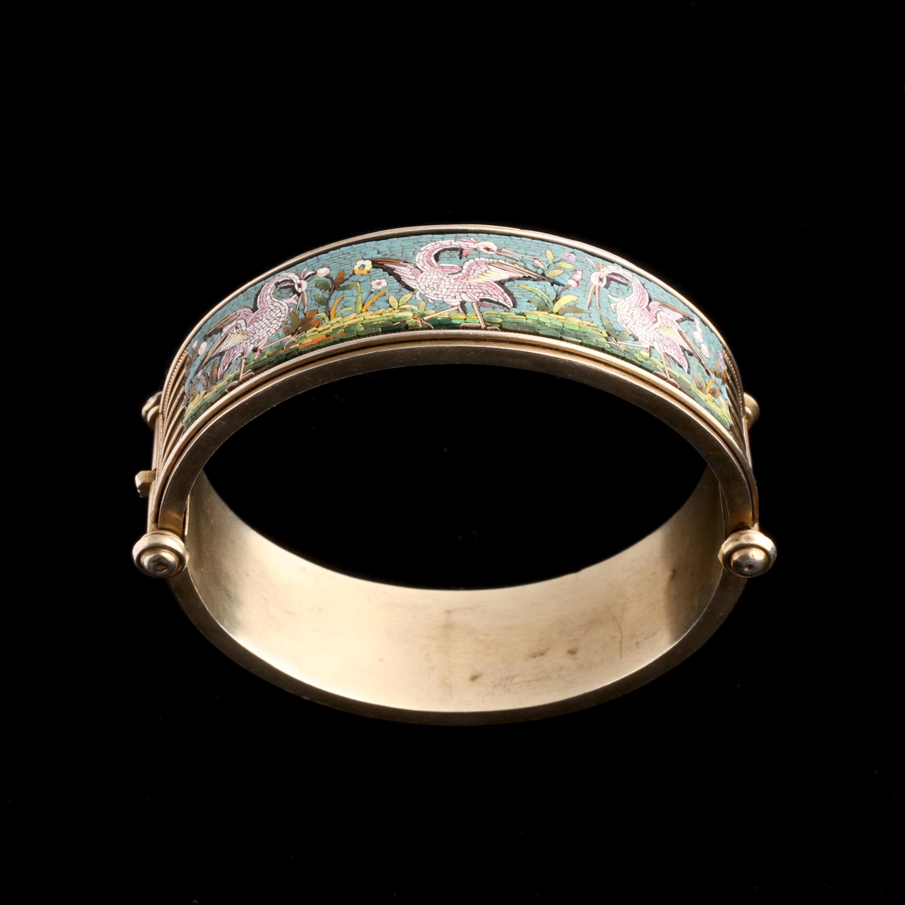 The bangle isn't gold, it's gilt silver. But the treasure here is the glass tesserae. On the reverse, ROMA: proof to your Victorian-era friends that you had seen the sights in Rome on the Grand Tour. Neoclassical scroll-shaped hinges.