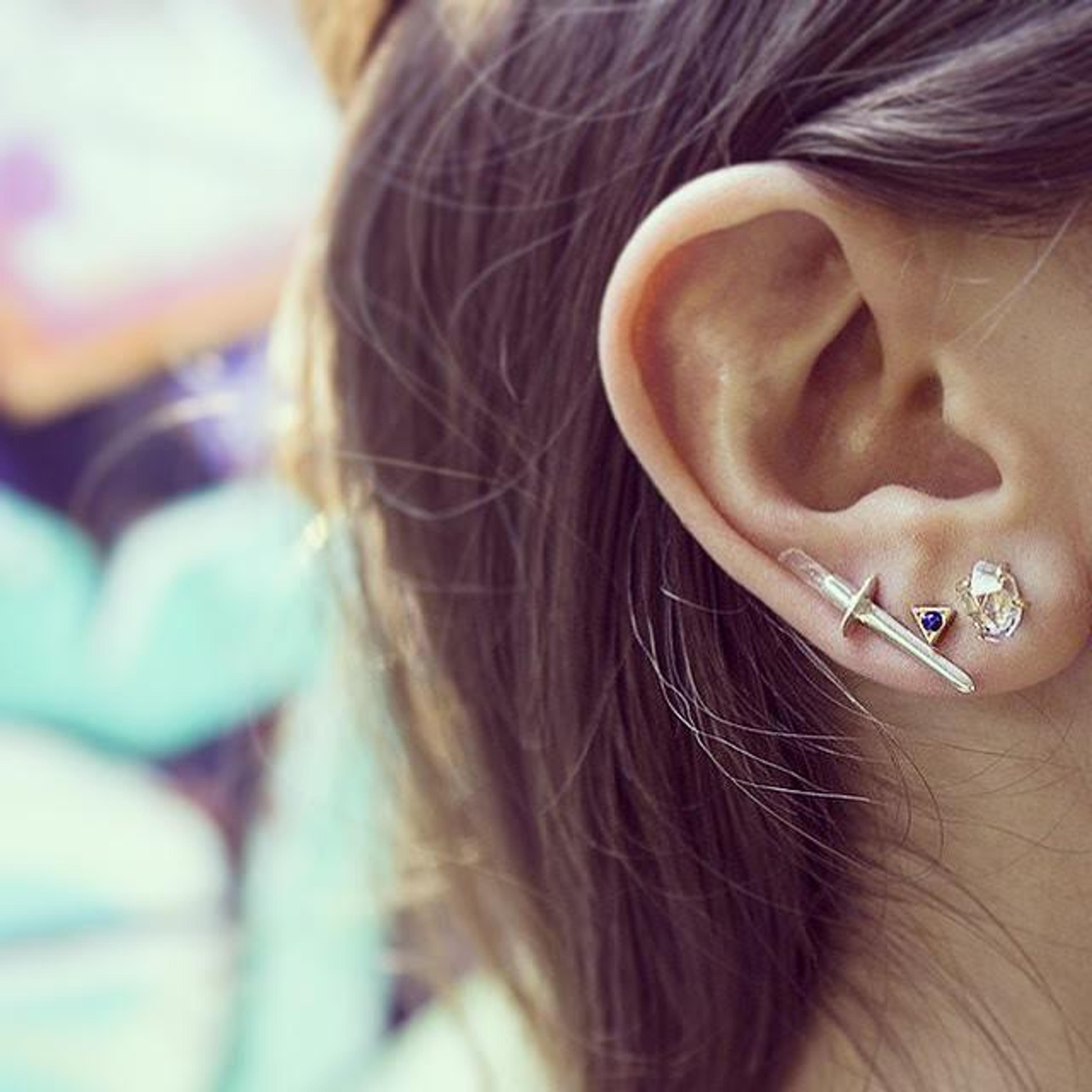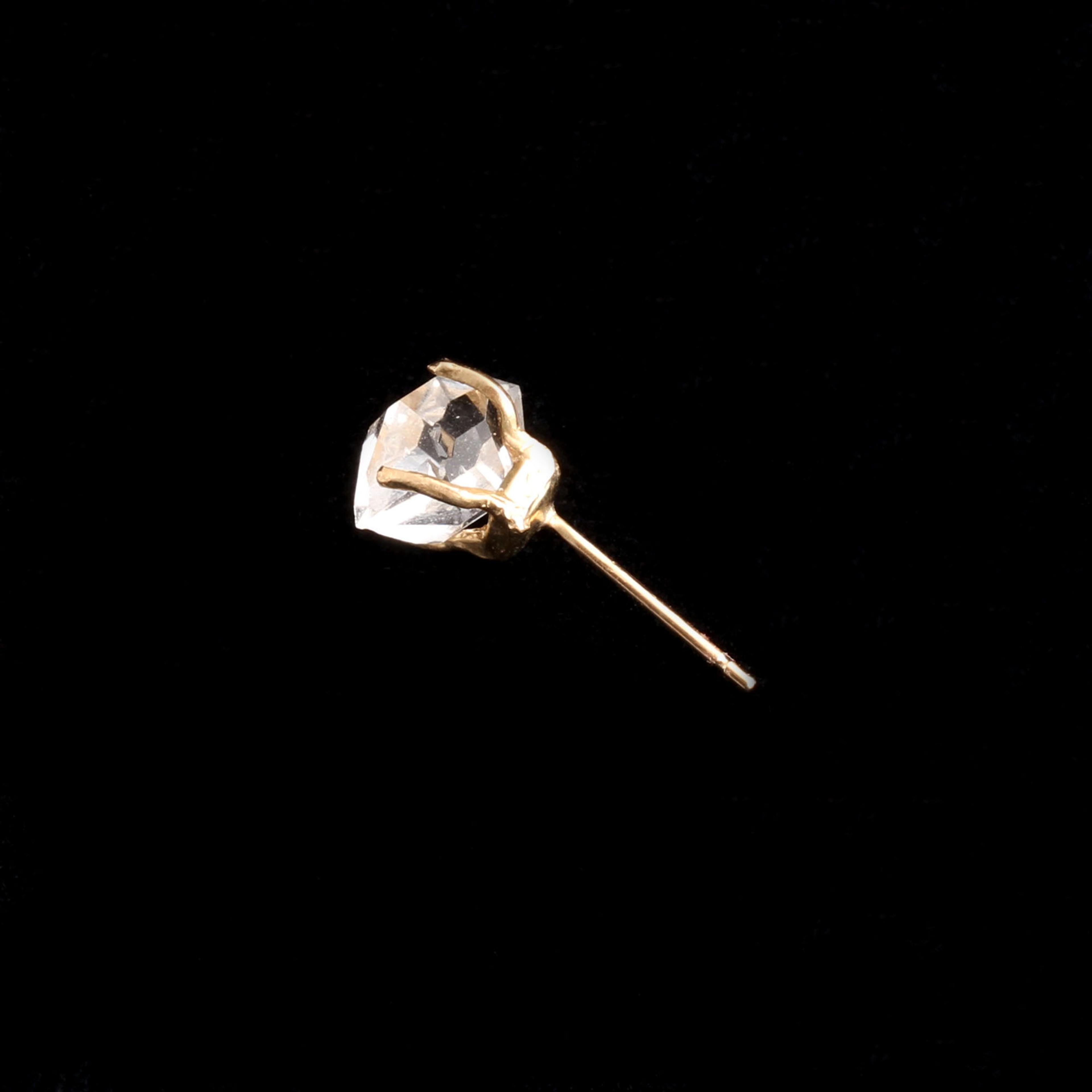 Despite their diamond misnomer, Herkimers are six-sided, double-terminated quartz crystals and are relatively valueless. Unscrupulous jewelers during the Civil War often tried to pass them off as the more precious variety. In our take on classic diamond solitaire studs, the Herkimers are gripped in hand-hewn 10k gold settings. Every unique stone is chosen and set by hand; expect yours to have irregularities like cracks, dark spots, and milky-colored mineral impurities. Please note: earrings are sold singly.