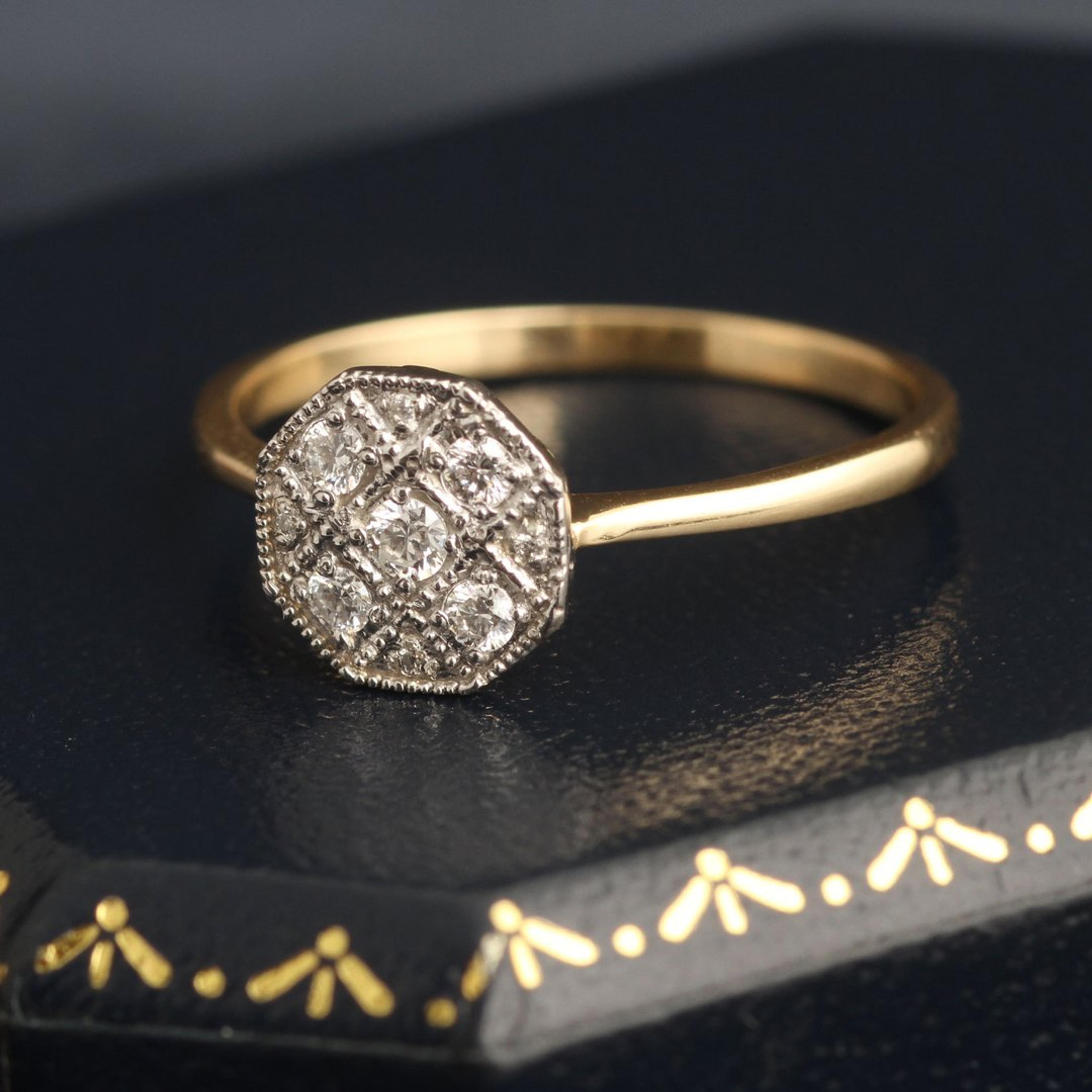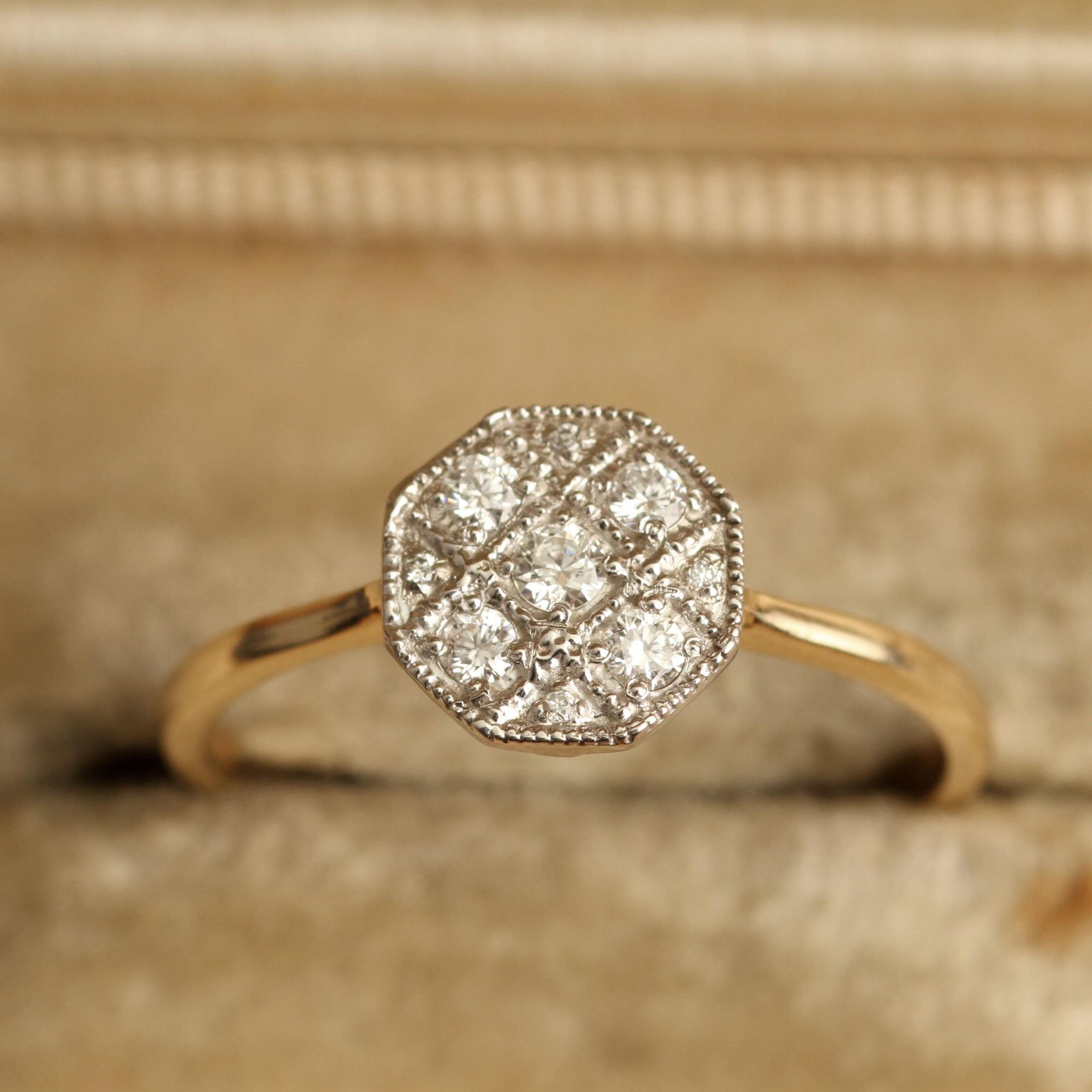 One of our very favorite rings from the Jazz Age served as the inspiration for this piece. Behind the nine diamonds, hidden from view, is a flower-shaped decorative mount which allows light to blast through to the stones. Streamlined and modern with a low profile for easy wear.