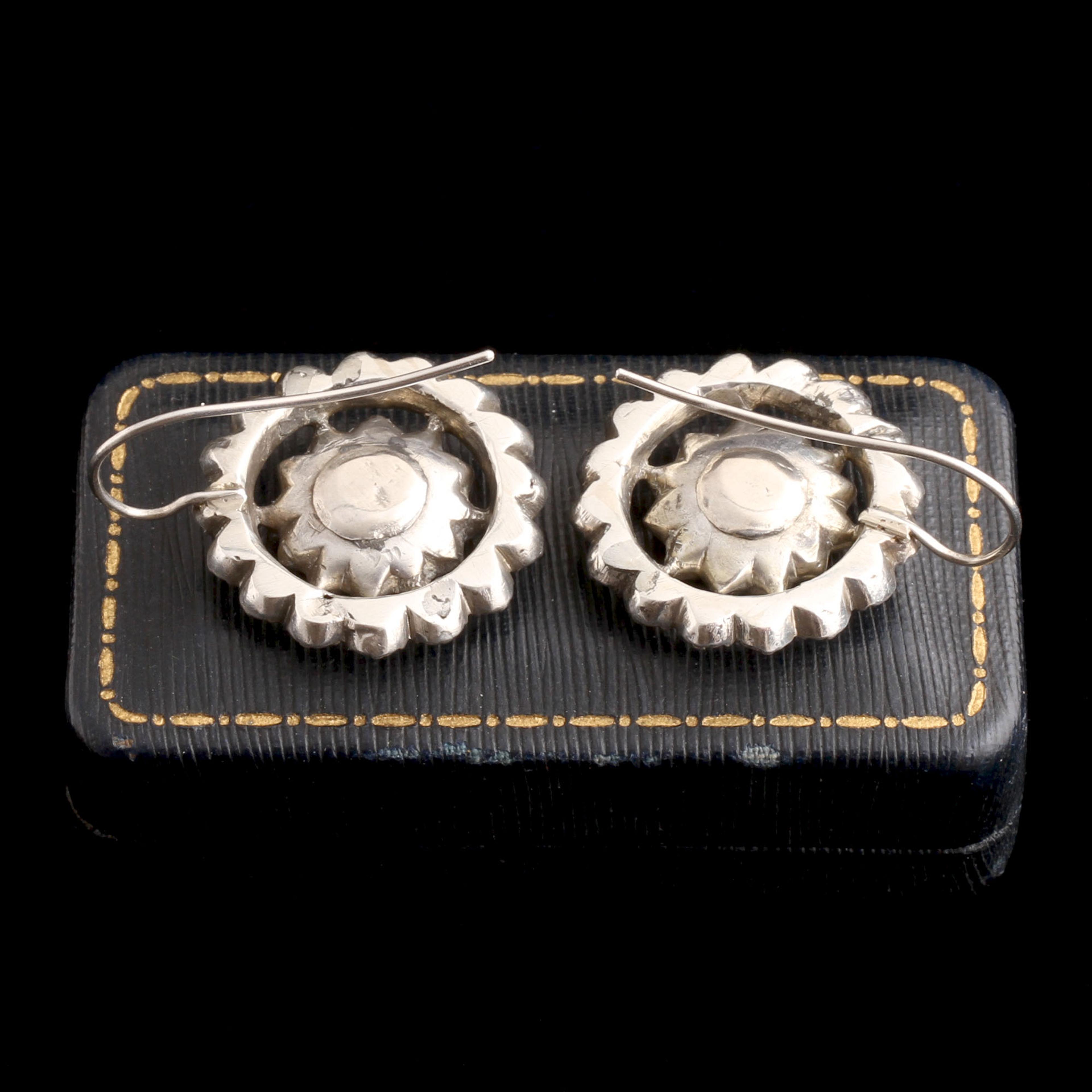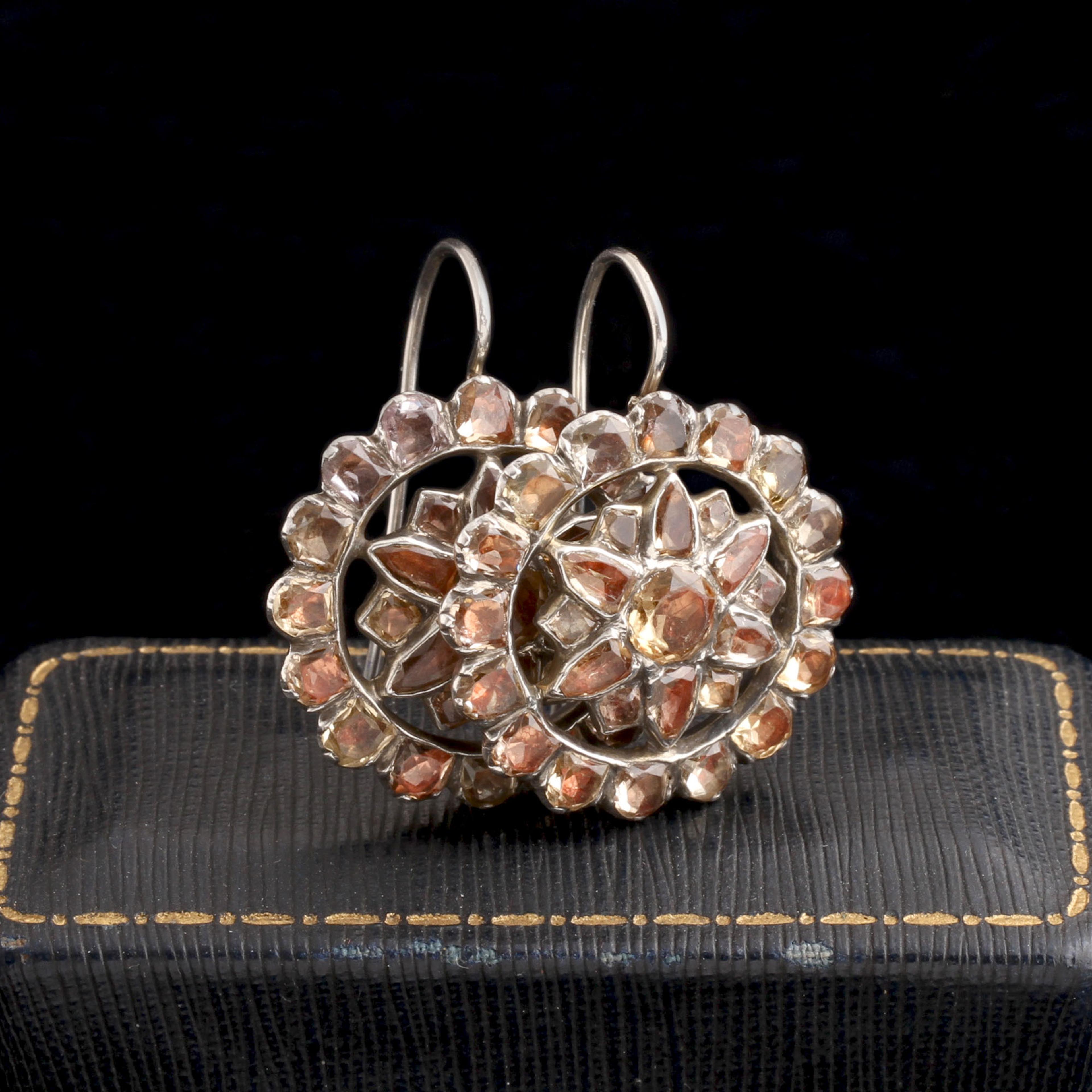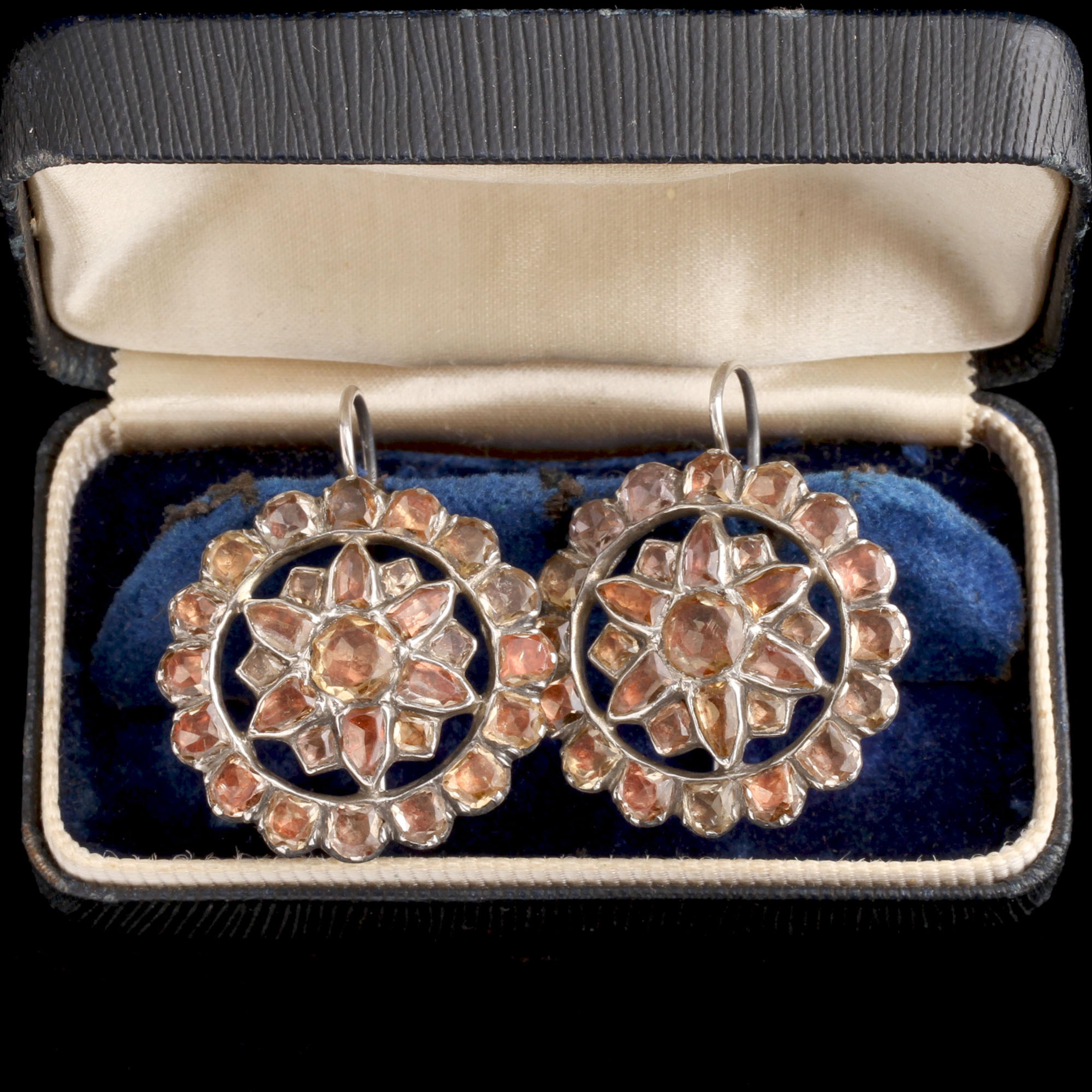 THESE CLUSTER earrings are a fine example of late 18th-century Iberian jewelry, made in silver and set with richly hued topaz. The faceted stones are arranged in tight concentric rosettes—an arrangement typical of Portuguese and Spanish work from this era, when regional artisans developed their own distinctive style apart from the rest of Europe. In the Iberian Peninsula, topaz was prized not only for its brilliance but also for its symbolic power. The golden stone was thought to bestow strength, dispel enchantments, and attract favor from both earthly and divine forces. Wealthy patrons and aristocrats favored topaz over diamonds for its warmth and depth, and Portuguese mines (and later Brazilian ones) provided an abundant local source.