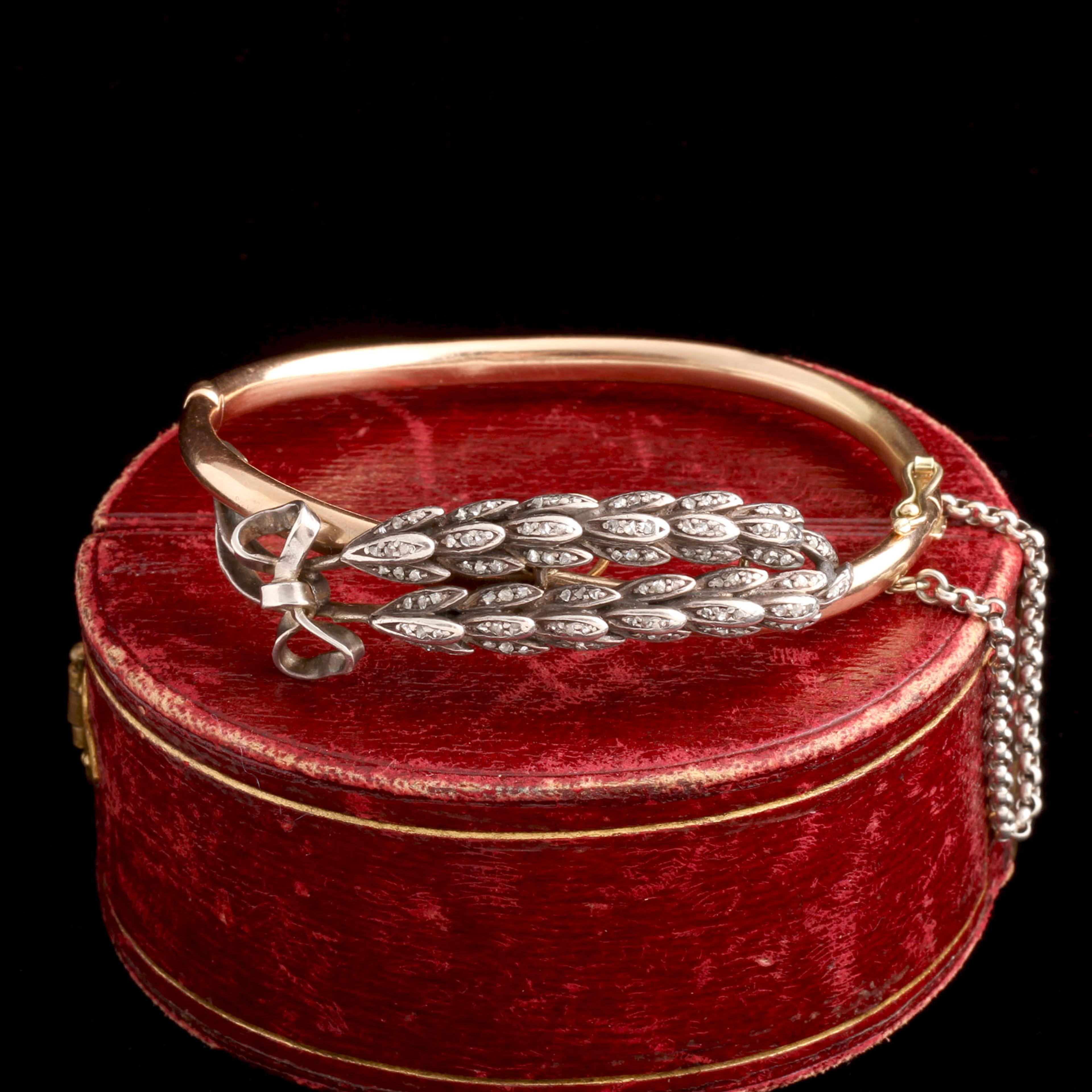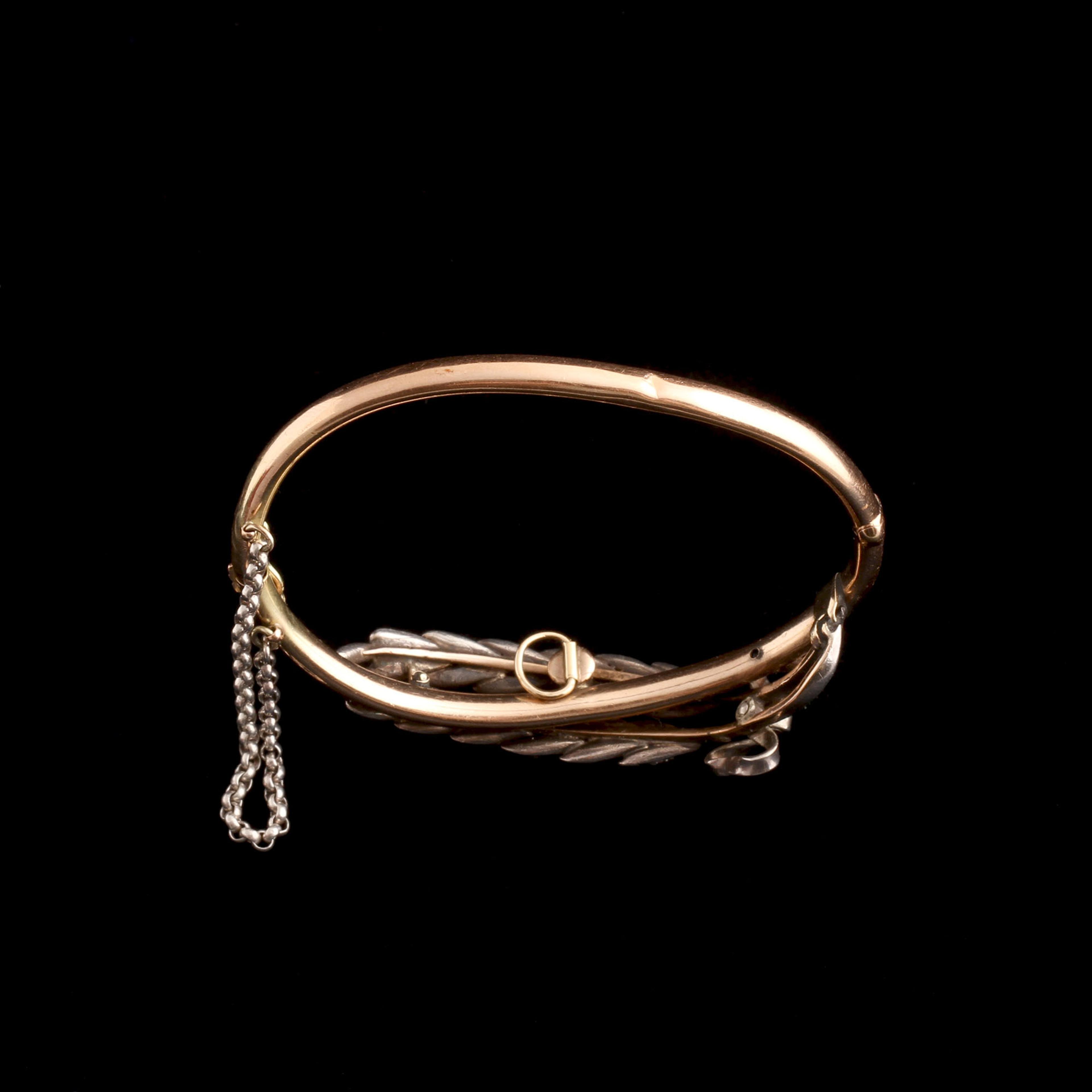 WHEAT HAS BEEN a symbol of abundance and fertility for eons, with deep roots in Christian imagery as well. This diamond-studded sheaf was once designed to be removed from the bangle and fitted onto another mount - a tiara? A comb? A brooch? Were there many wheat sheaves that could be combined into a majestic headpiece? Long ago, the other components were lost and the screw mechanism was permanently soldered, fixing the wheat to this gold bangle.