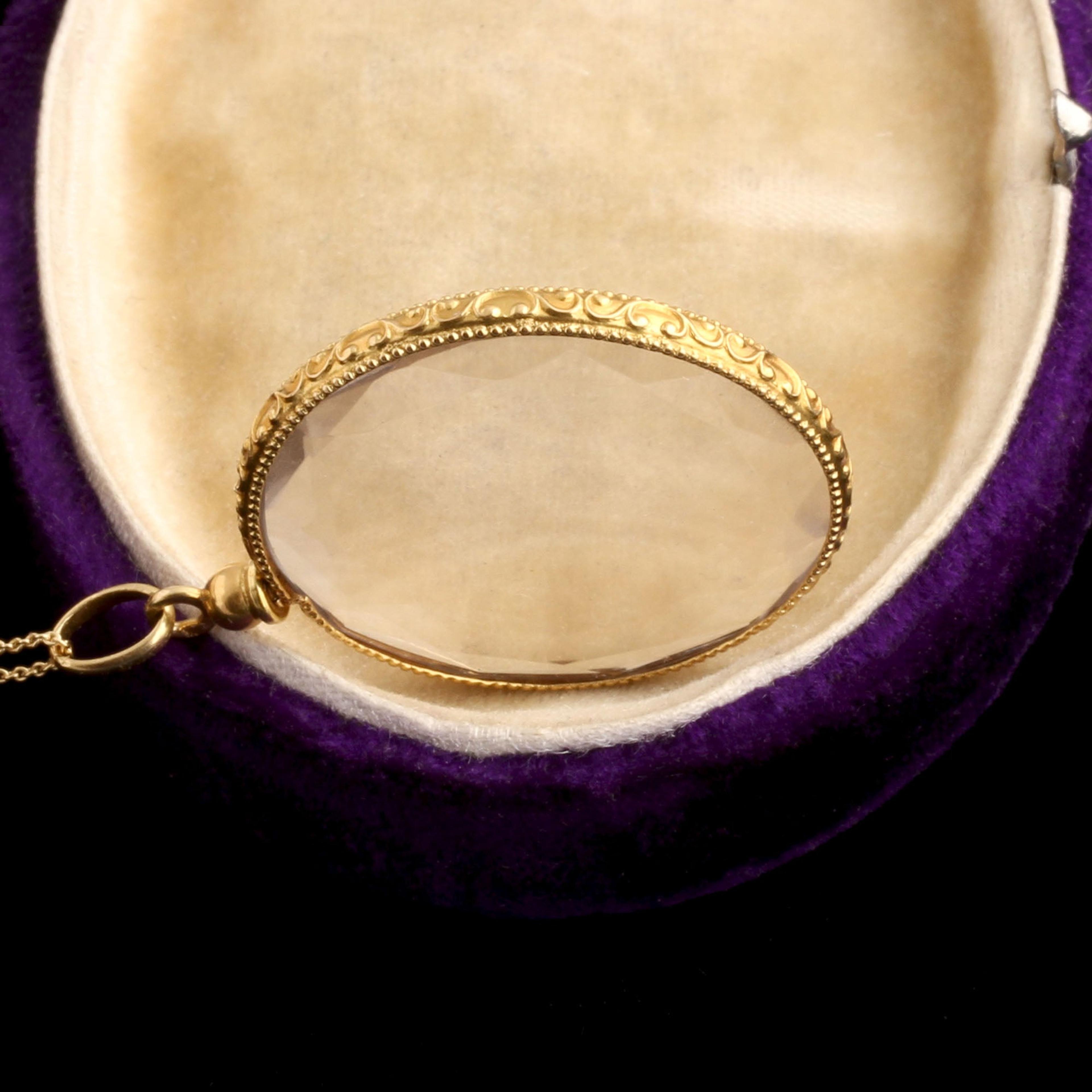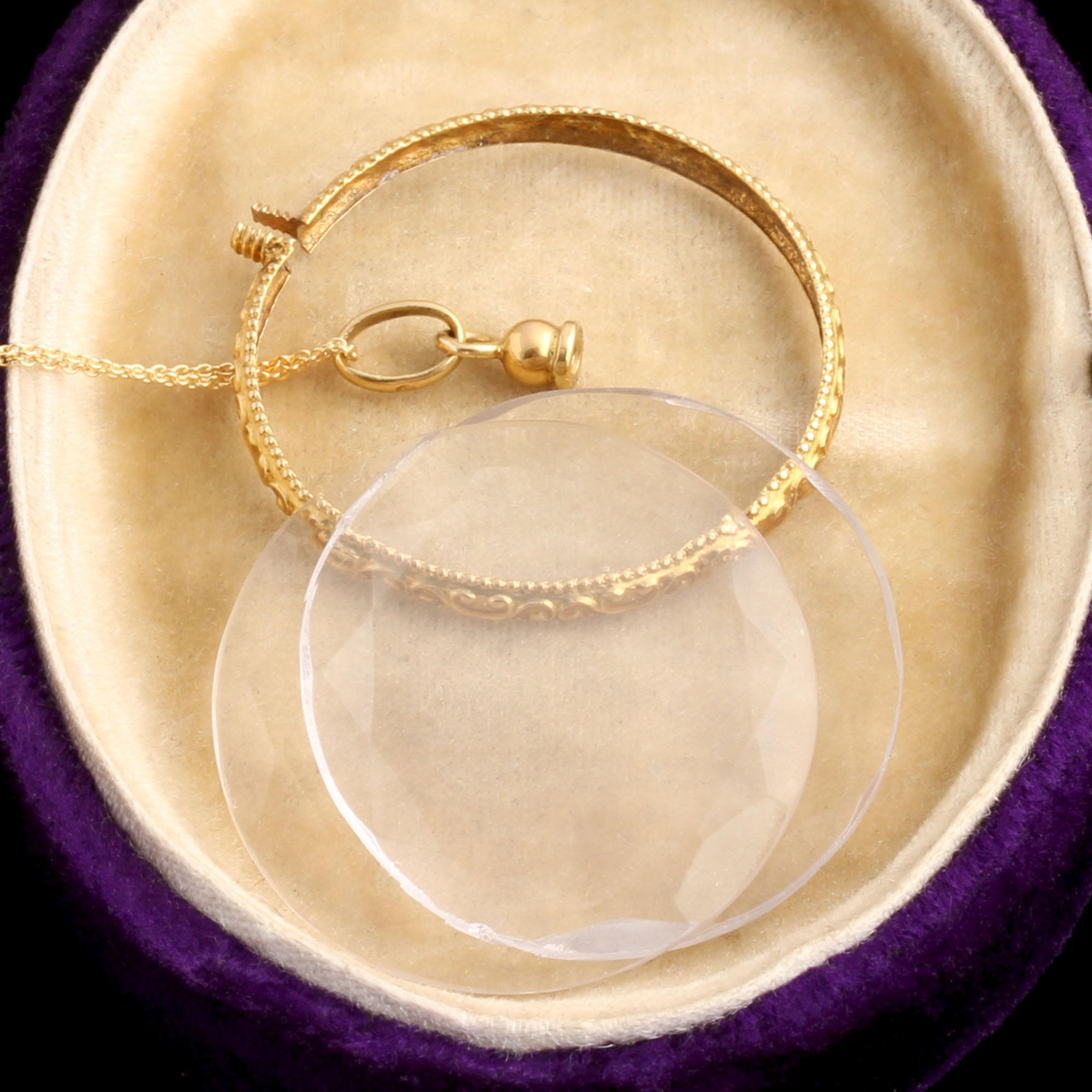 An elegant photo locket with faceted glass lenses and a gold frame decorated with a scrolling design and granulated edges. French hallmarks.