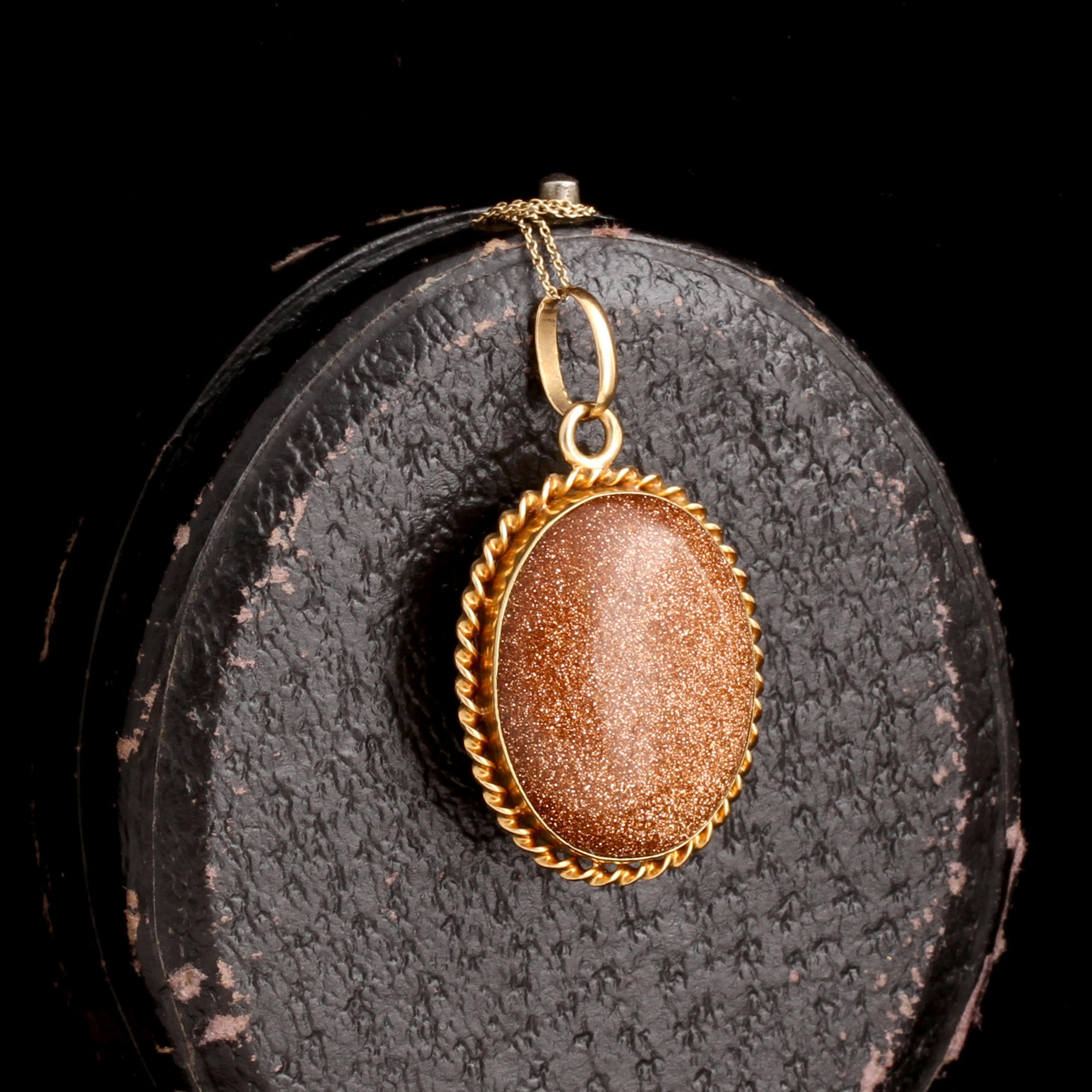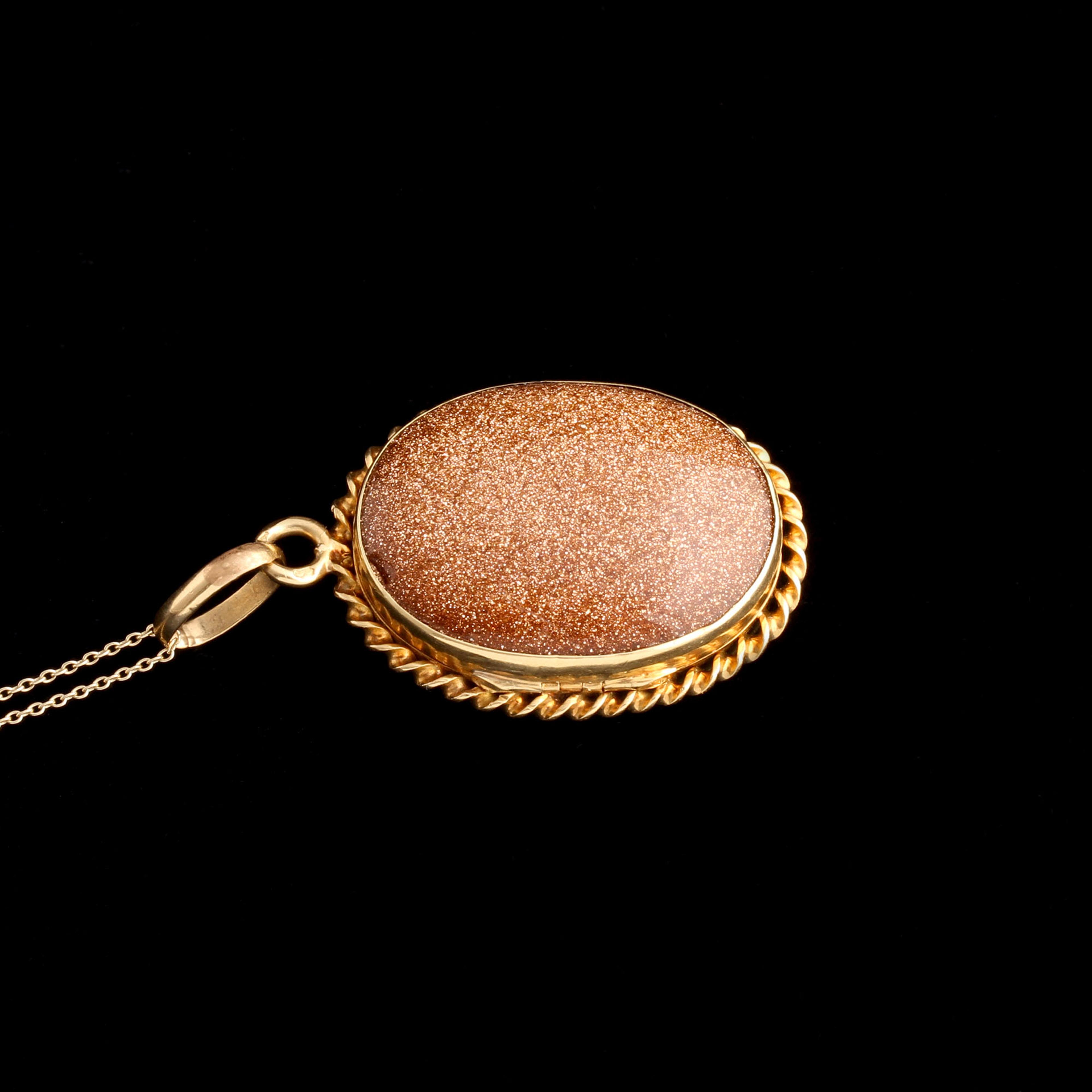 18k gold (marked), goldstone, glass lens, new 14k gold chain
