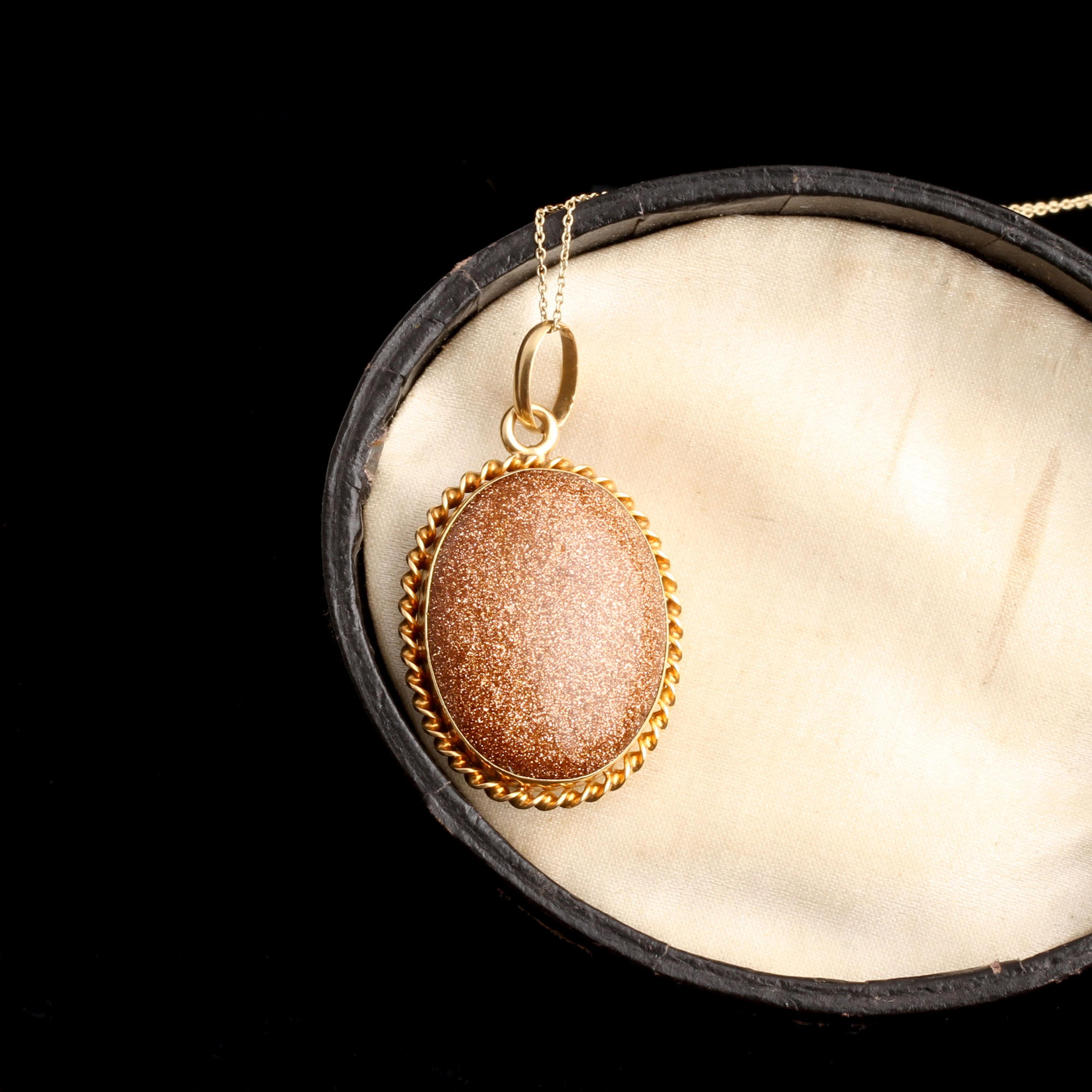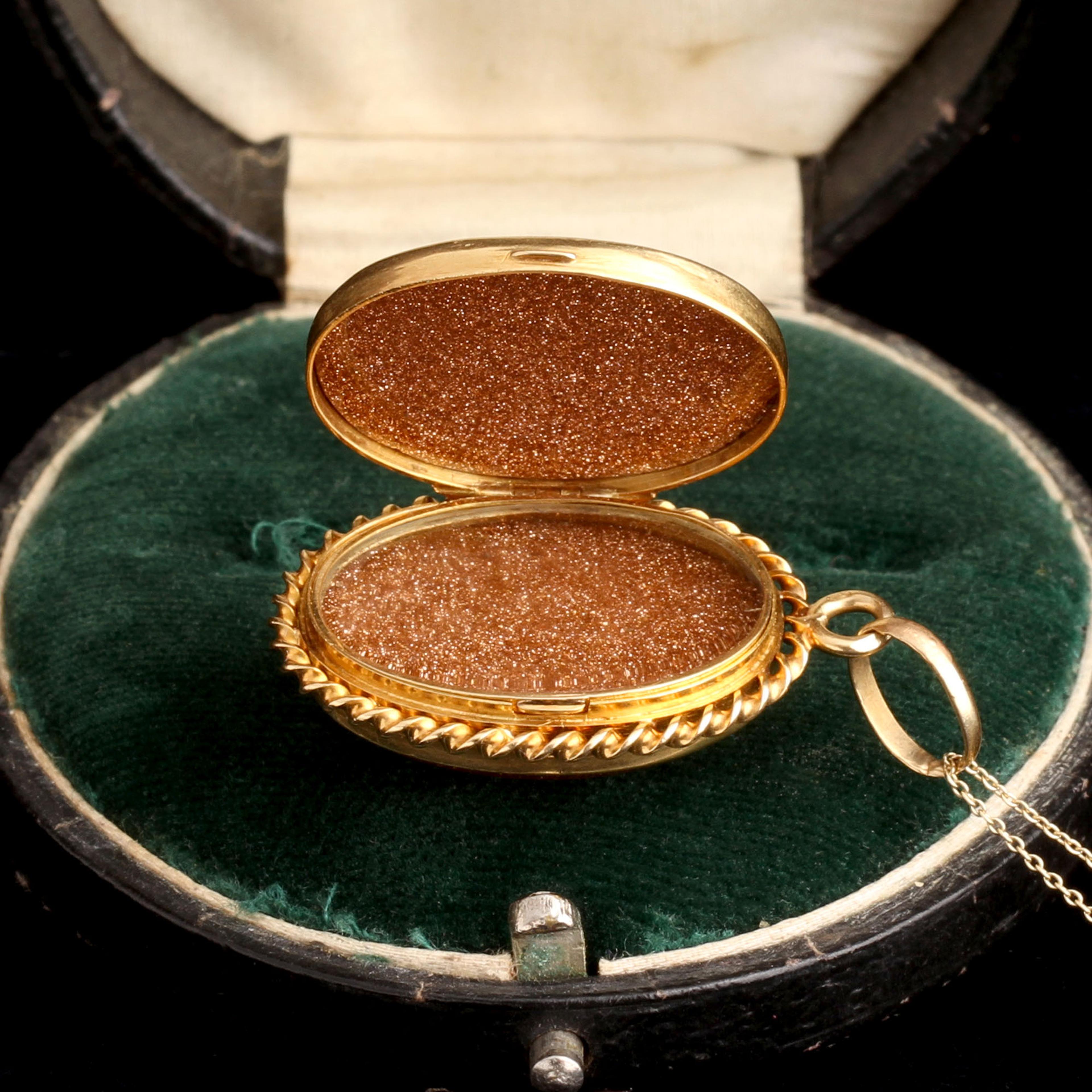 The disco-ball glitter of goldstone (aka adventurine) isn't natural, but man-made by mixing glass with tiny copper crystals in a low-oxygen furnace. The Victorians loved it. Here, a French-made 18k gold locket has room for multiple photos.