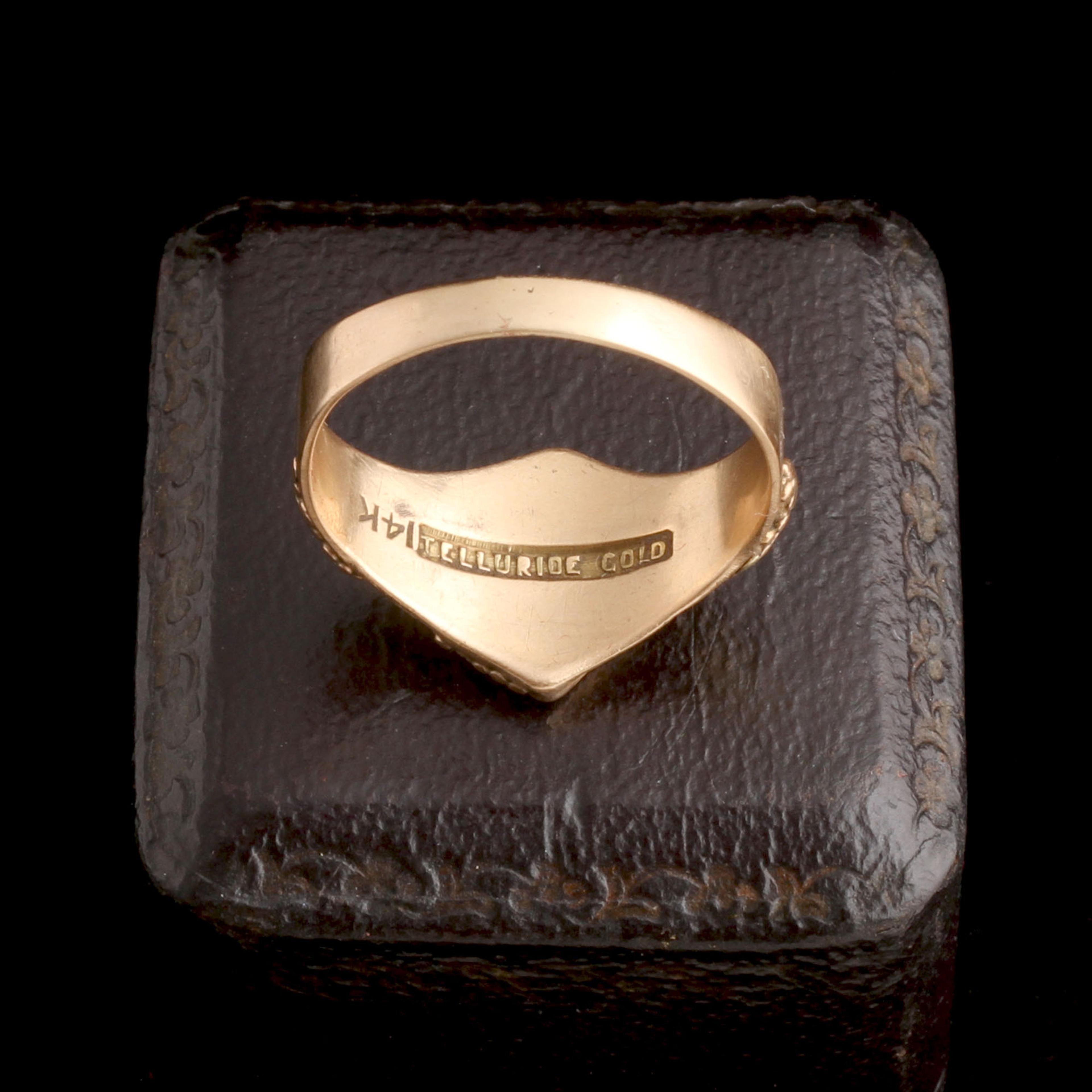 This ring pairs a crisp square of gold-in-quartz with grape and leaf shoulders worn smooth from years of wear. The stone carries metallic gold veining typical of the mining regions, and the interior is stamped “Telluride Gold,” a reference to the Colorado boom town whose quartz deposits were prized in the late 19th century. It’s a small frontier specimen turned into a Victorian jewel.