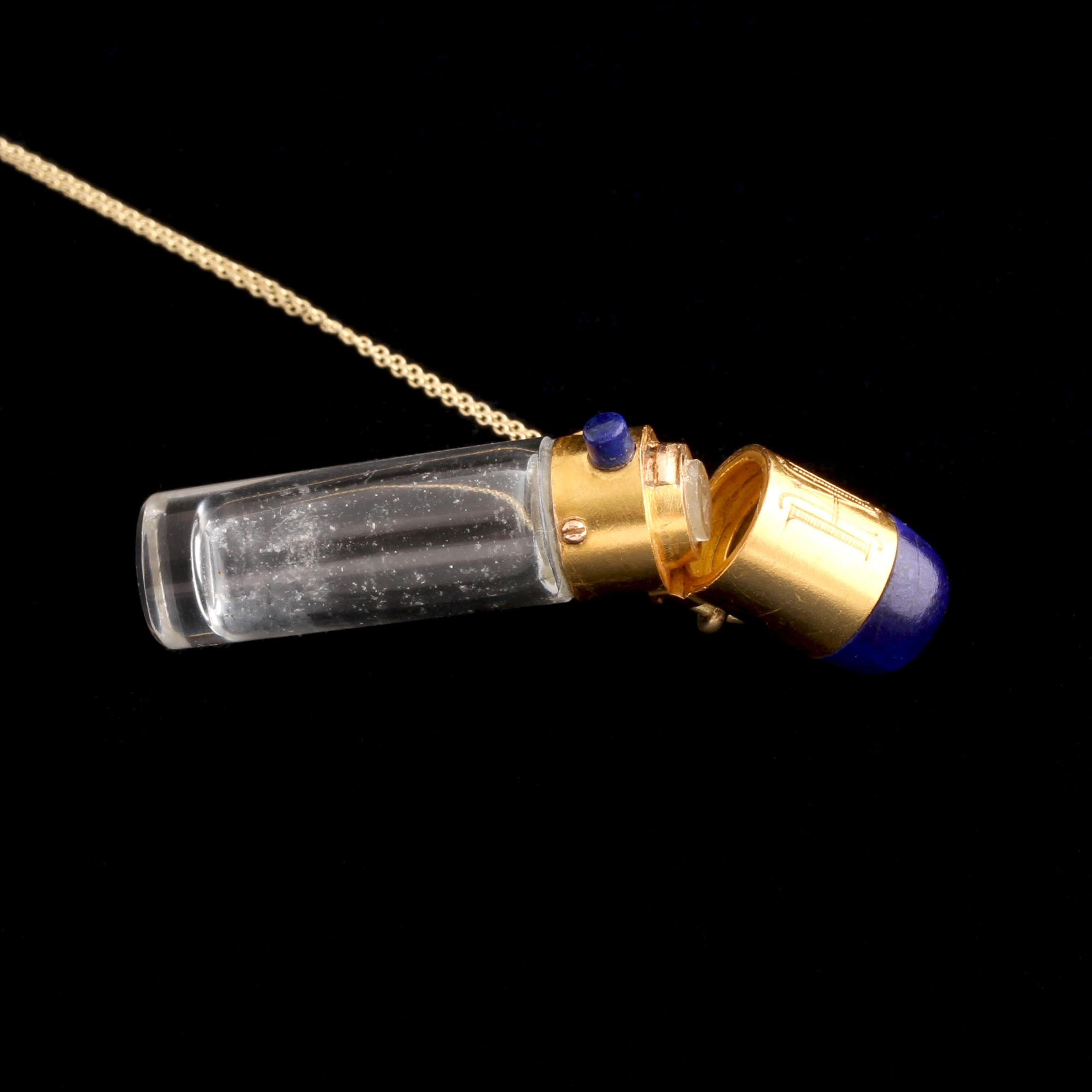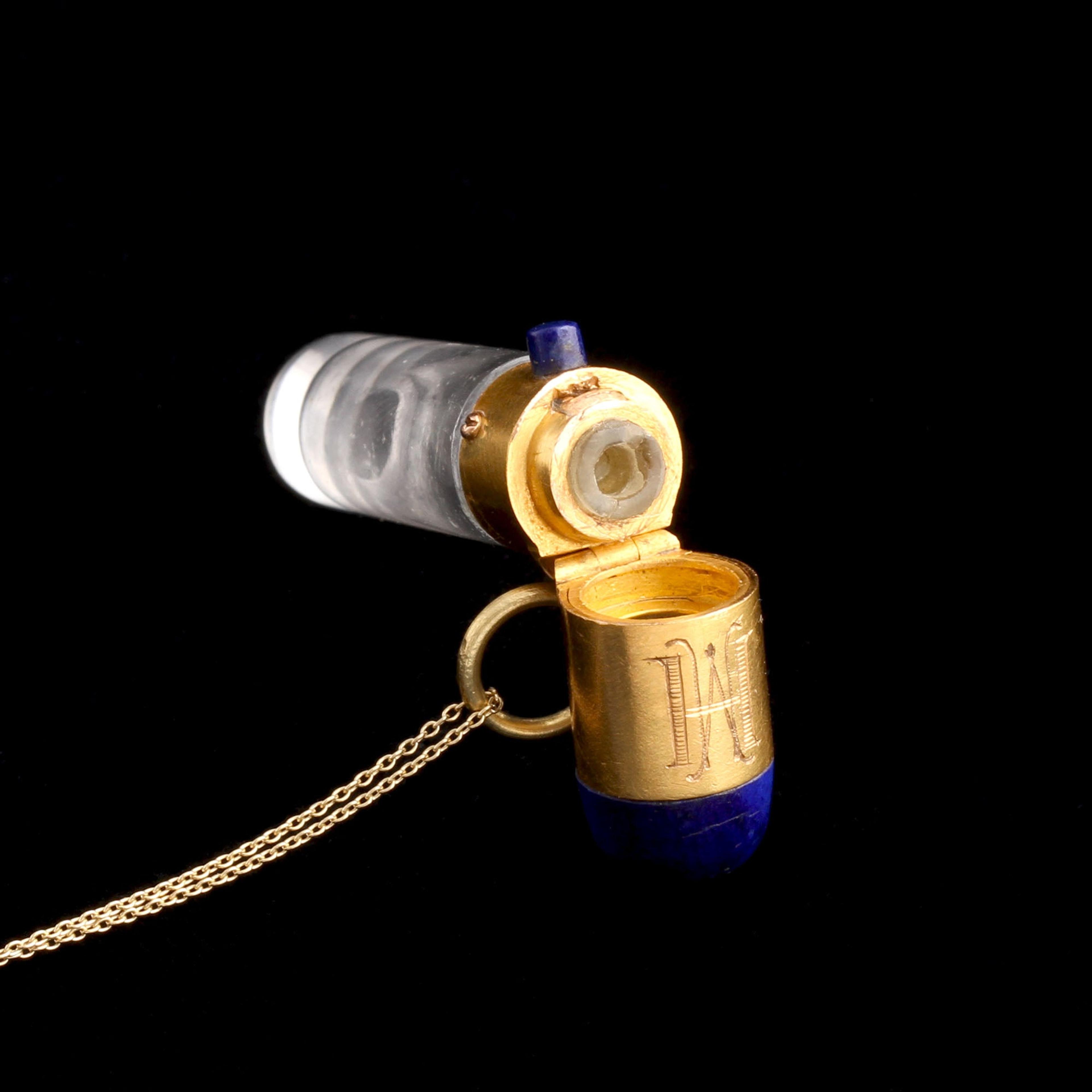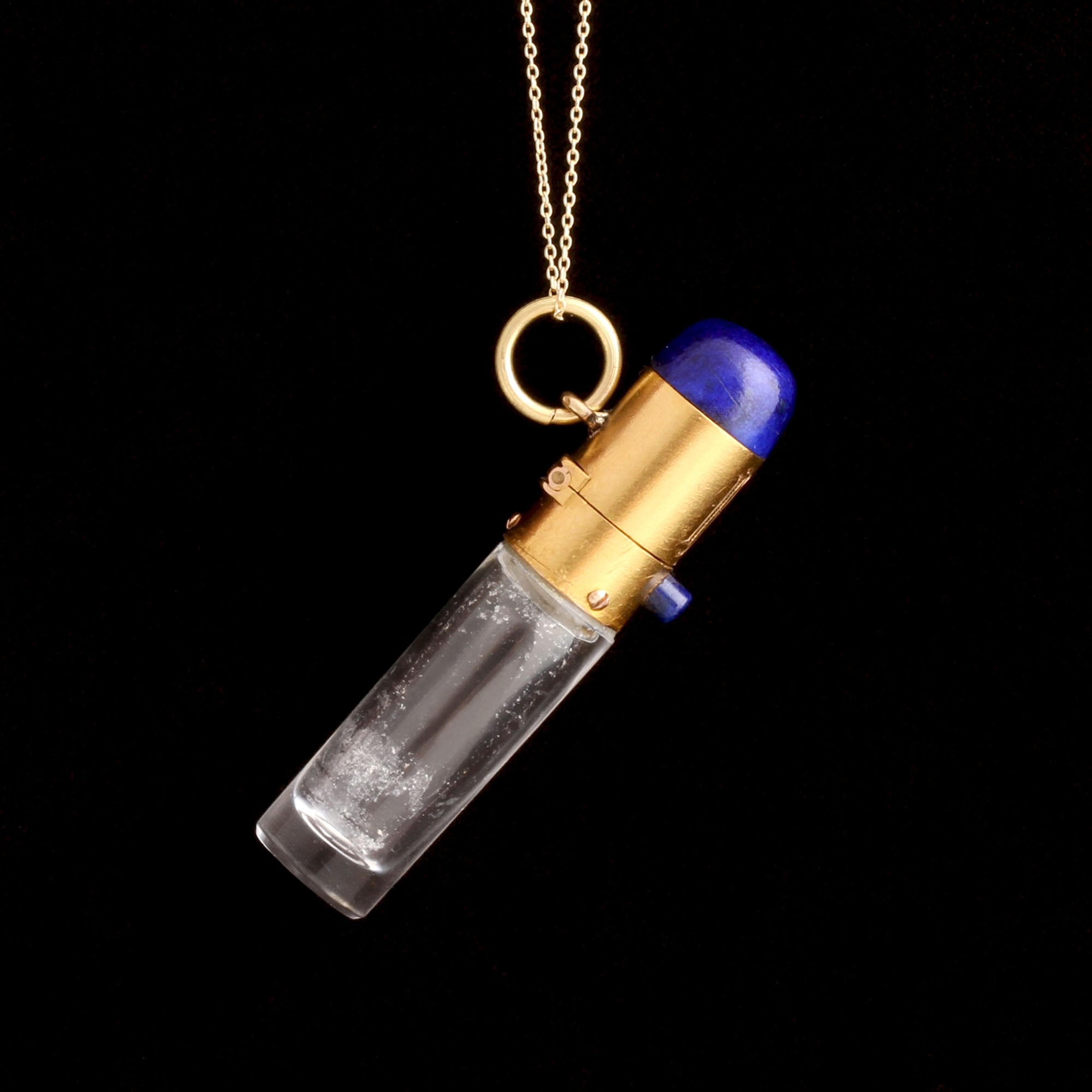 We love a scent bottle, and this one has a lot to love: silky smooth lapis lazuli cabochons - including a button to to click the lid open - and fancy engraved letter "M" (or ""HM?" your choice.)