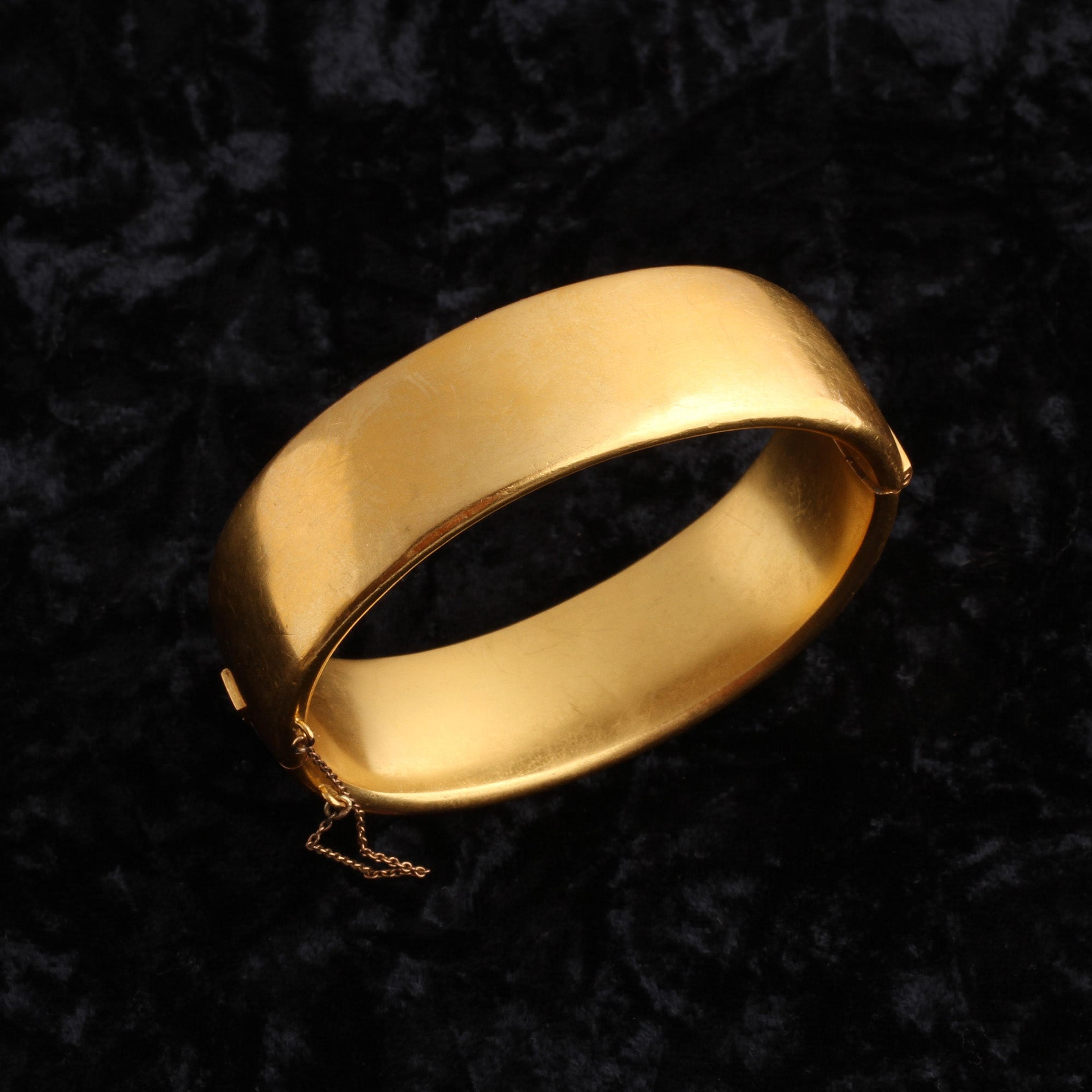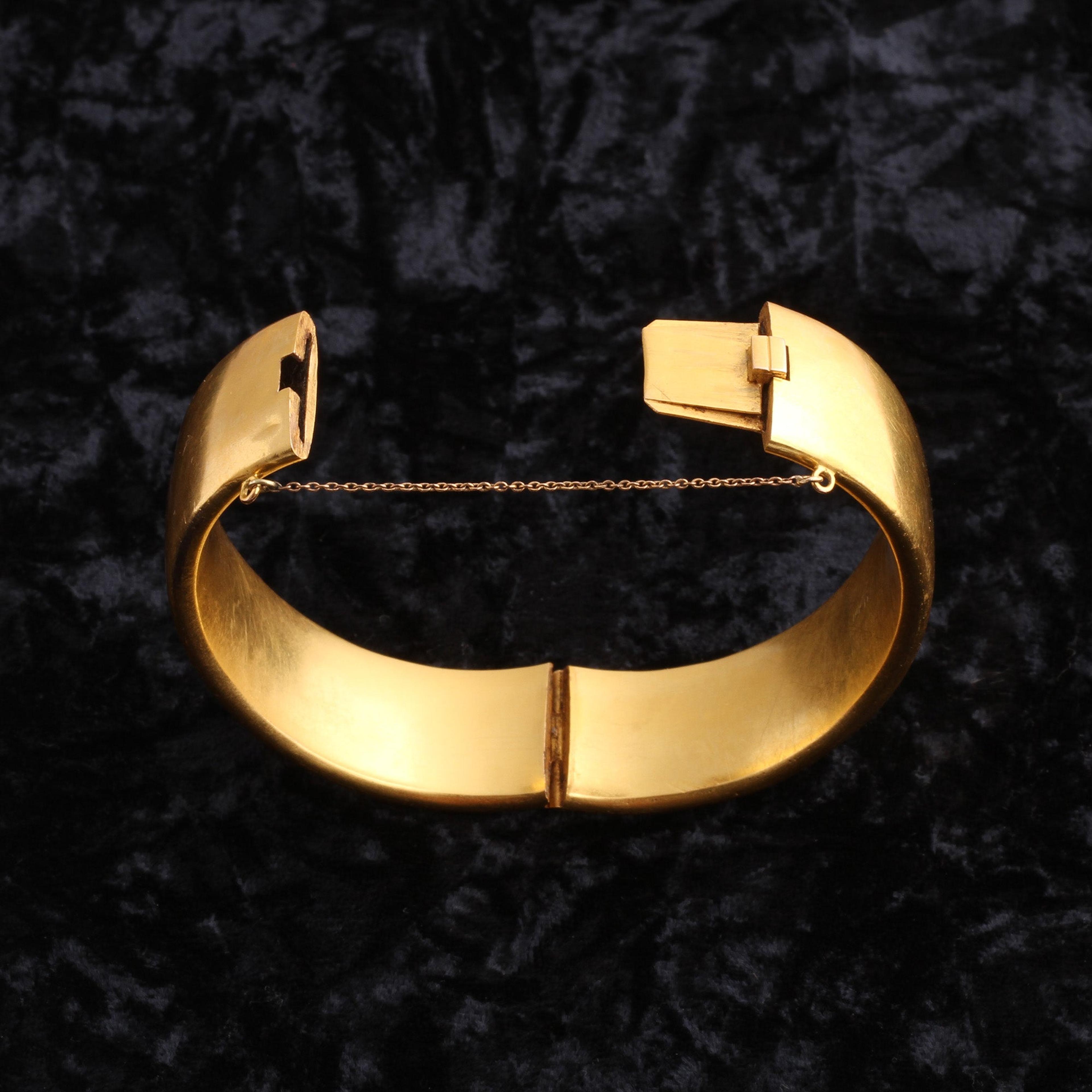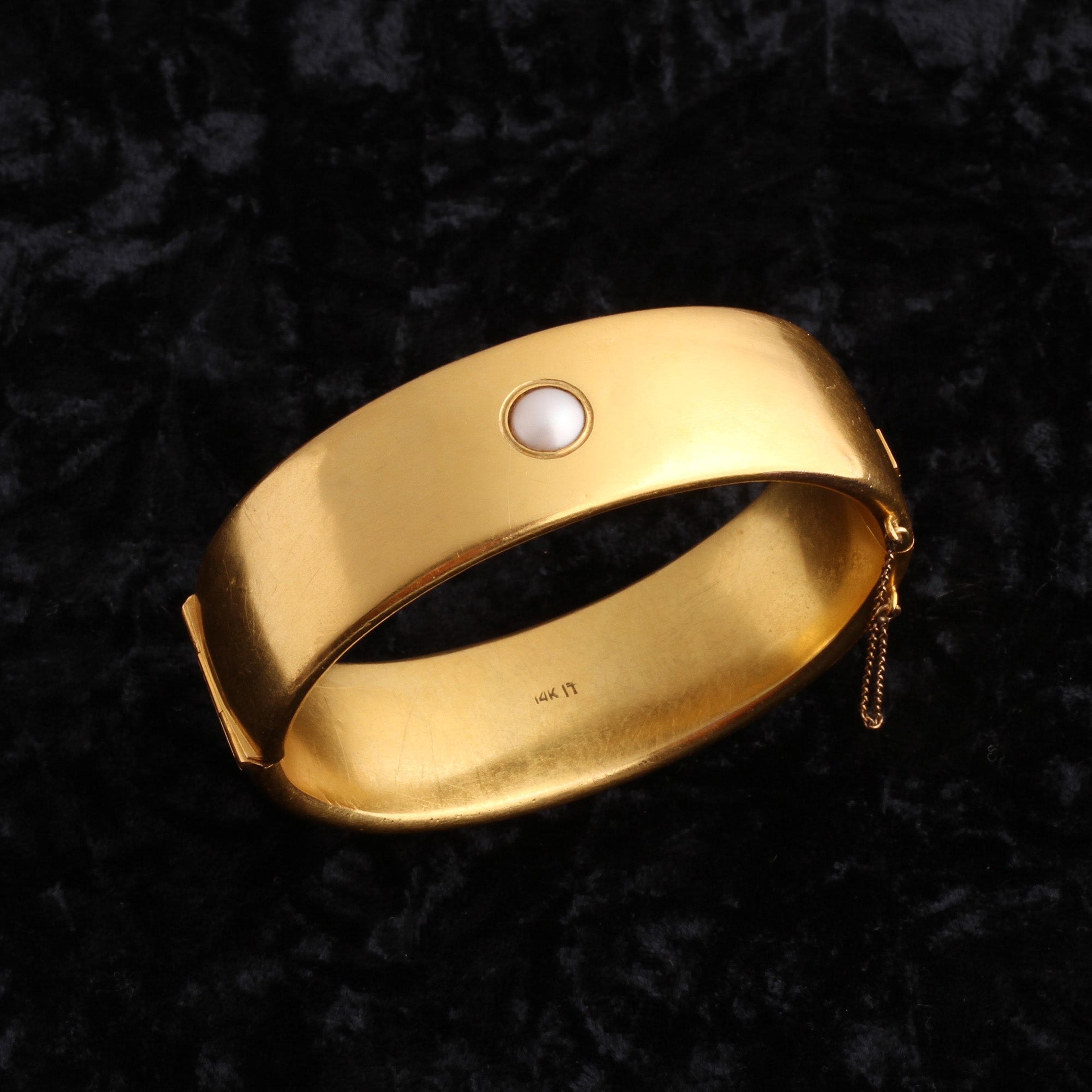 Stunning in its simplicity, this luxe late 19th century bangle is modeled in 14k gold and set with a single 7mm split pearl. The bracelet comes in its original "horse hoof" box which bears the name of the Norwegian jeweler, P. A. Lie, and the city Christiania. In 1624, the city of Oslo was renamed "Christiania" and so it was called until 1877 when the spelling was changed ever so slightly to "Kristiania." This subtle name change is a great help in dating this bracelet, since the city name on the box begins with a "Ch" and not a "K" we know that this piece was made prior to 1877.