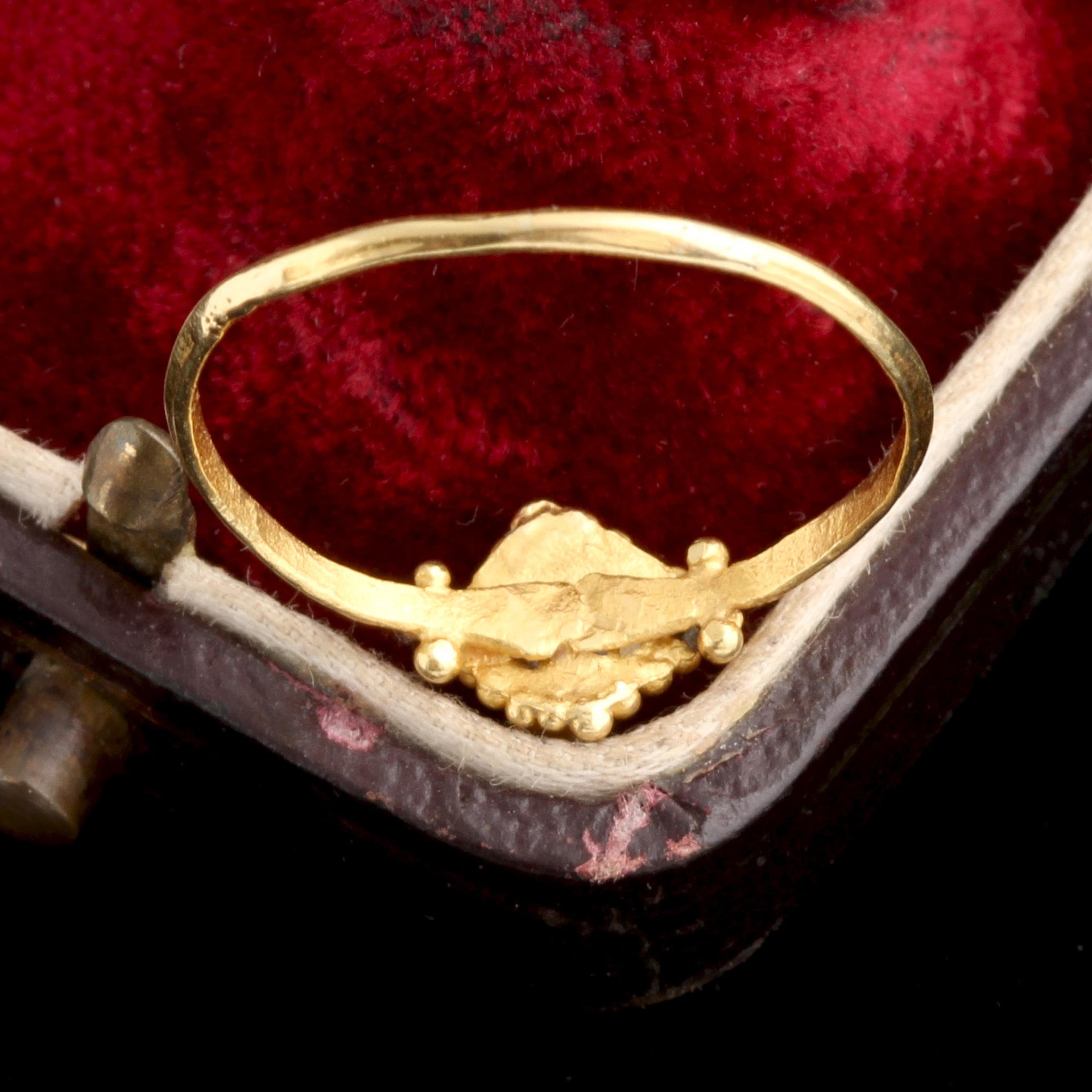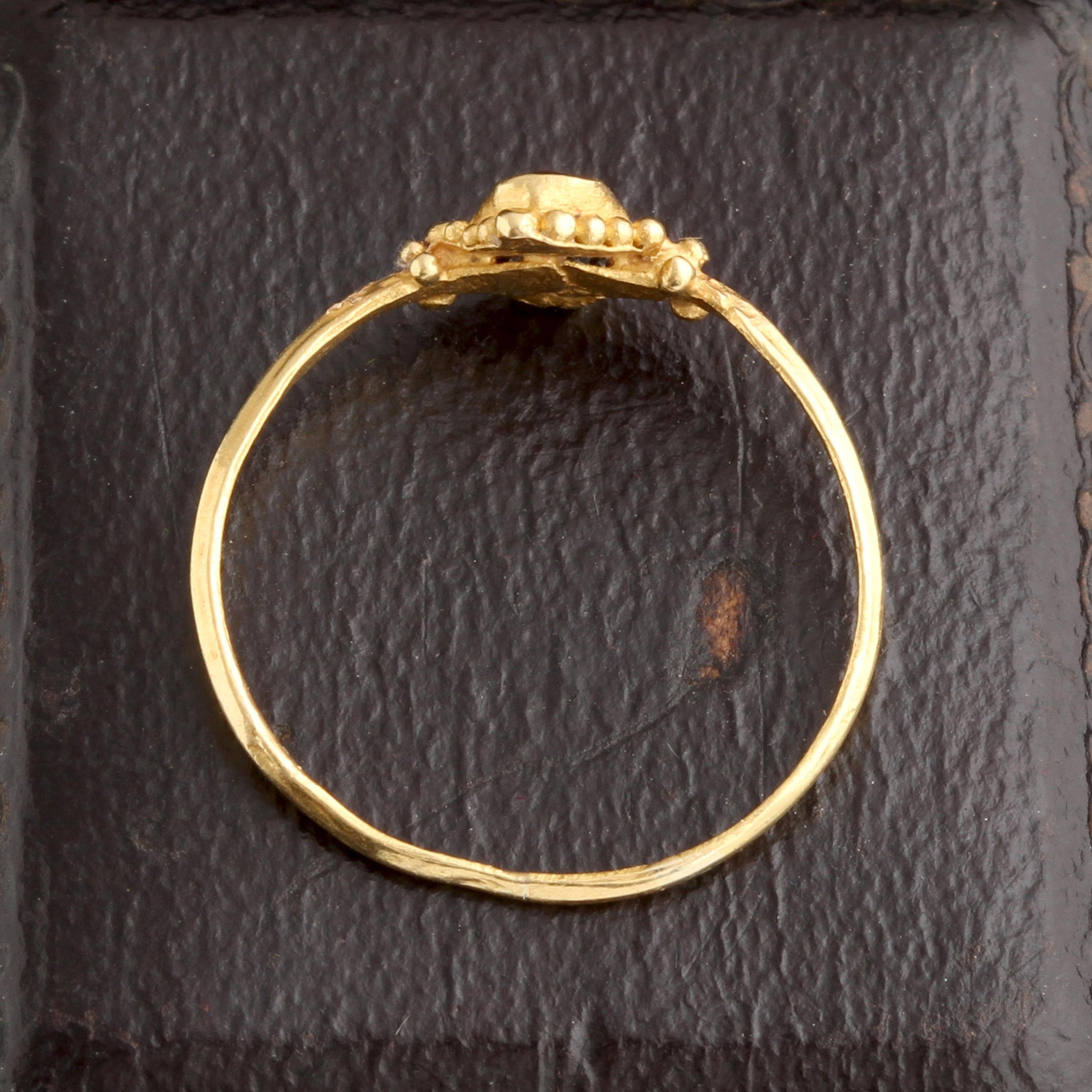 This (wearable!) ring was made at the tail end of the Middle Ages and the dawn of the Renaissance, the 14th - 15th c. A short list of what was happening in Europe then: the Crusades were being fought in the Holy Land, Gothic art and architecture was at its height, and the university system as we know it was being born. Europe's identity and culture was being formed through literature, religion, and the arts (including jewelry!) The age of sea exploration was yet to come. A survivor of all this change: the jewel you're looking at. It's a small miracle, a time traveler.