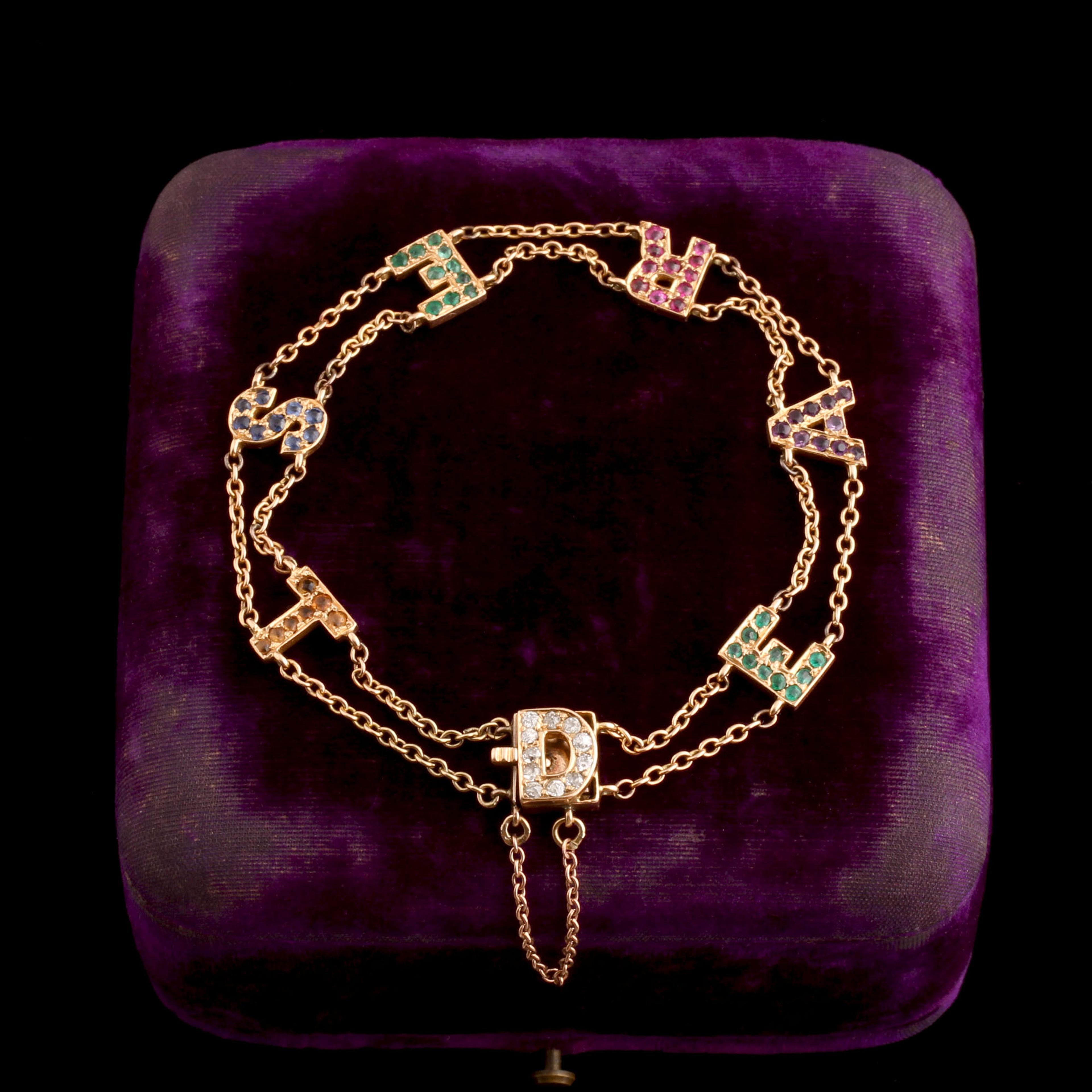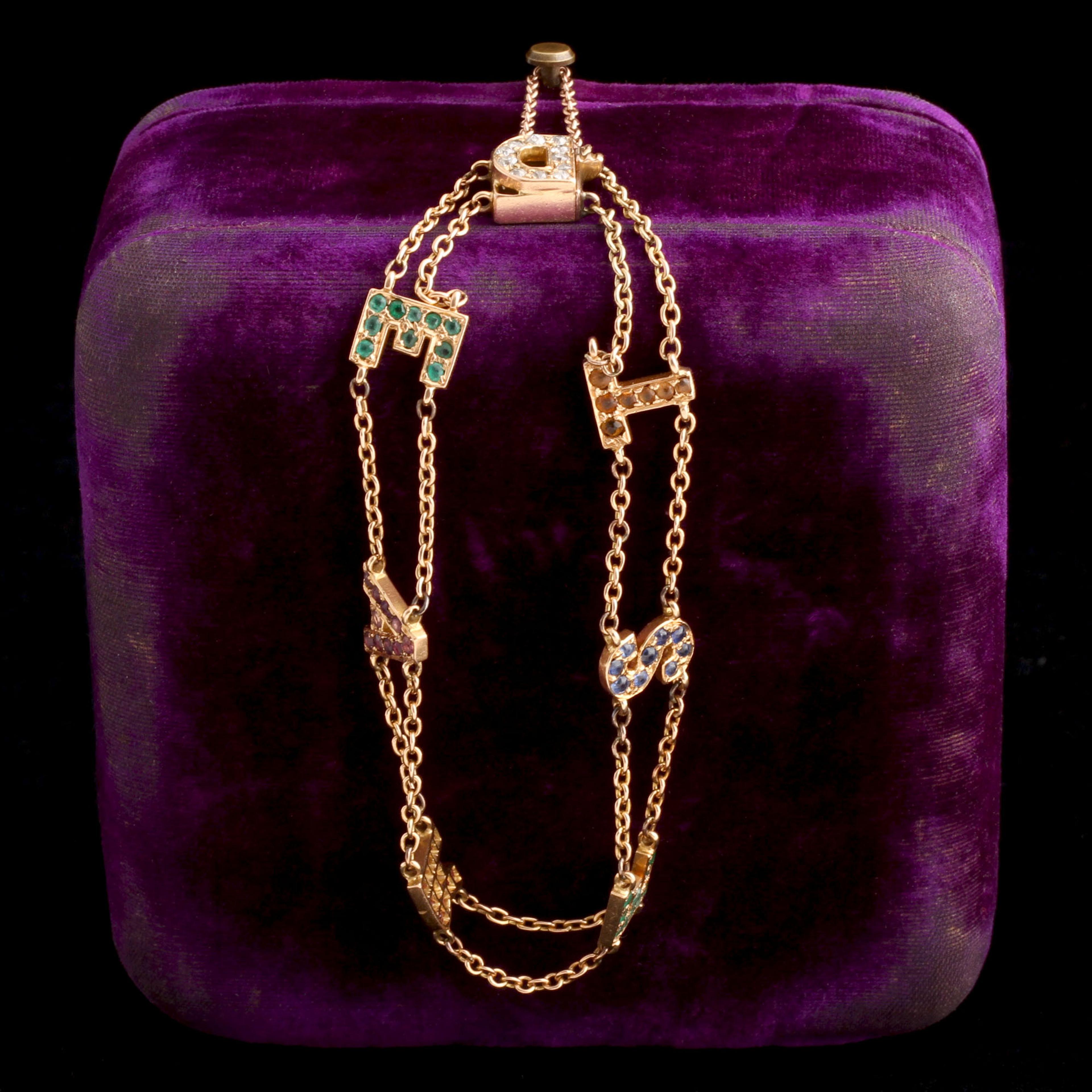 14k gold (tests), 11 1.8mm old European cut diamonds, 20 1.5mm emeralds, 10 1.5mm amethysts, 11 1.5mm rubies, 9 1.5mm sapphires, 7 1.5mm topazes