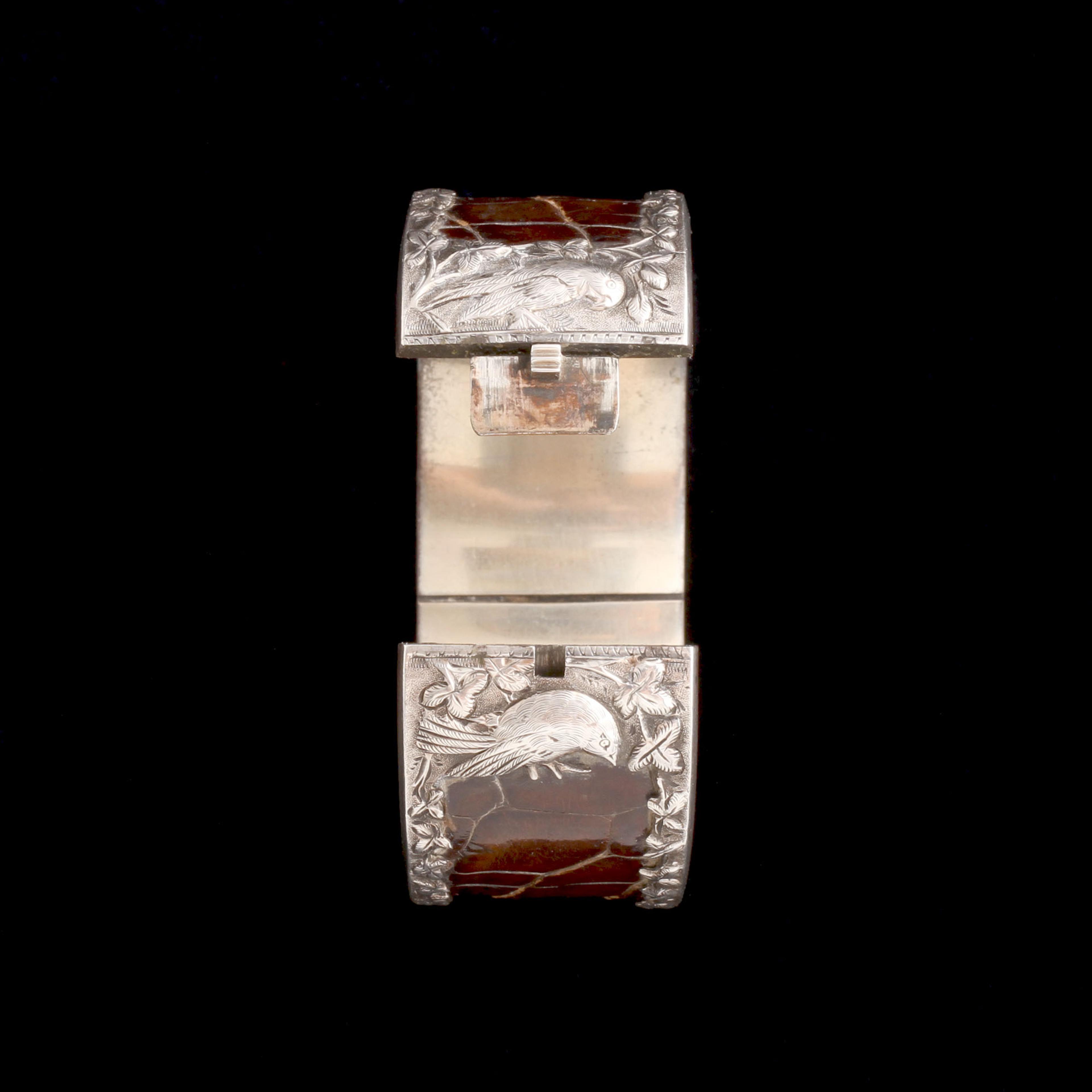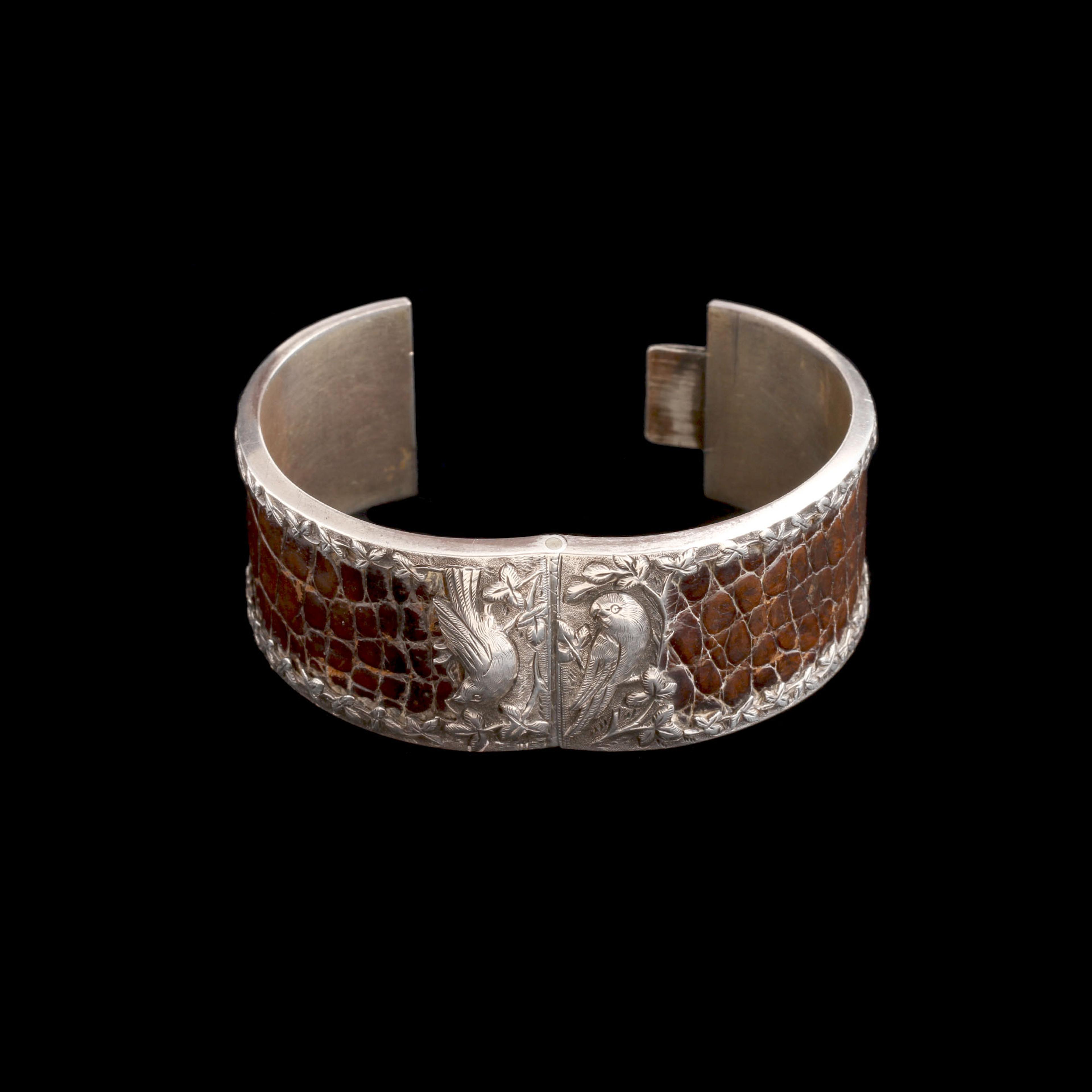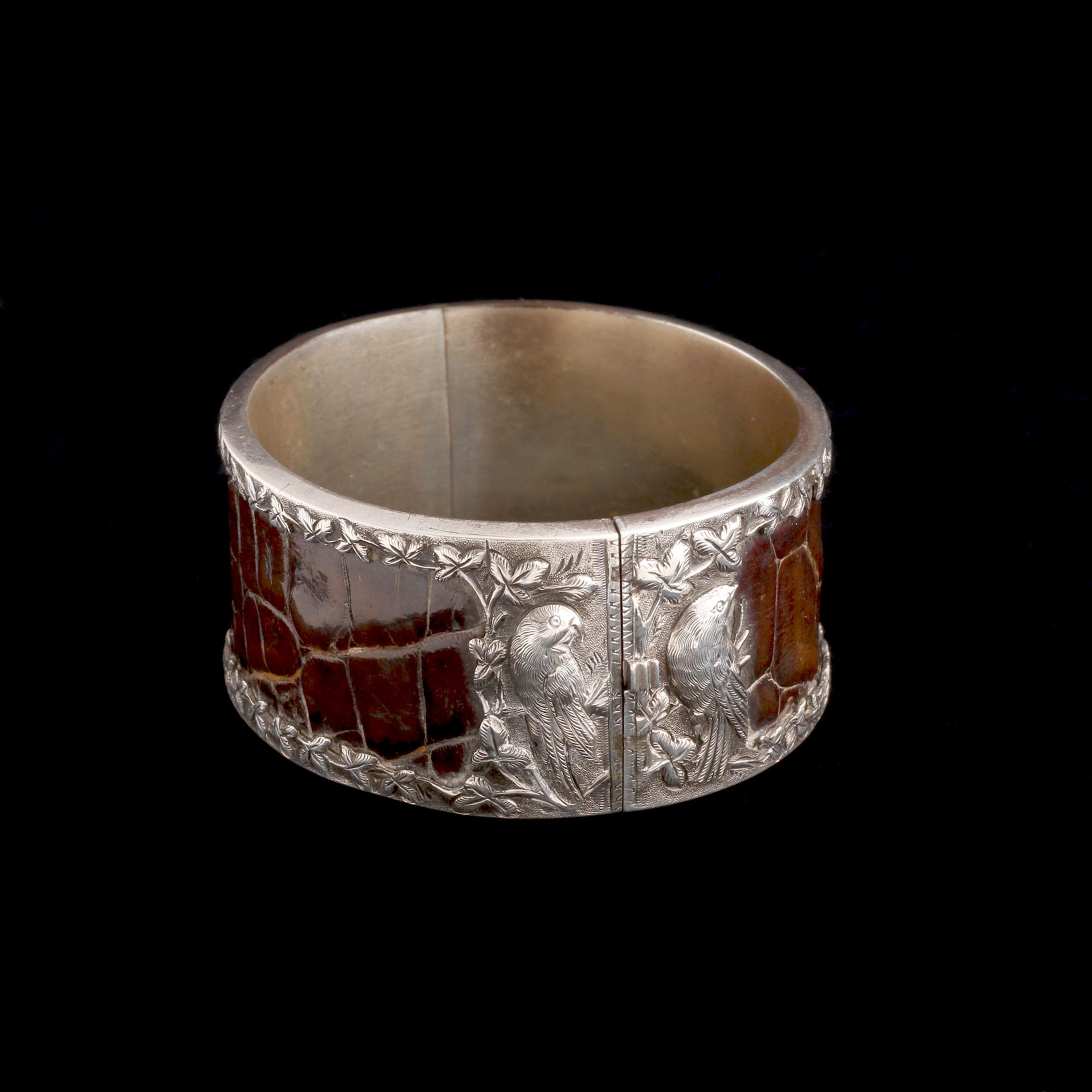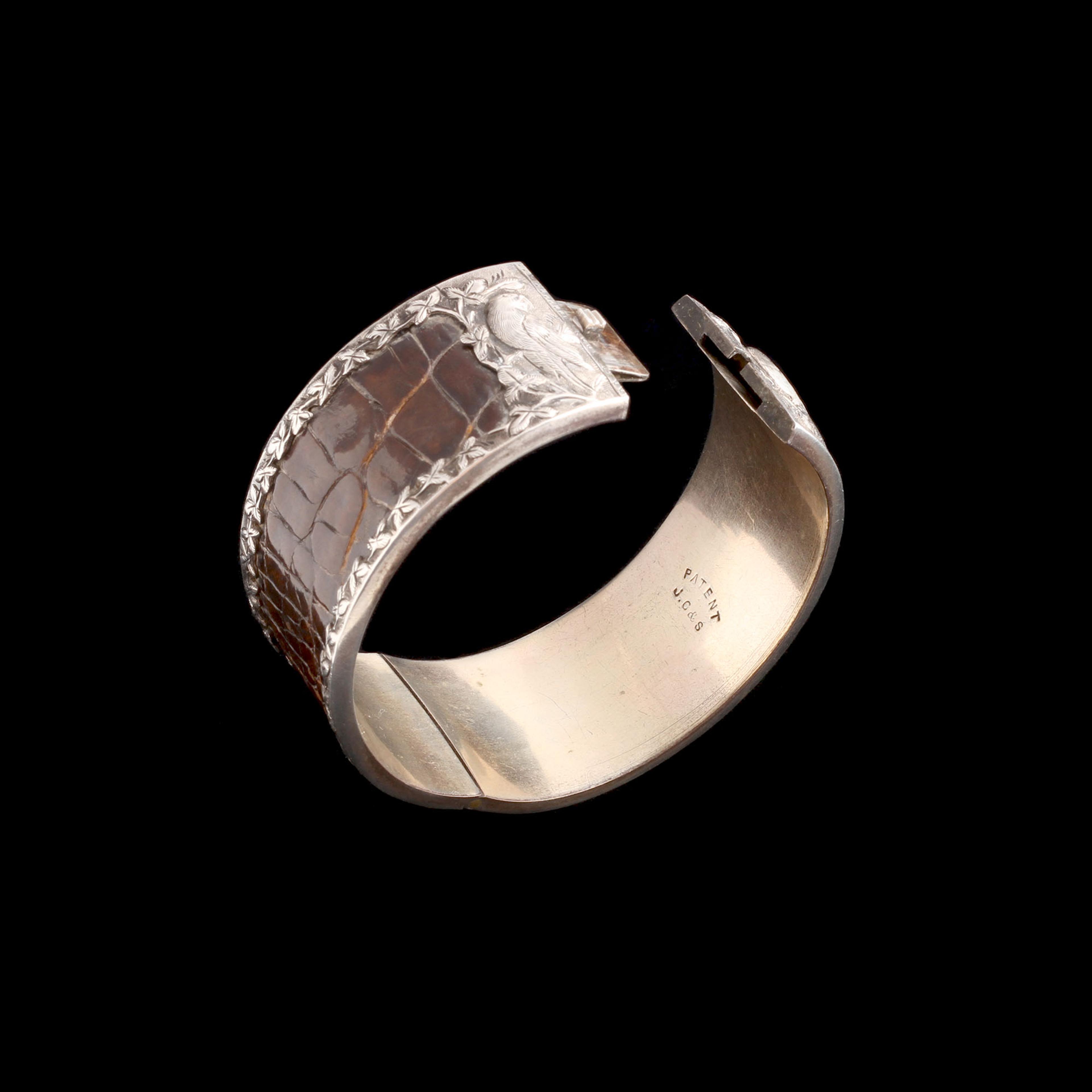 A parrot and a chickadee (?) decorate the hinge of this totally WTF bangle. Lucky clovers frame thick bands of crocodile leather. (The croc? Not so lucky.) I wonder how many of these could have possibly been made? Inside it's marked "Patent J. C & S" which is likely Joseph Cook & Son, a British jewelry and silversmithing firm that operated out of Birmingham during the Edwardian period. They specialized in intricate inlays and novelties, but crocodile leather must have been EXTREMELY novel to an English person in the year 1900.