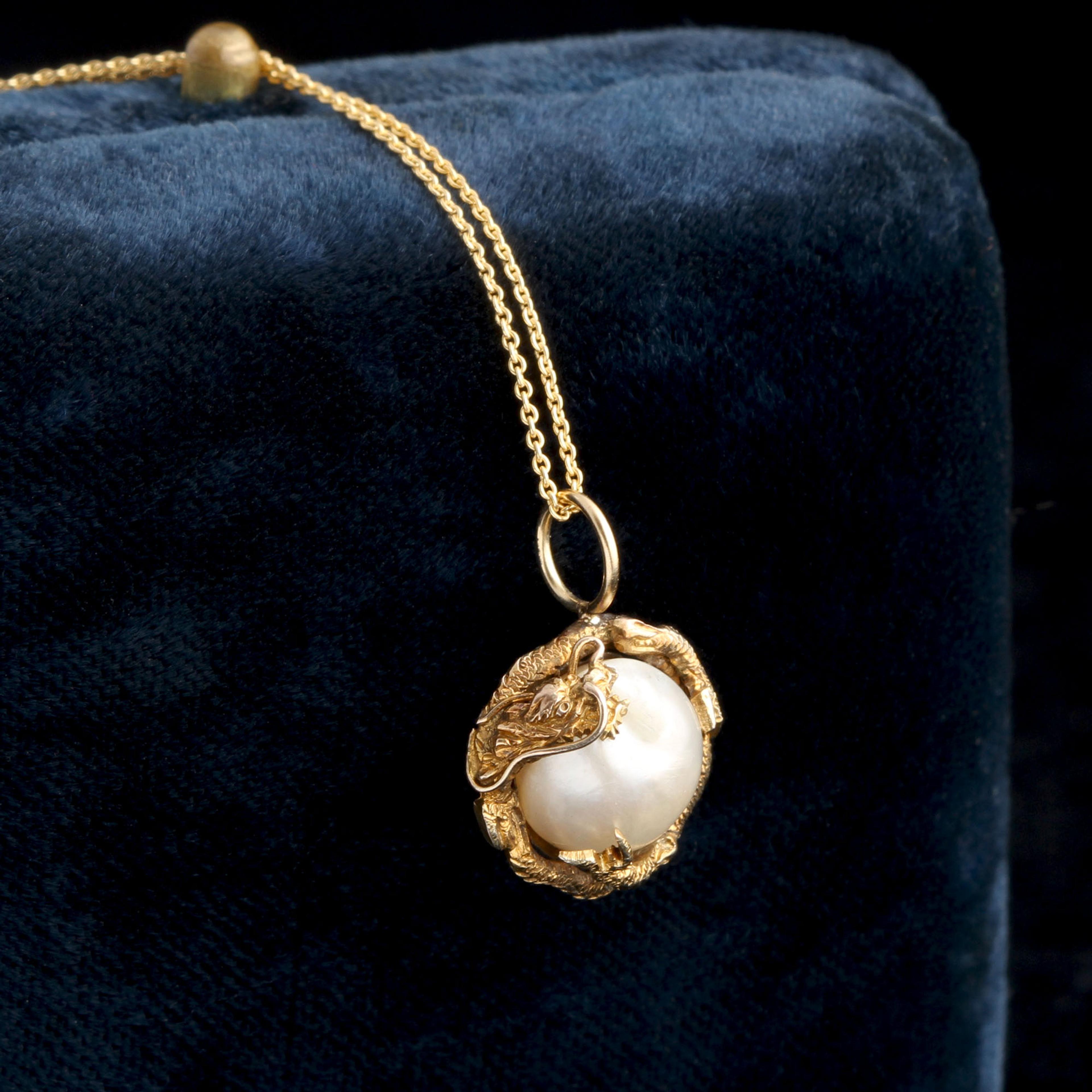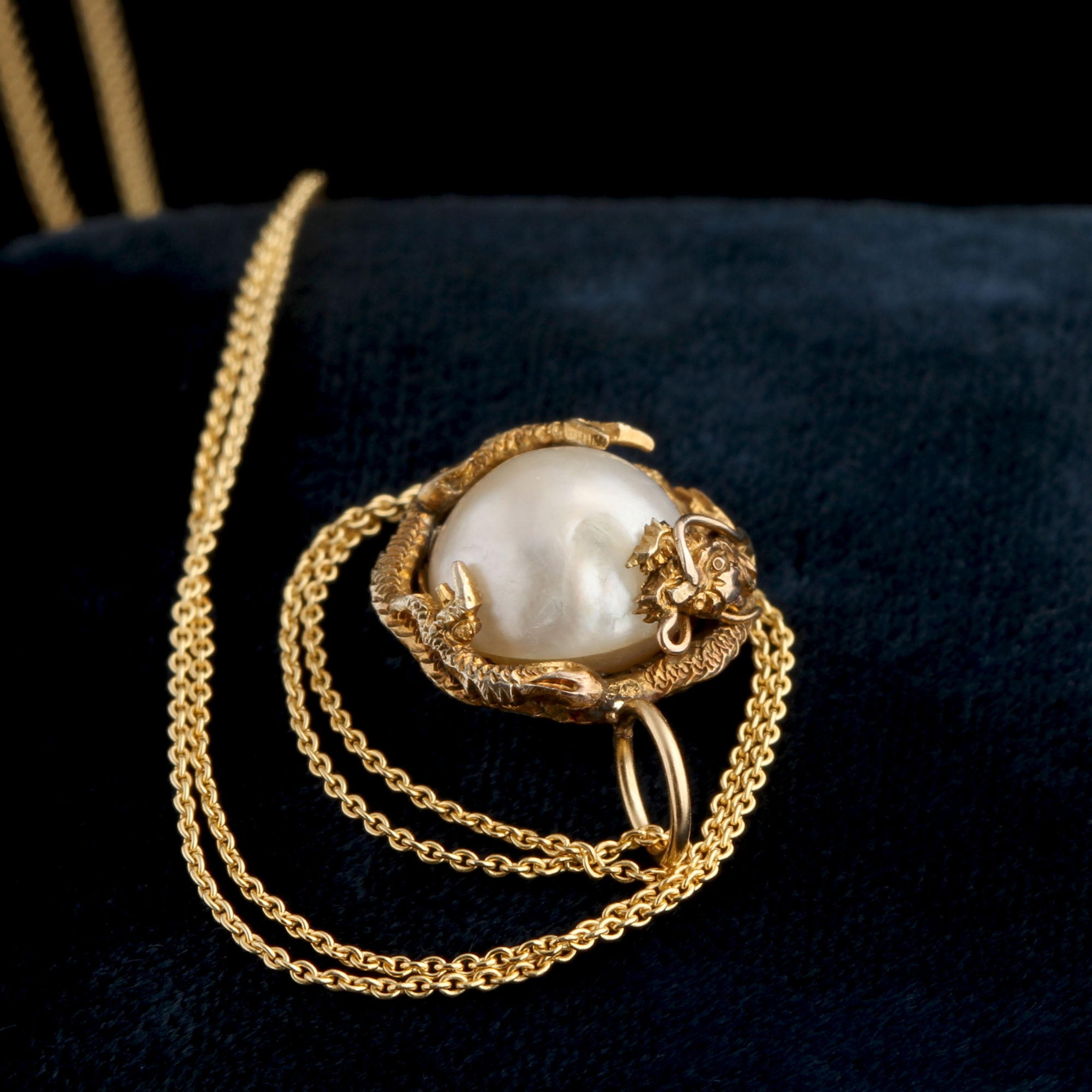This gold dragon's organic shape creates a frame around a pearl. Was once a stickpin, now a pendant.