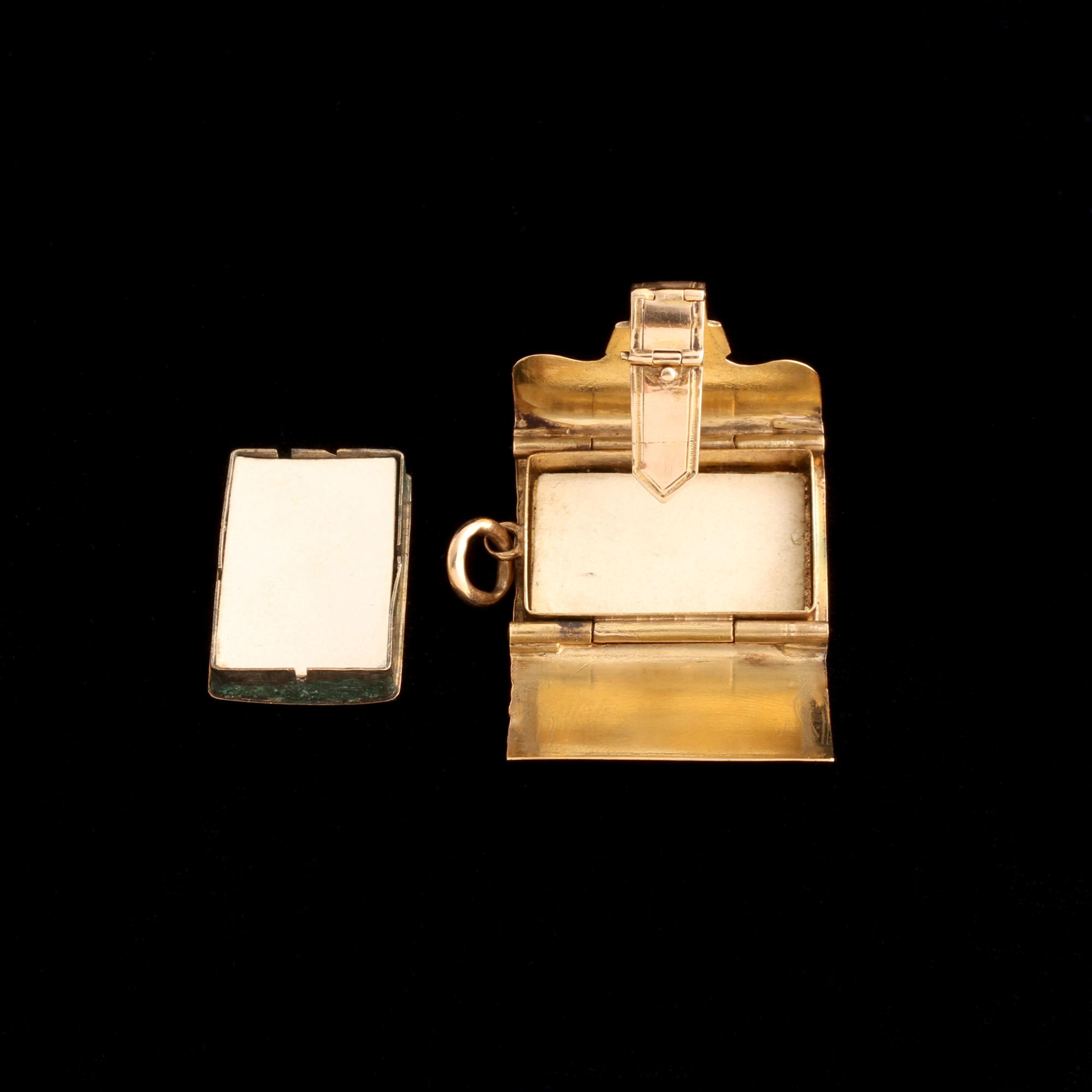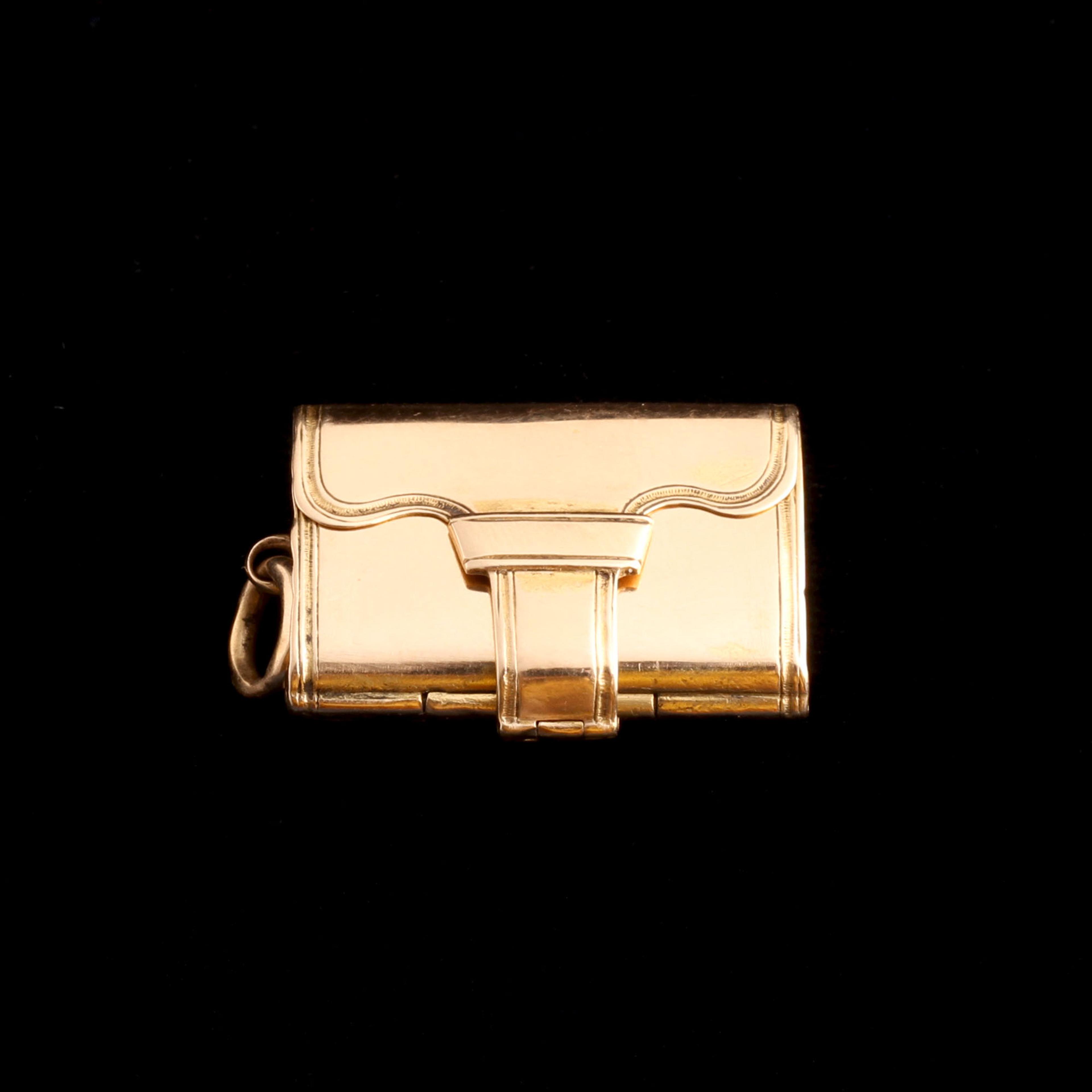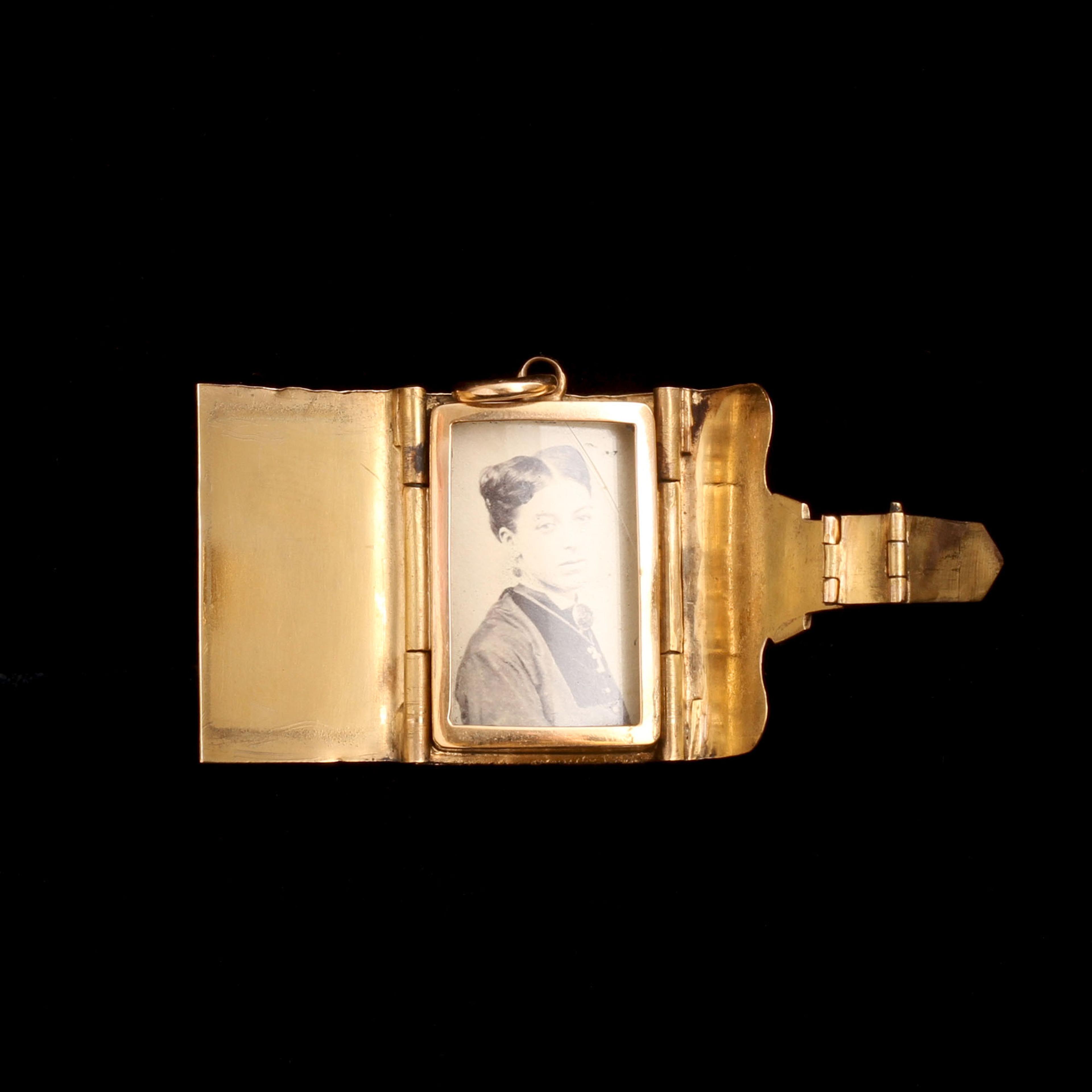PHOTOS CANNOT CONVEY the stunning quality and workmanship that went into making this Victorian locket. Modeled in the shape of satchel, the moveable strap functions as the clasp. It operates almost seamlessly thanks to three separate hinges - so smooth! Inside there is a single locket compartment which currently holds a photograph but has enough depth to hold a small memento. The glass panel lifts out easily.