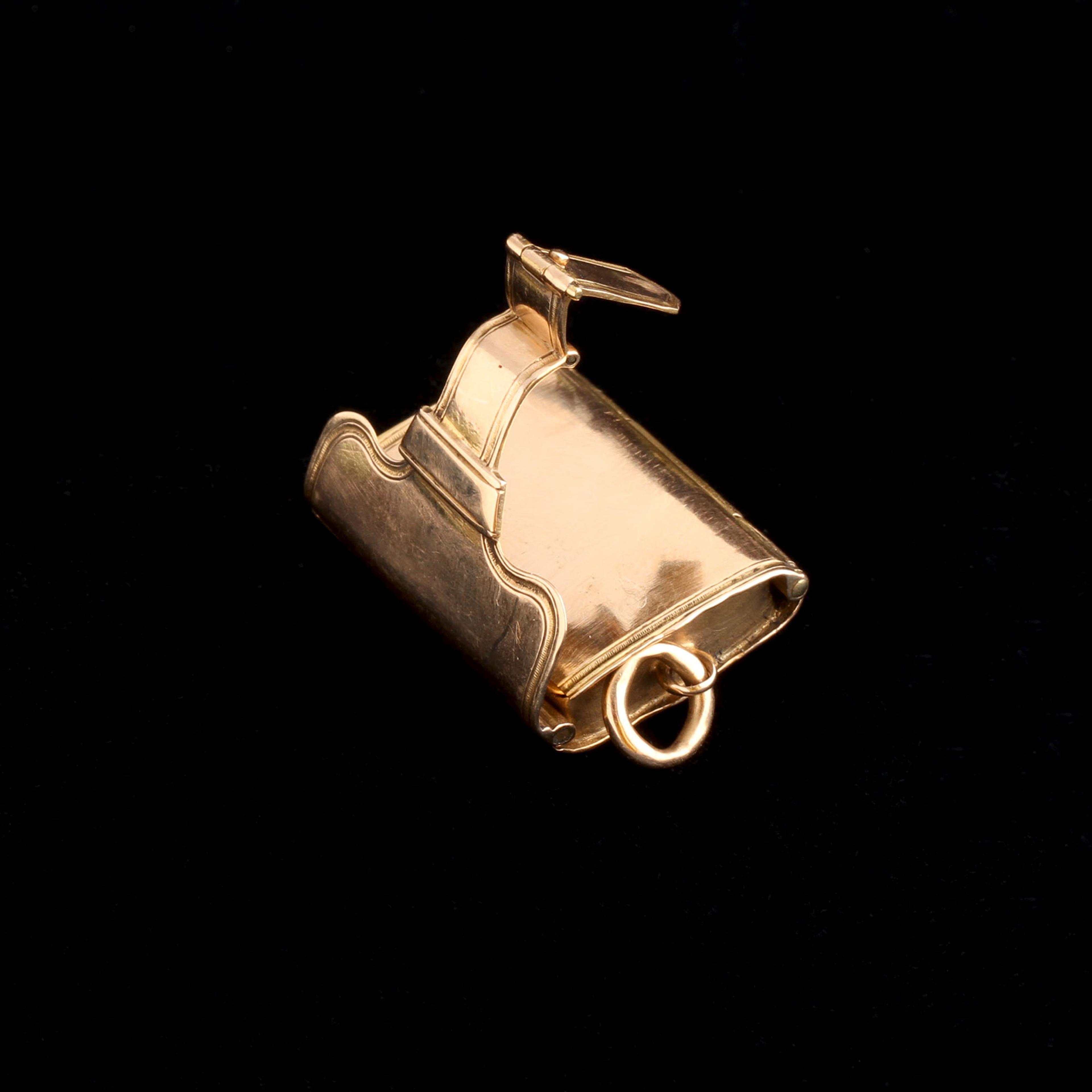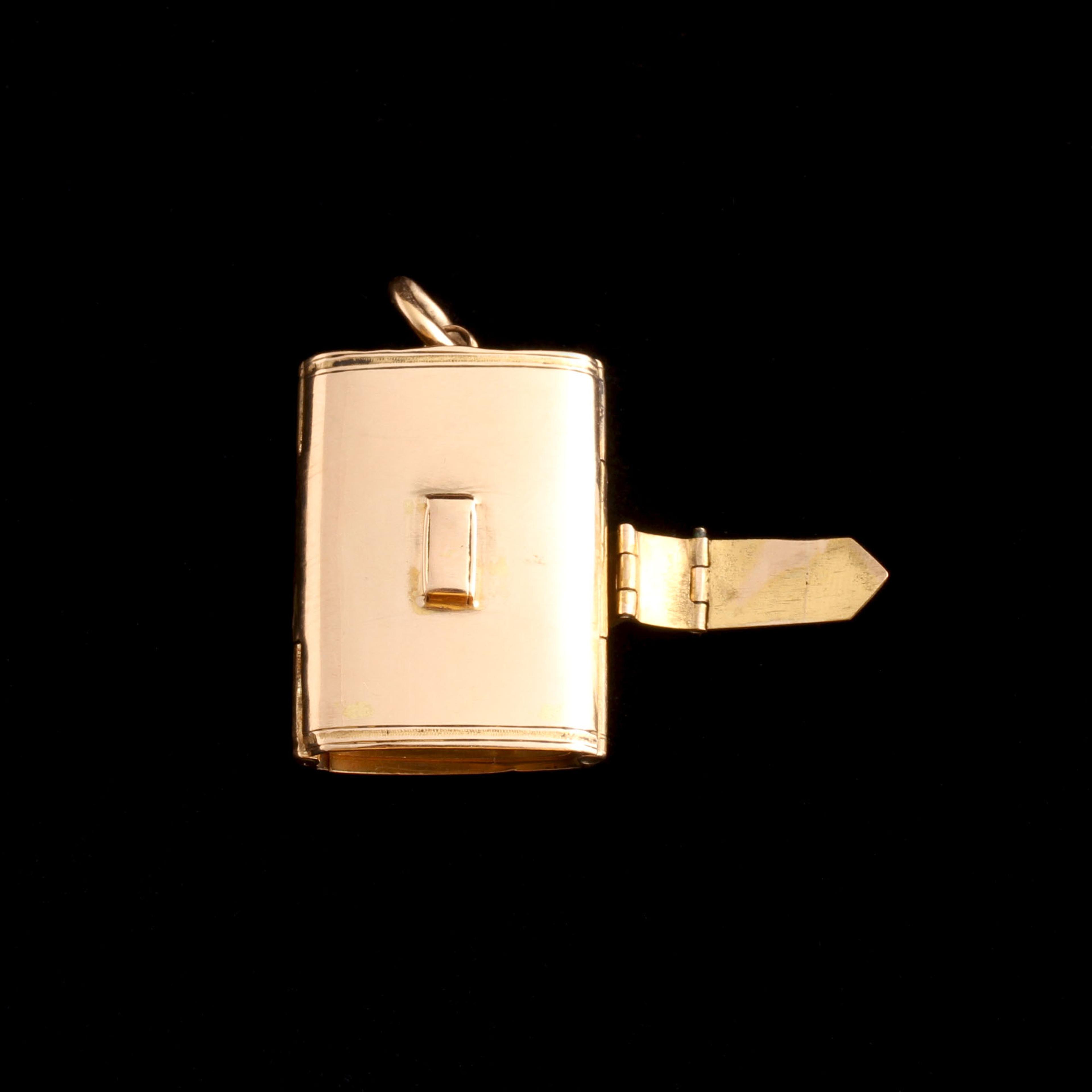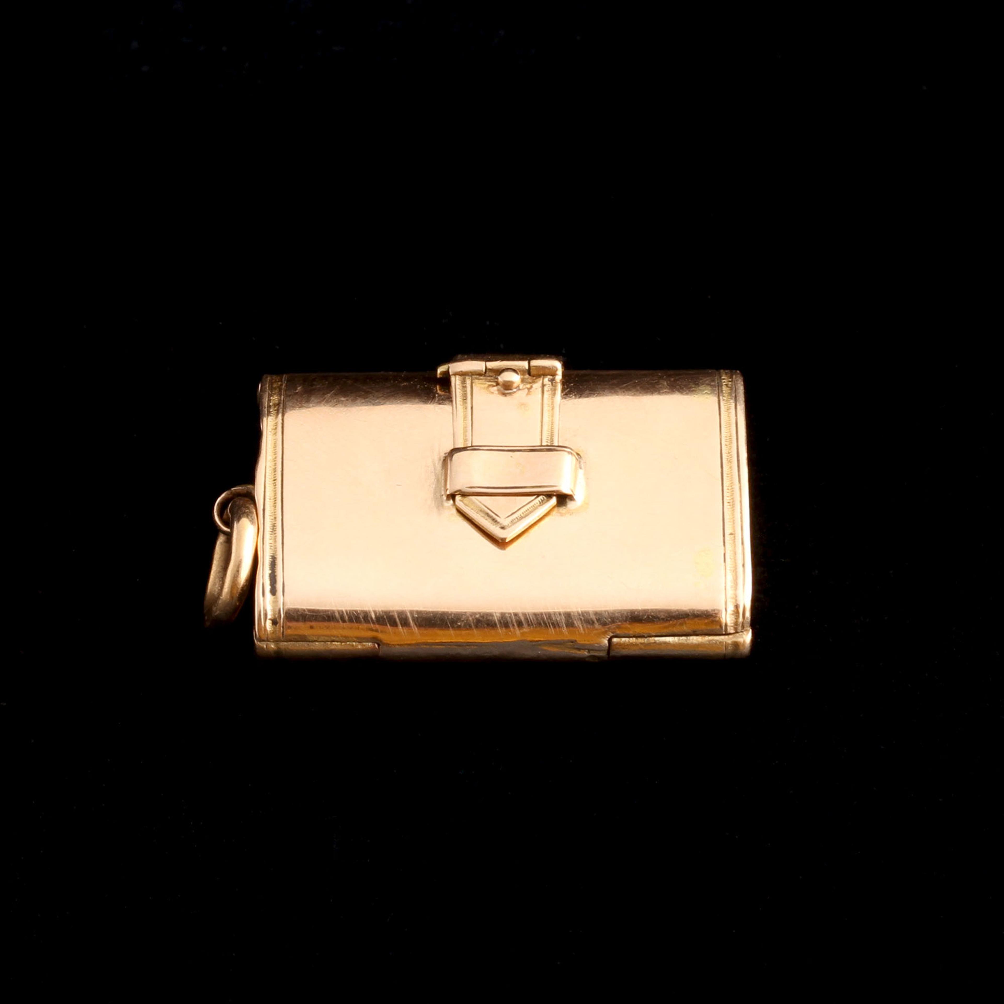 PHOTOS CANNOT CONVEY the stunning quality and workmanship that went into making this Victorian locket. Modeled in the shape of satchel, the moveable strap functions as the clasp. It operates almost seamlessly thanks to three separate hinges - so smooth! Inside there is a single locket compartment which currently holds a photograph but has enough depth to hold a small memento. The glass panel lifts out easily.