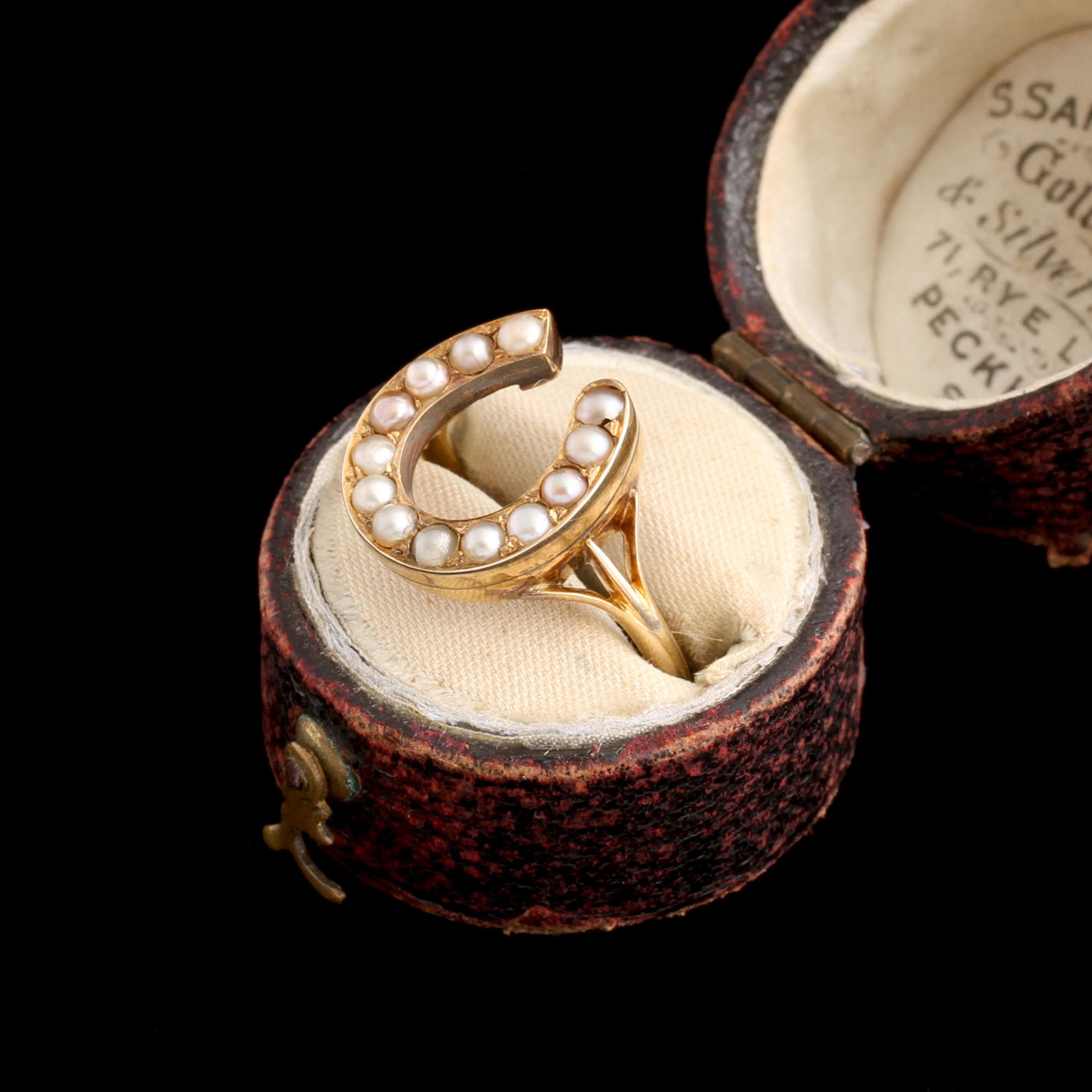 (Lucky!) Thirteen pearls dot this horseshoe, which we all recognize as an ancient lucky symbol. But the luck is doubled by the numerology of the pearls - thirteen was was traditionally considered a lucky number in France prior to the First World War, and was used as a good luck symbol on postcards and charms. The bad superstition surrounding 13 (particularly on Friday) was a modern invention popularized by books and media in the 20th century.