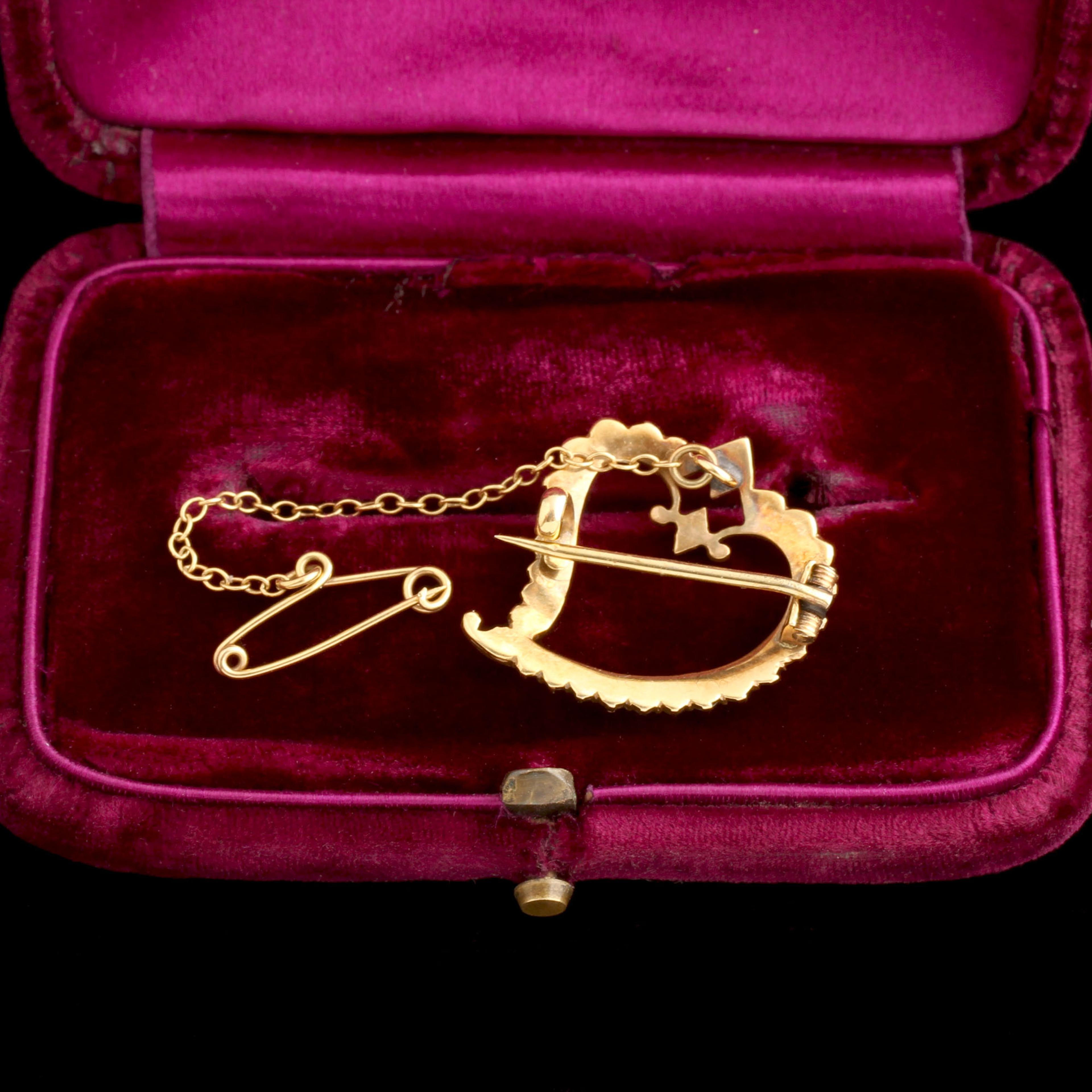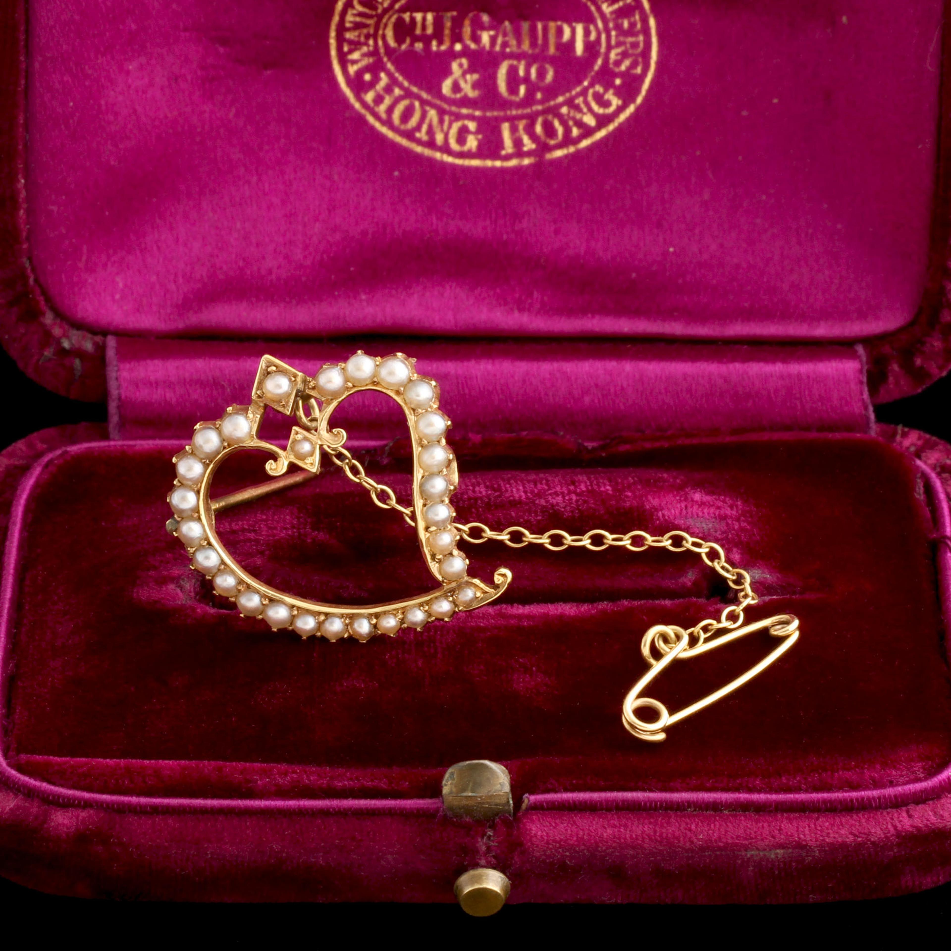 The heart shape has evolved over the centuries from an upside-down pear shape in the 1500s to the symmetrical cleft heart we use today. In the 19th century, this version - with a twist to one side - was commonly called a “witch’s heart.” Giving your loved one a jewel in this shape meant that they had “bewitched” you (in the most romantic way possible). This late Victorian witch’s heart brooch is set with seed pearls and affixed with a safety chain.