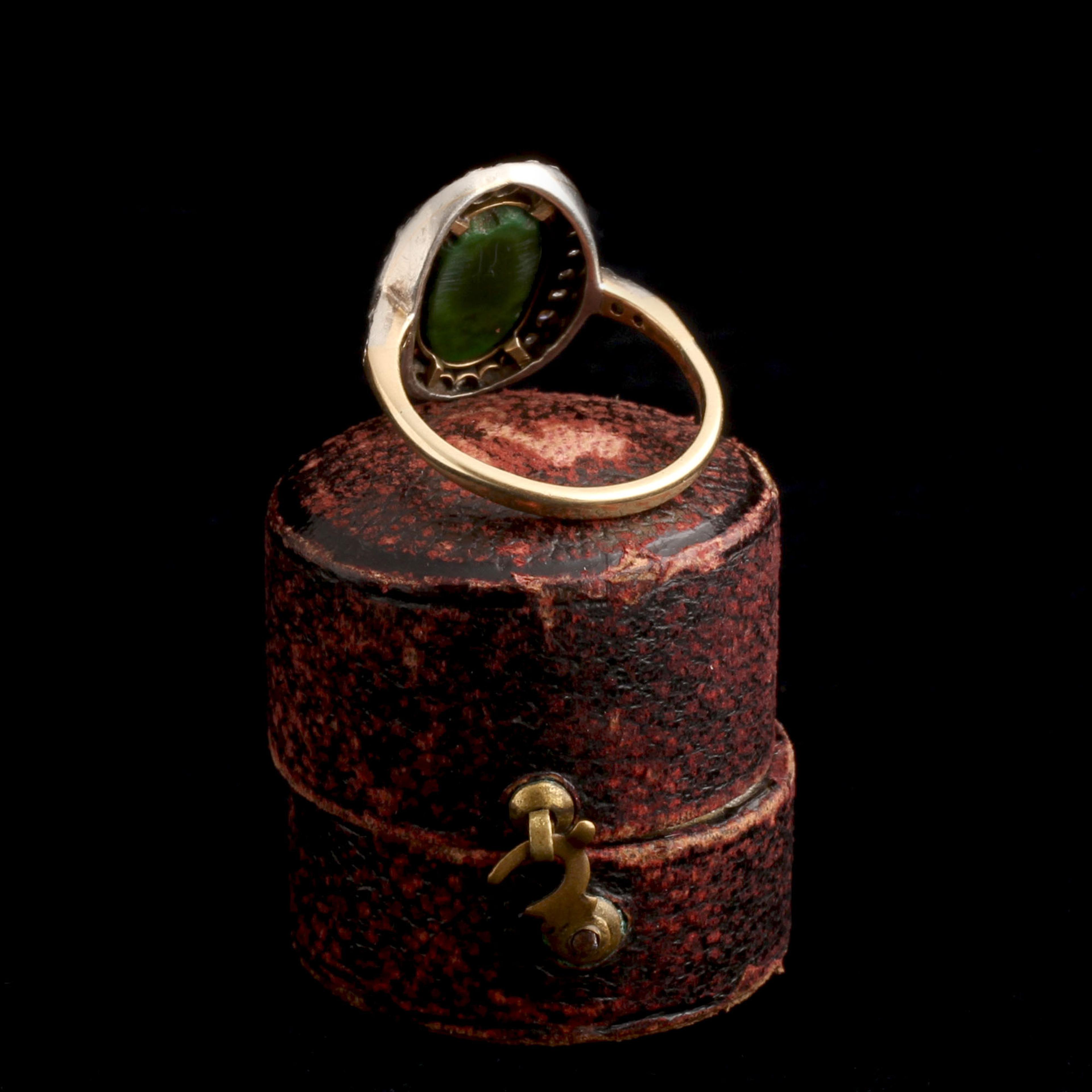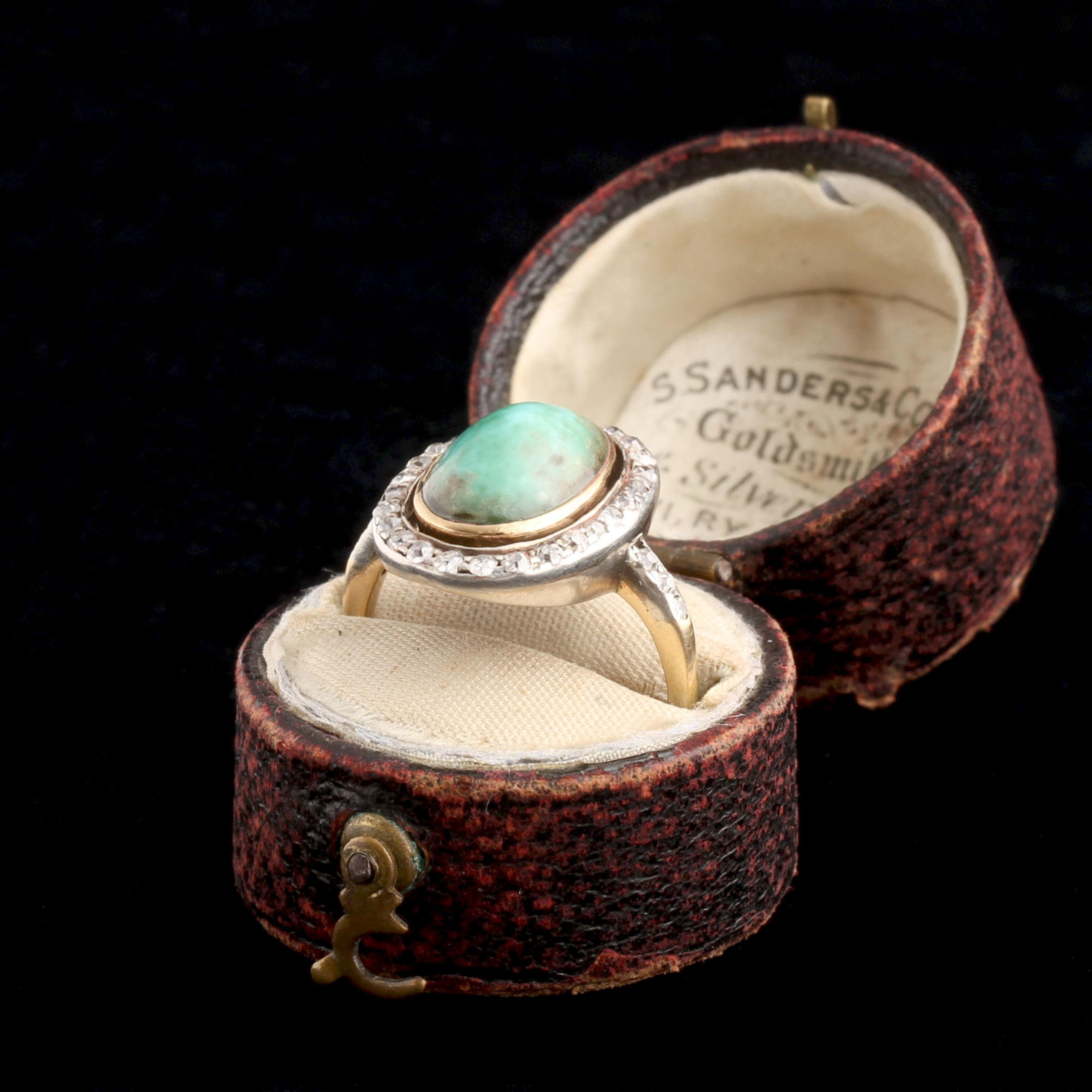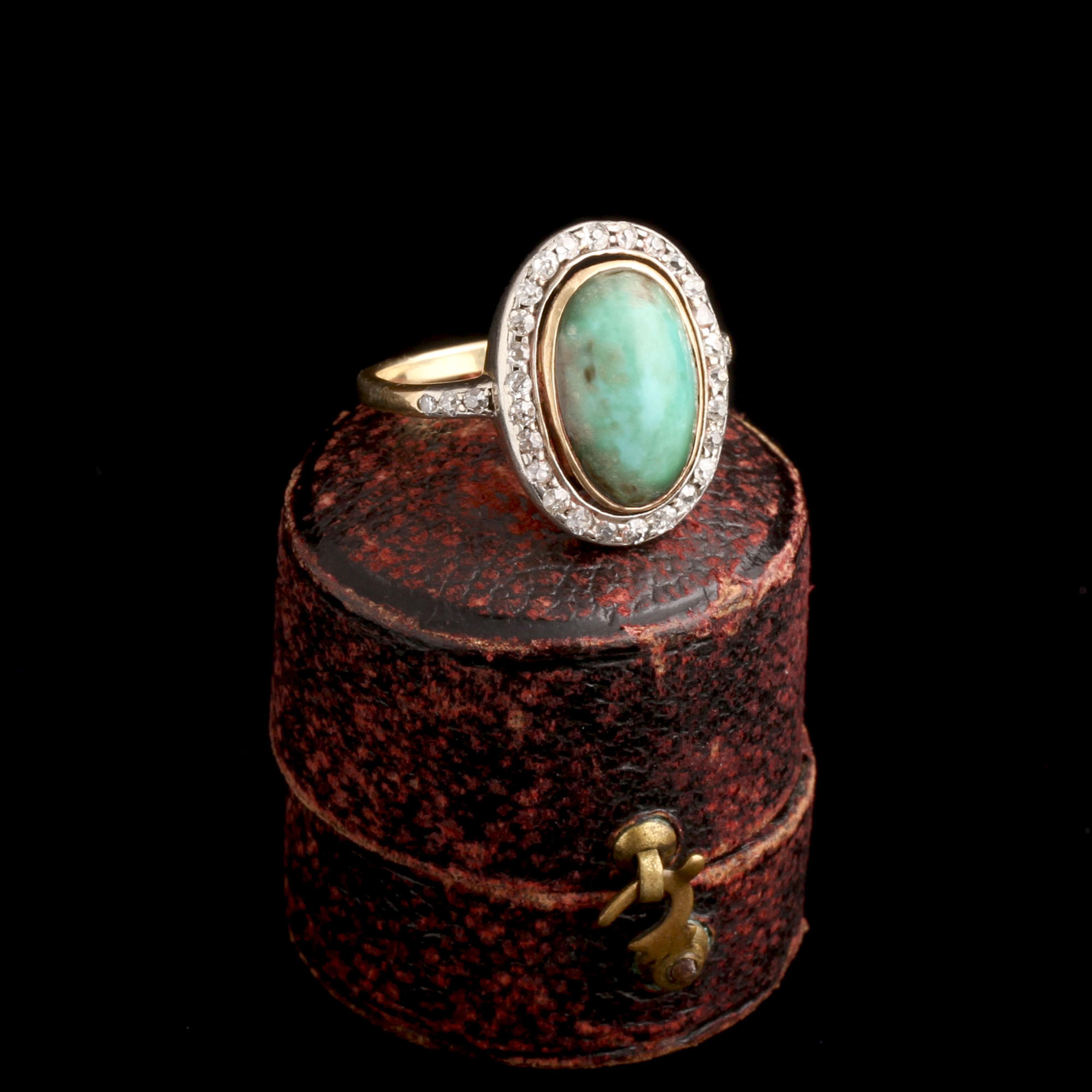 This greenish, mottled turquoise oval differs from the small, uniform cabochons more typical of early 19th-century jewelry. In earlier Georgian and Victorian work, turquoise was used as a decorative accent, set in rows or pavé and carefully calibrated to match, dissolving into pattern rather than standing alone. Much of this earlier turquoise came from Persia or the Near East and was prized for its even blue color. By the late Victorian period, tastes shifted toward larger stones valued for their individuality. Increased access to American turquoise from Nevada and the Southwest, along with a growing interest in stones as natural objects of beauty, allowed a single weird cabochon to take center stage. The diamond halo frames the turquoise like a picture, emphasizing the stone as the focus.