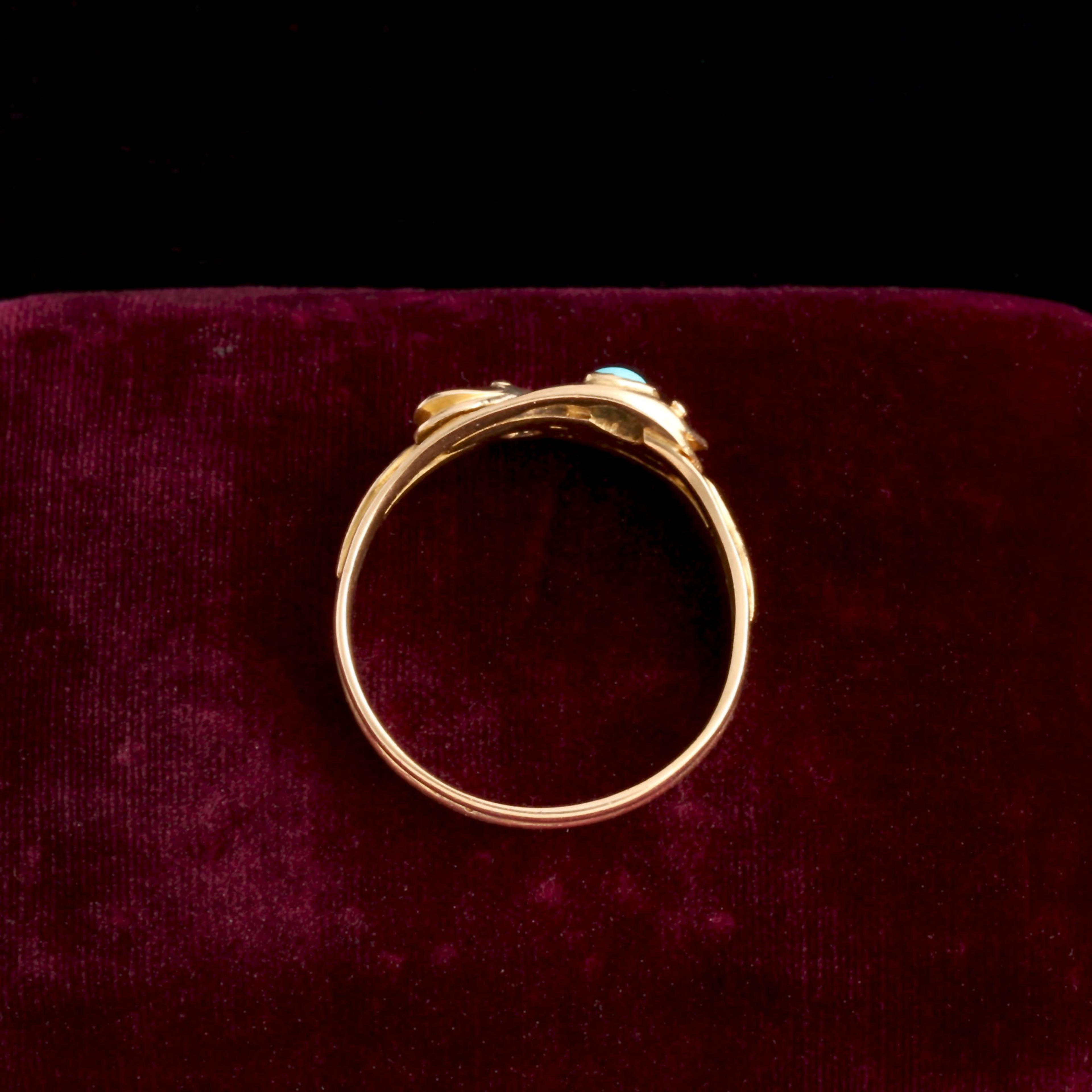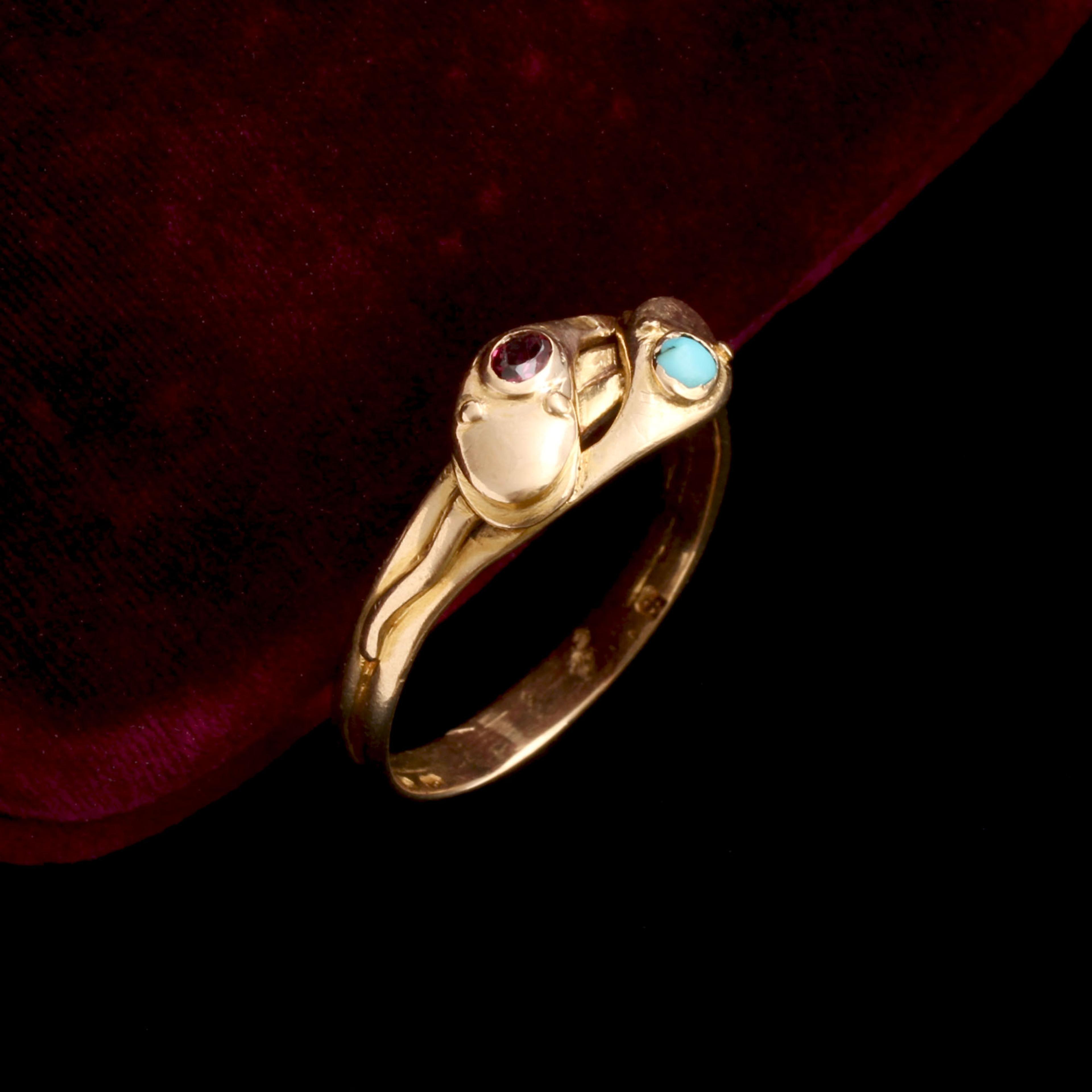 The hallmarks tell us these embracing serpents were made in Birmingham in 1890. A veined turquoise and amandine garnet are an unusual choice for the pair, but somehow they work together. Just like you guys. The snakes' wide smiles are ecstatic.
