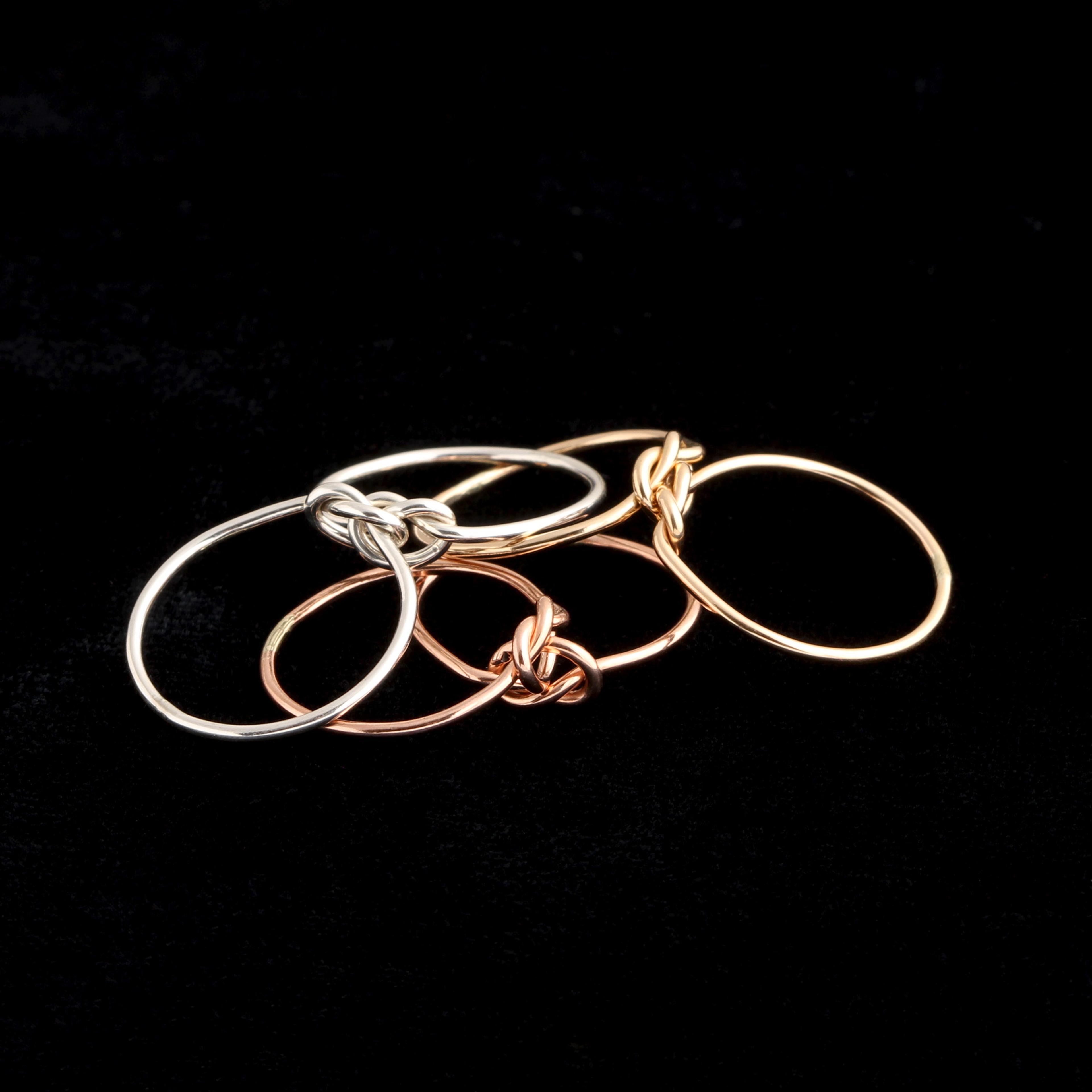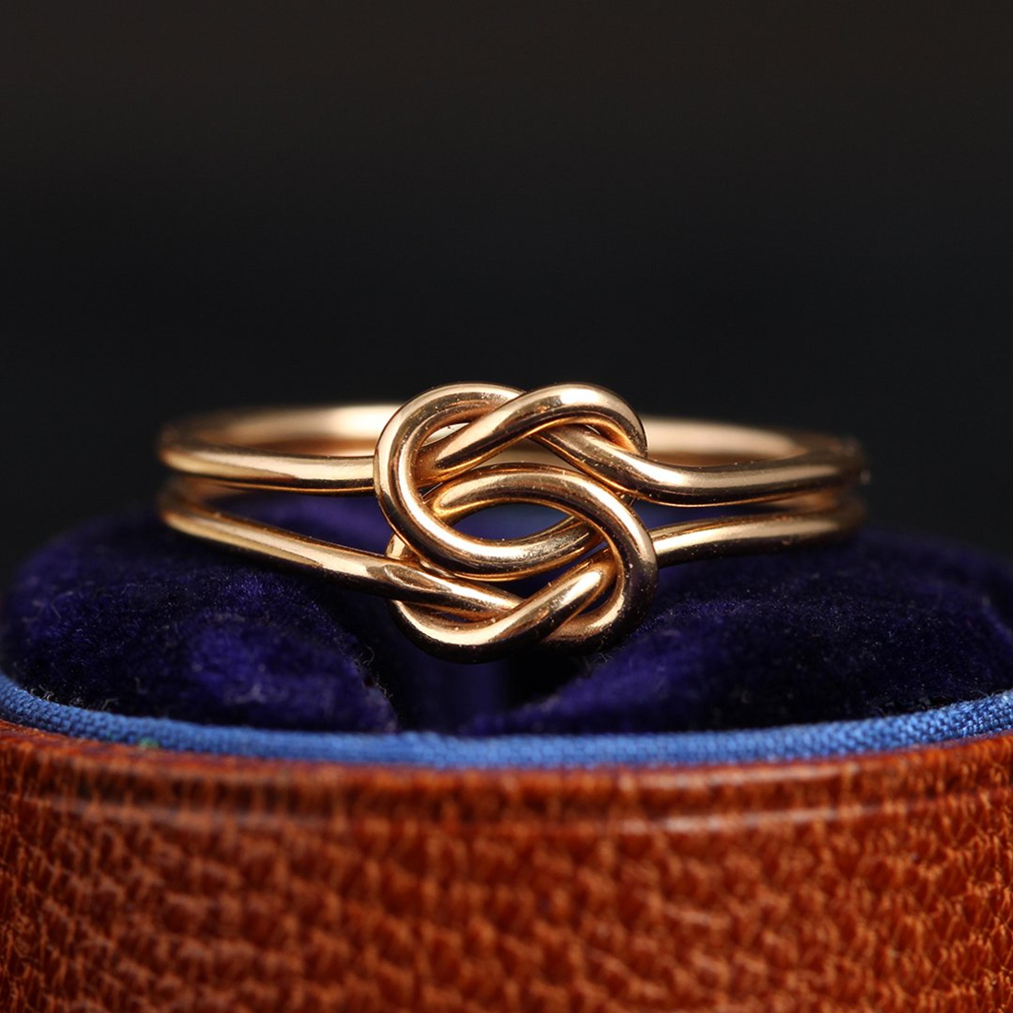 The association of knots with the symbolism of love, friendship, and affection dates back to antiquity. Throughout the last few centuries, though, they've most commonly been regarded as a symbol of the connection between two lovers. This particular type, often called the "true lover's knot", was a popular ring style for sailors separated from their beloved. It's made by interlocking two overhand knots in two parallel wires, so each one is flexible to move about the other, yet they're inseparable forever. (Aw!)