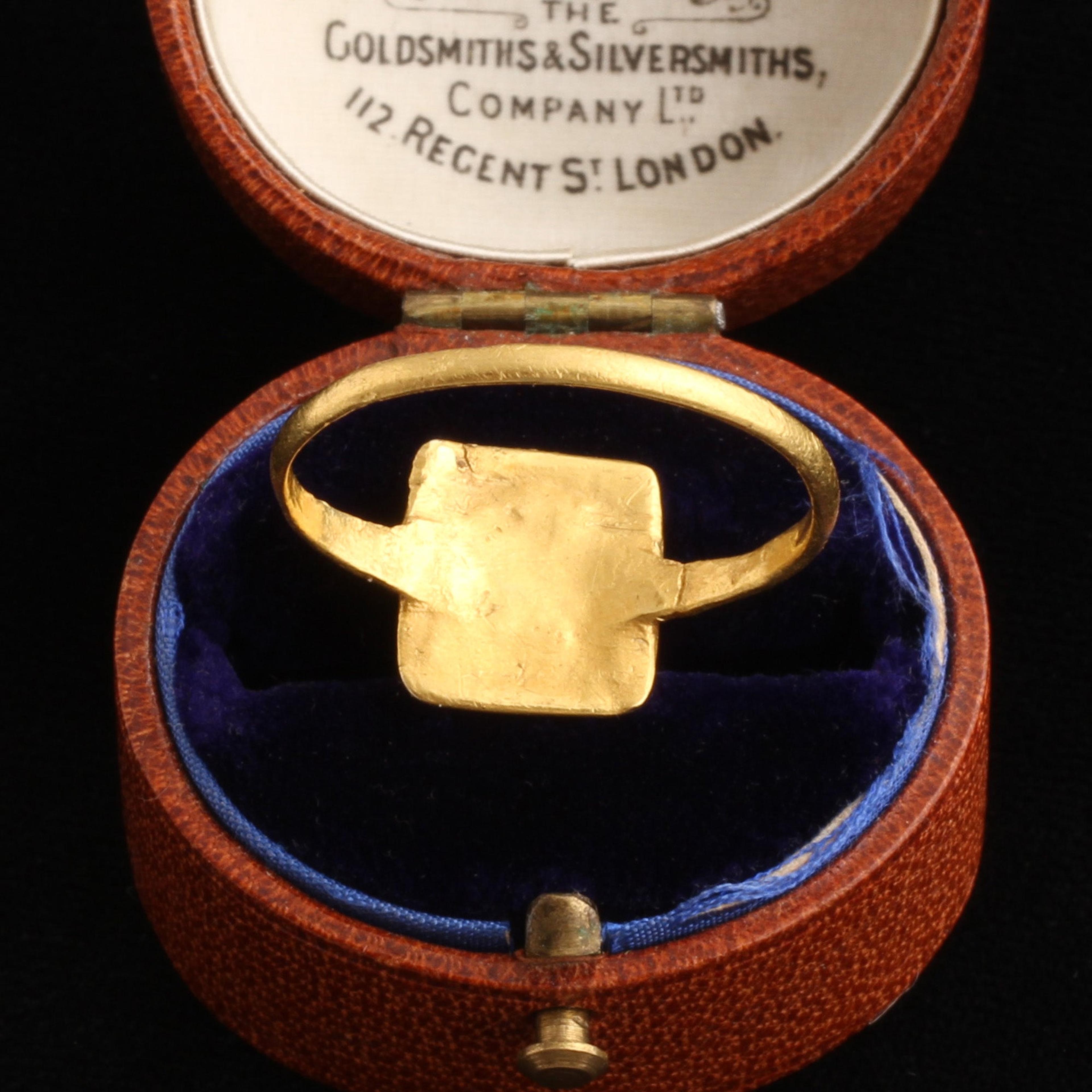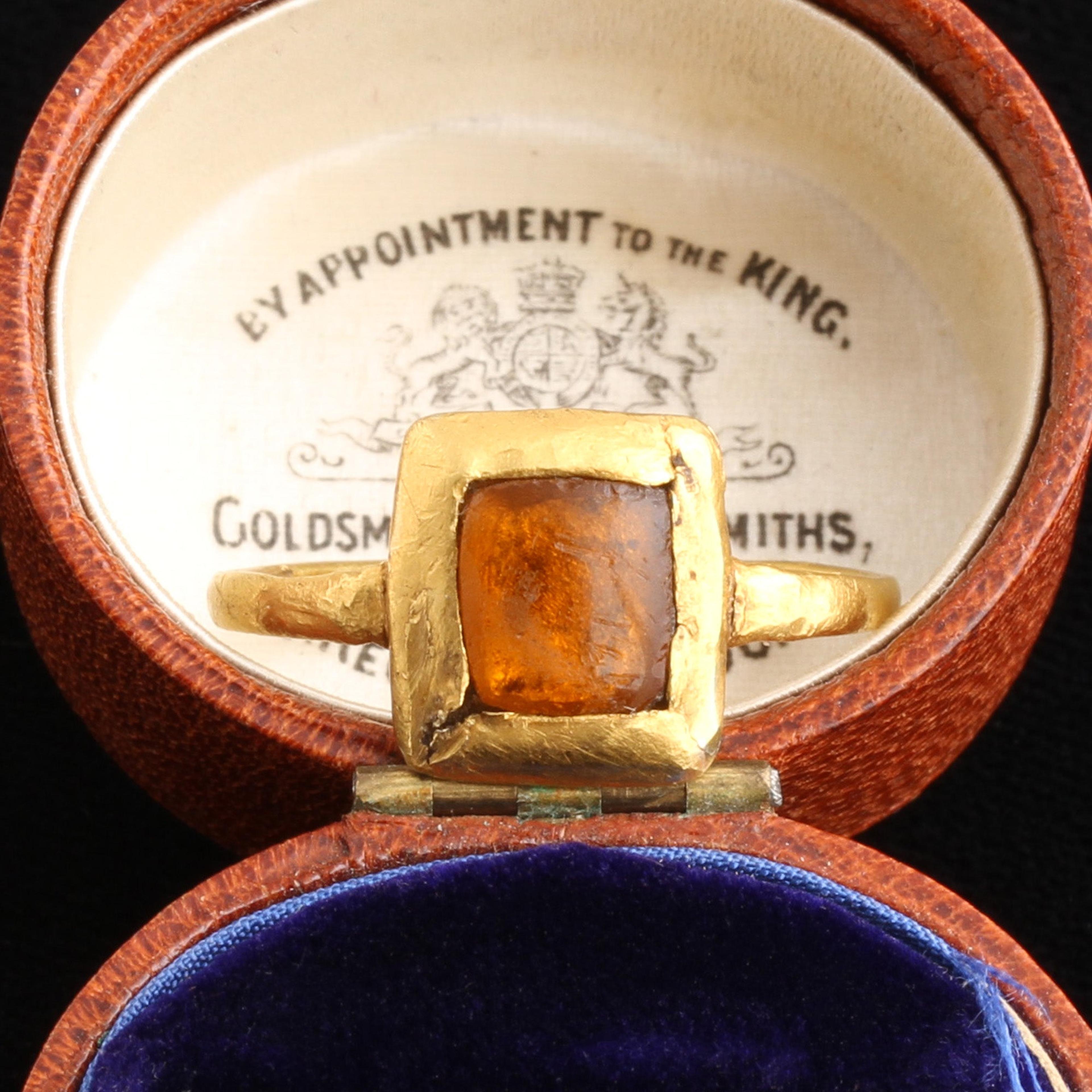 An exquisitely rare Medieval finger ring modeled in high karat gold and set with amber glass. Nineteenth century collectors named this style "tart mold" owing, unsurprisingly, to the setting's resemblance to the shape of a pastry crust. This piece dates to the 12th or 13th century and is Western European in origin.