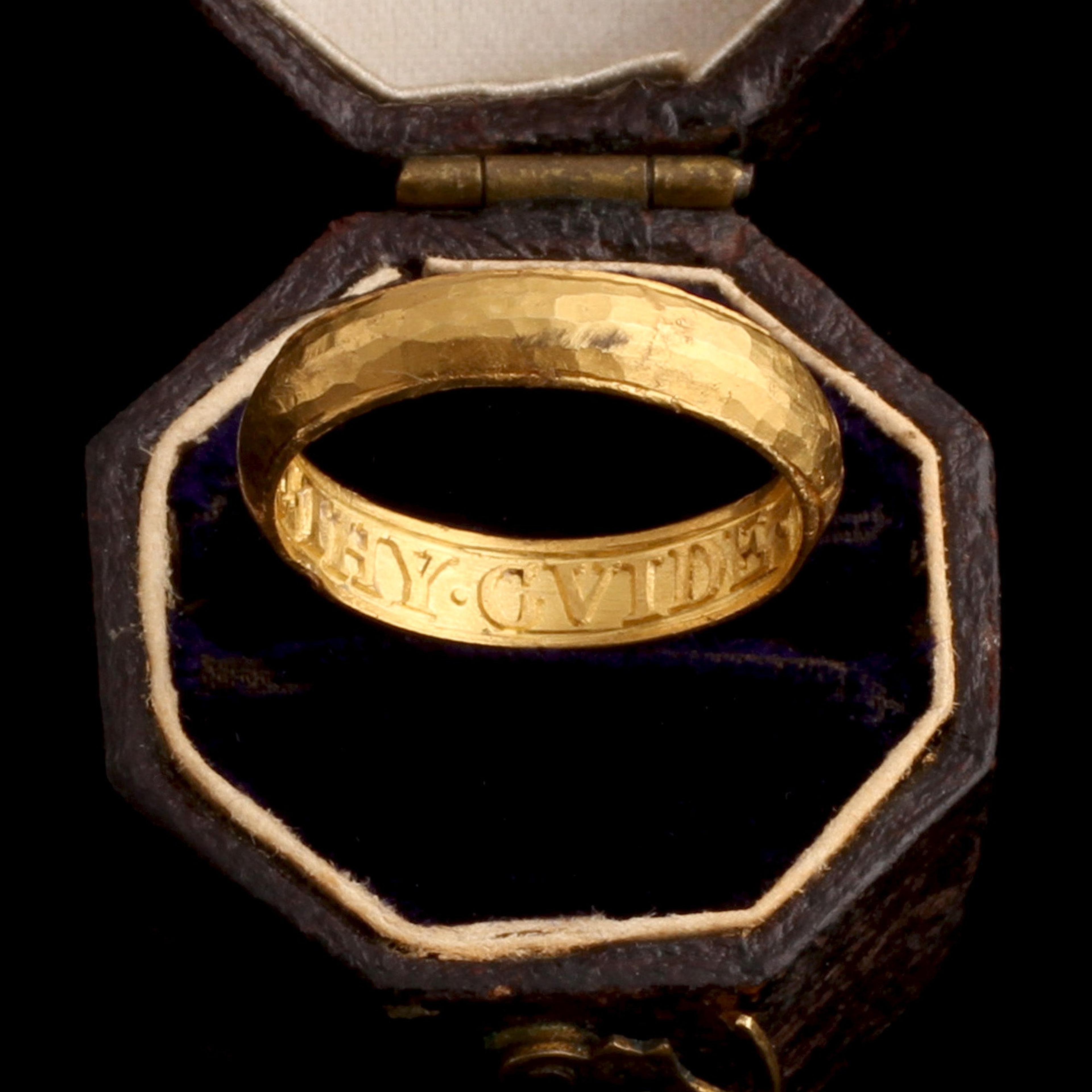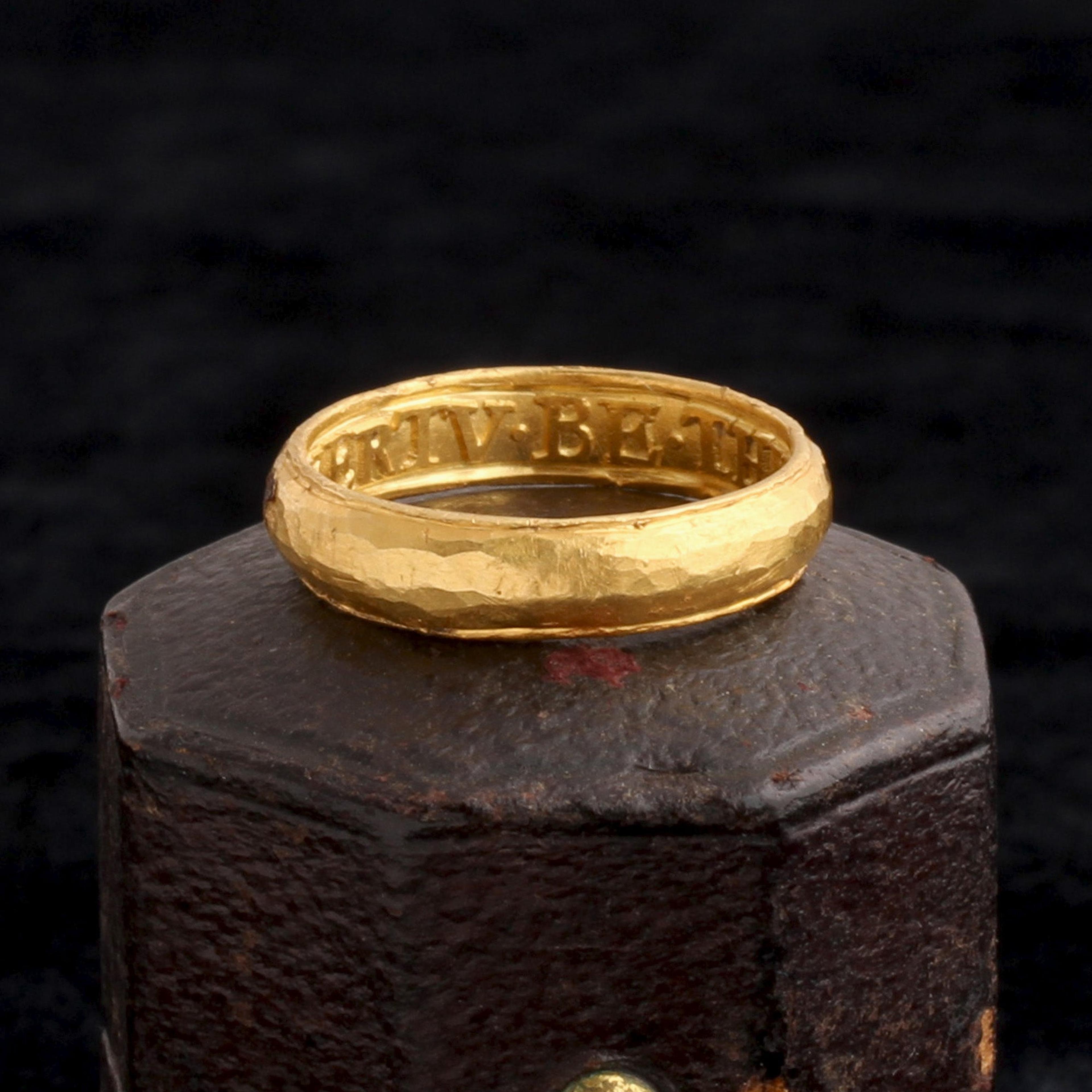 Unusually, the lettering of the inscription is in relief rather than raised. The idea with these “posy” or “poesy” rings is that the message inside was thought to be amplified when worn against your skin. Here, it almost seems as if the letters resemble movable type, ready to actually be imprinted upon your finger. It’s size 4.75, and cannot be resized.