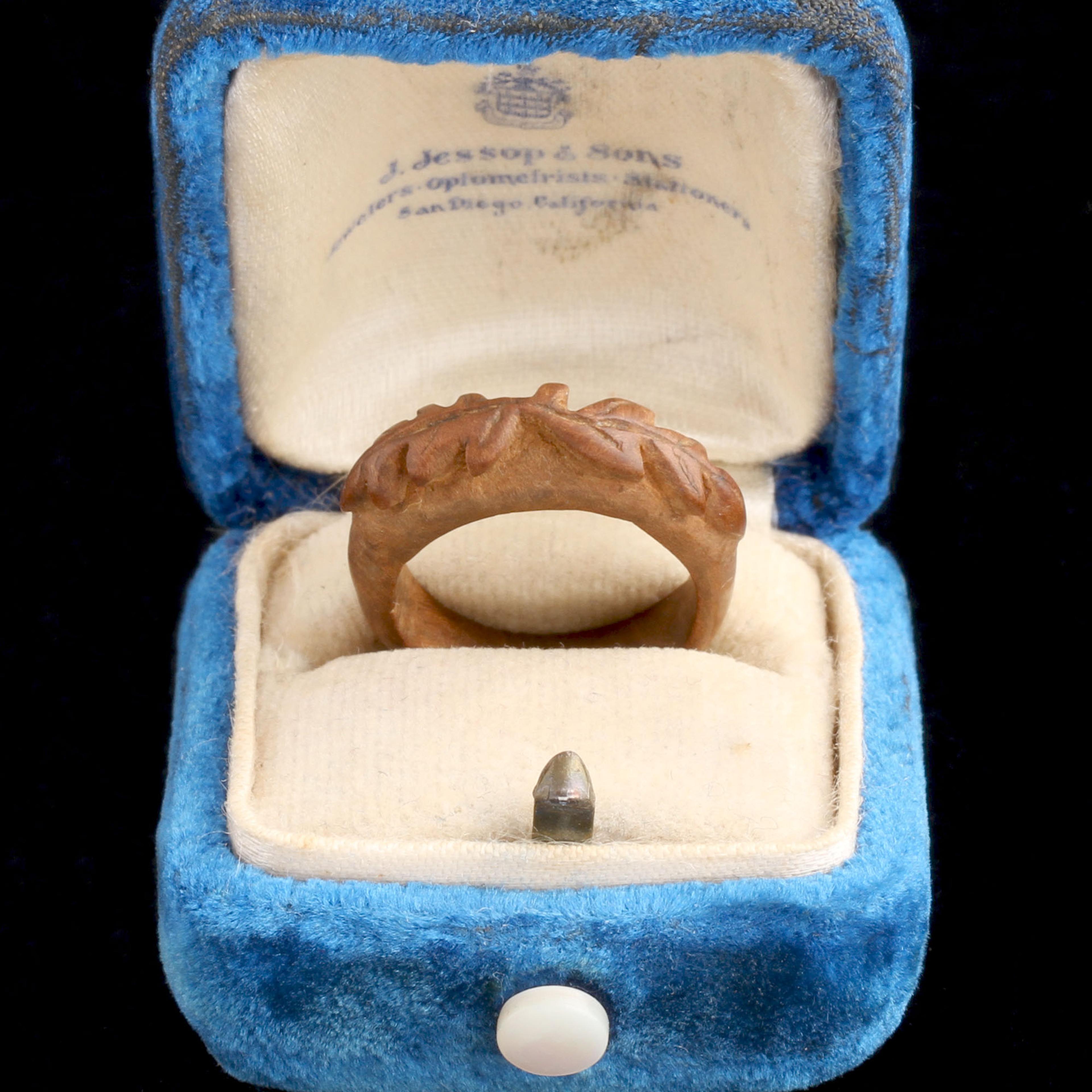 THE CHARTER OAK was an enormous, ancient tree in Hartford, Connecticut. Supposedly, in 1687, when the English crown tried to revoke Connecticut's colonial charter, local patriots hid the document inside the hollow of this tree to prevent its confiscation. The tree became a symbol of Yankee grit, defiance, and independence. When the immense white oak tree was finally blown down in a lightning storm in 1856, it was mourned as a national hero. Hartford held a public funeral. Craftspeople salvaged its wood to create keepsakes: gavels, chairs and jewelry. The relics were usually decorated with oak leaves, a symbol of strength and endurance. This ring is one of those rare surviving artifacts.