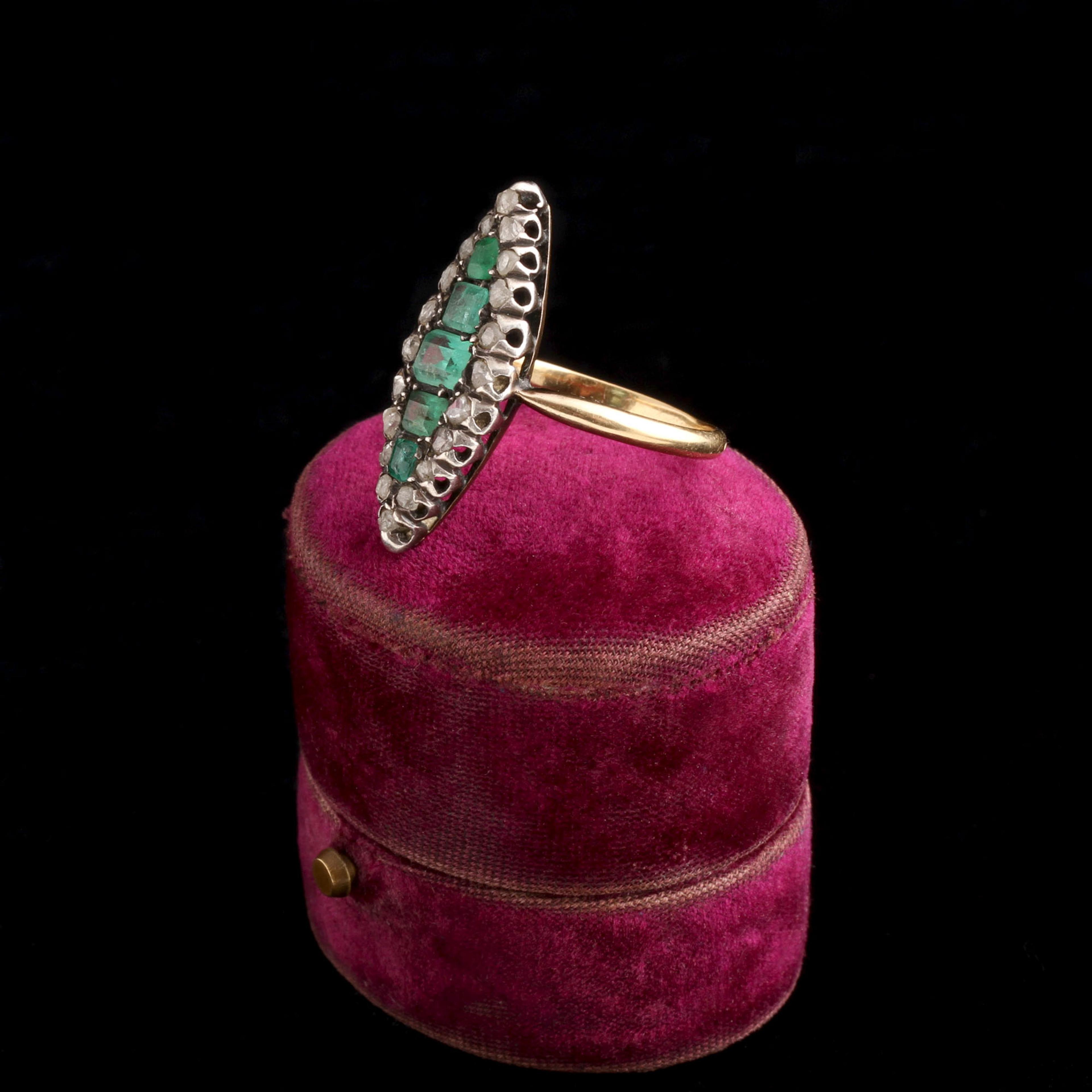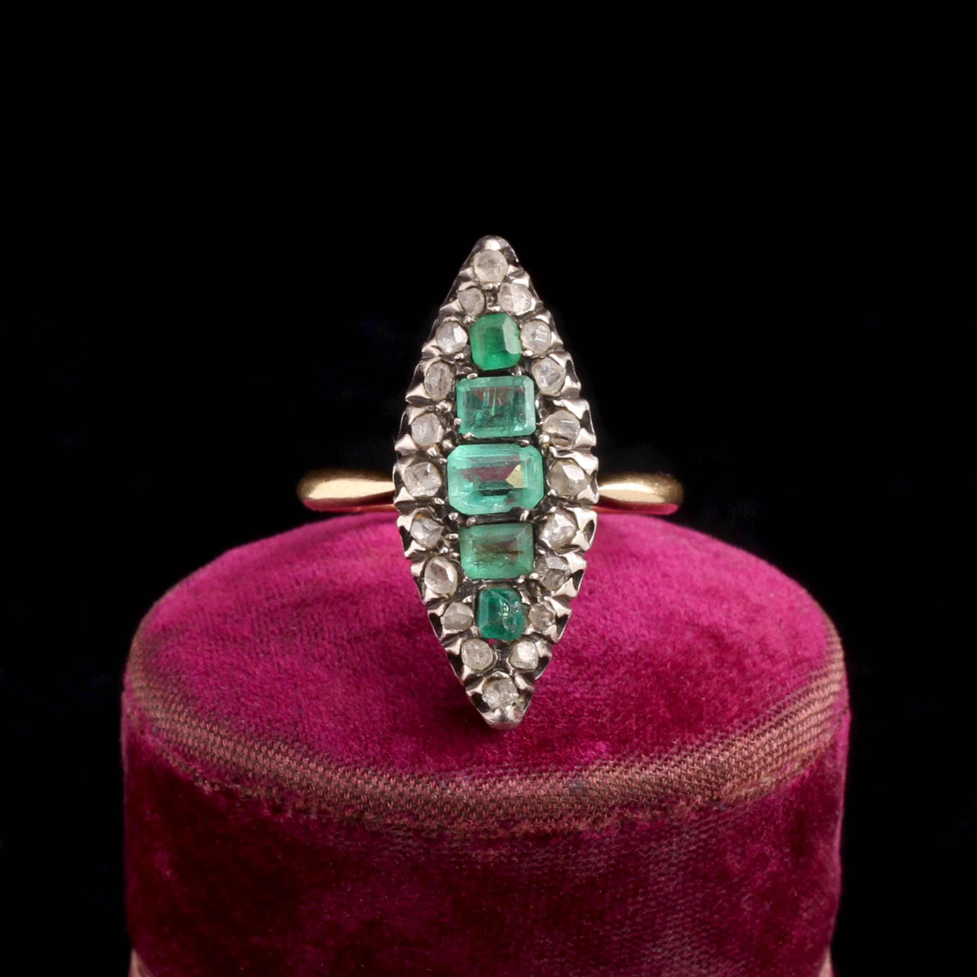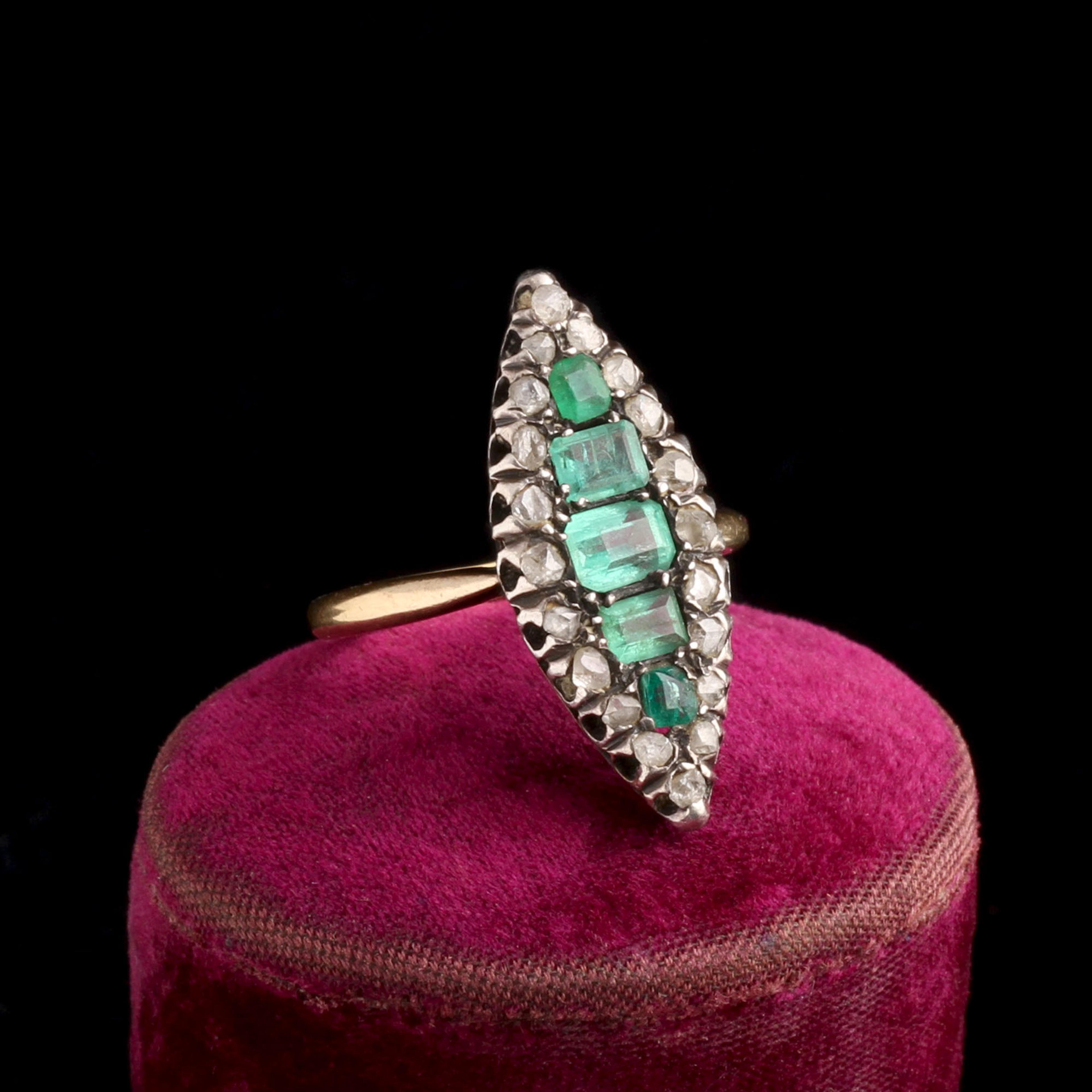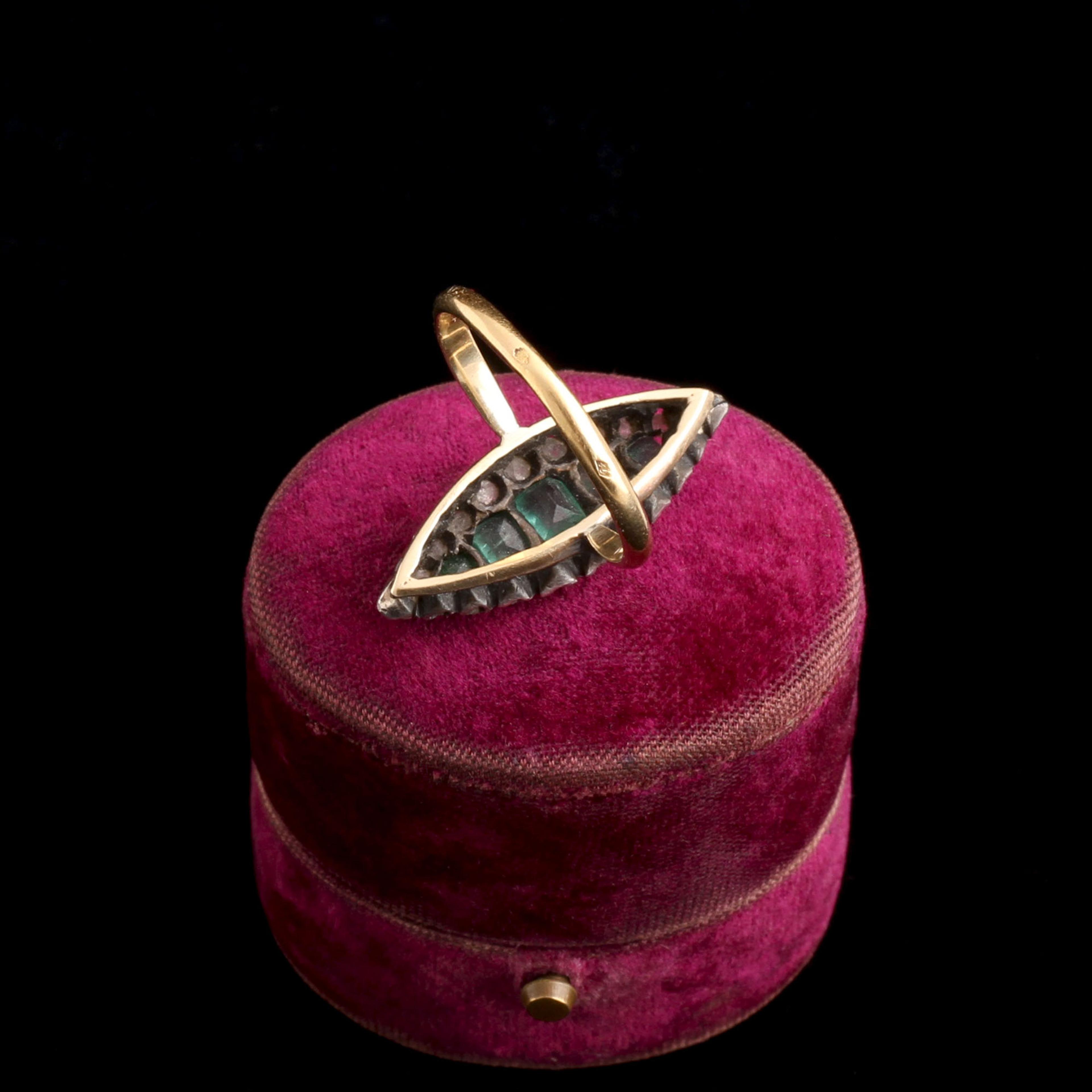 Equal parts goth and elegance, this mid 19th century ring in modeled in silver and gold with a navette-shaped face set with emeralds and rose cut diamonds. French hallmarks.