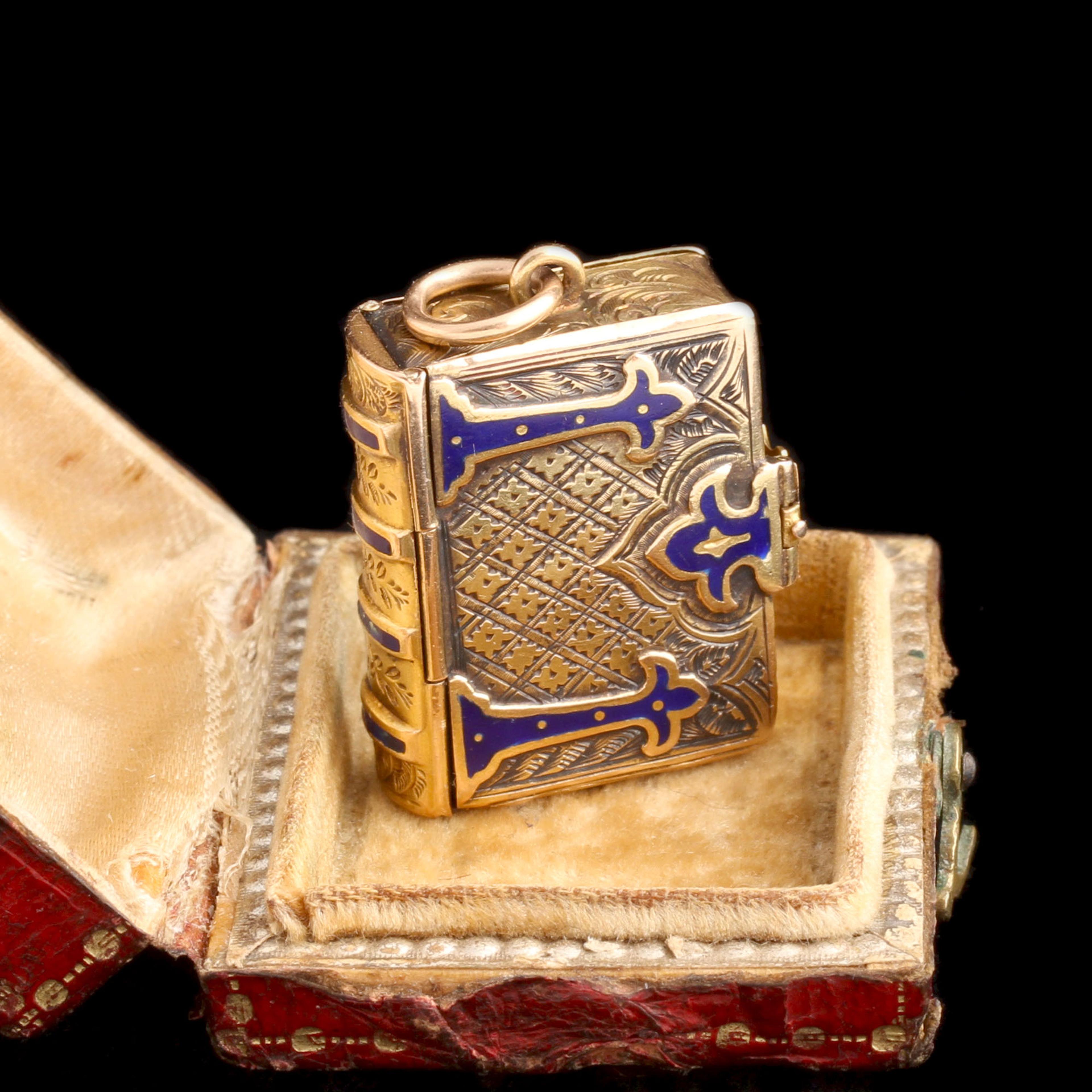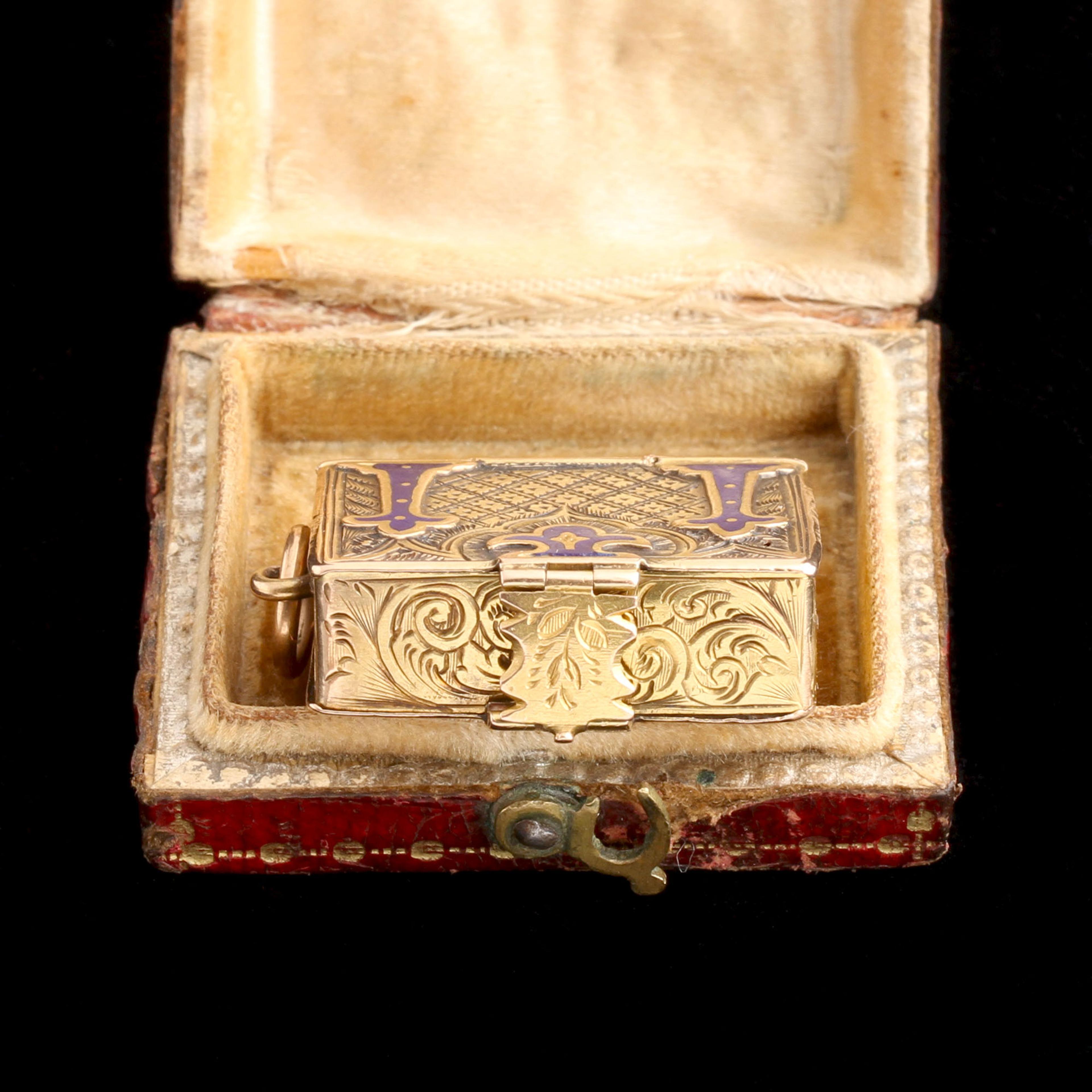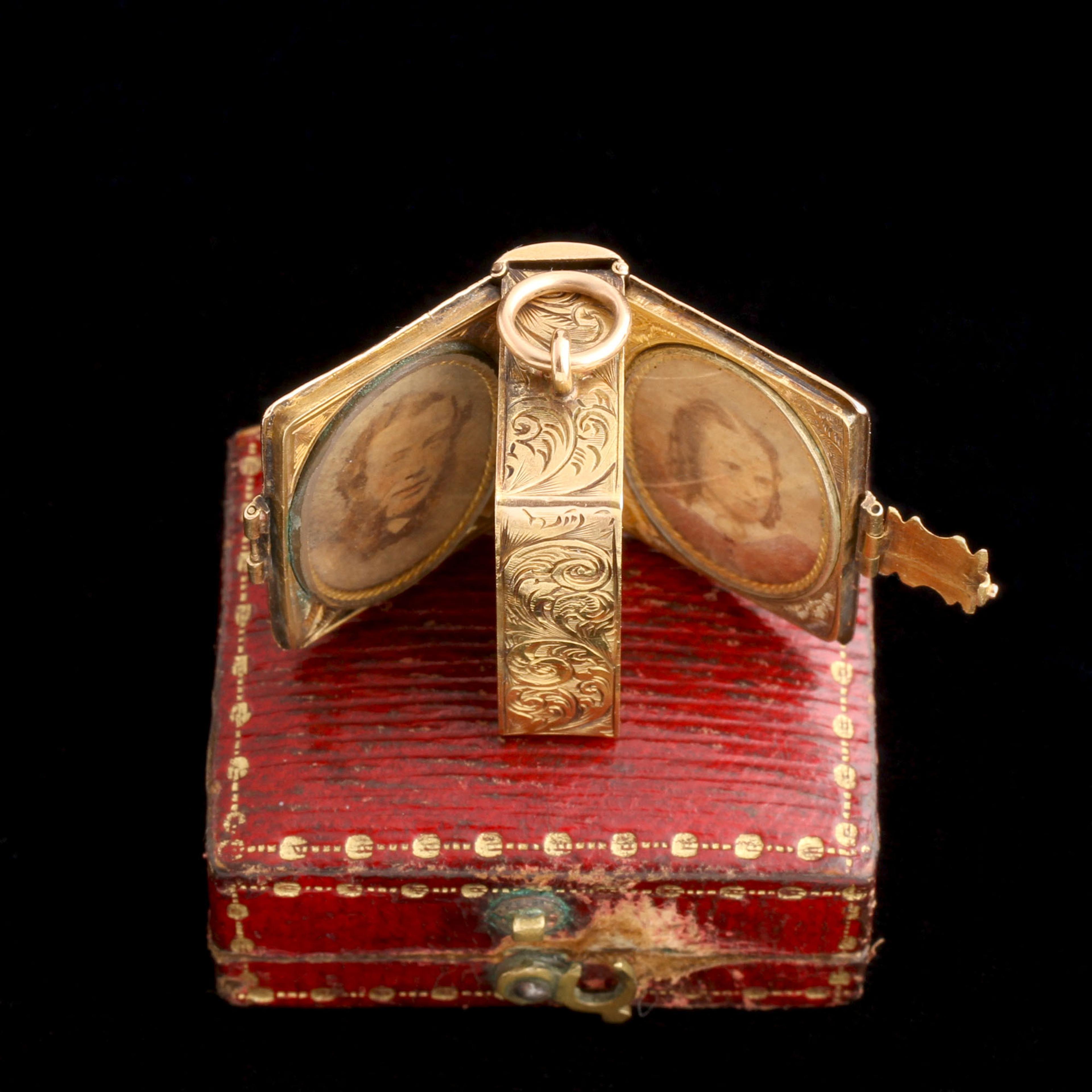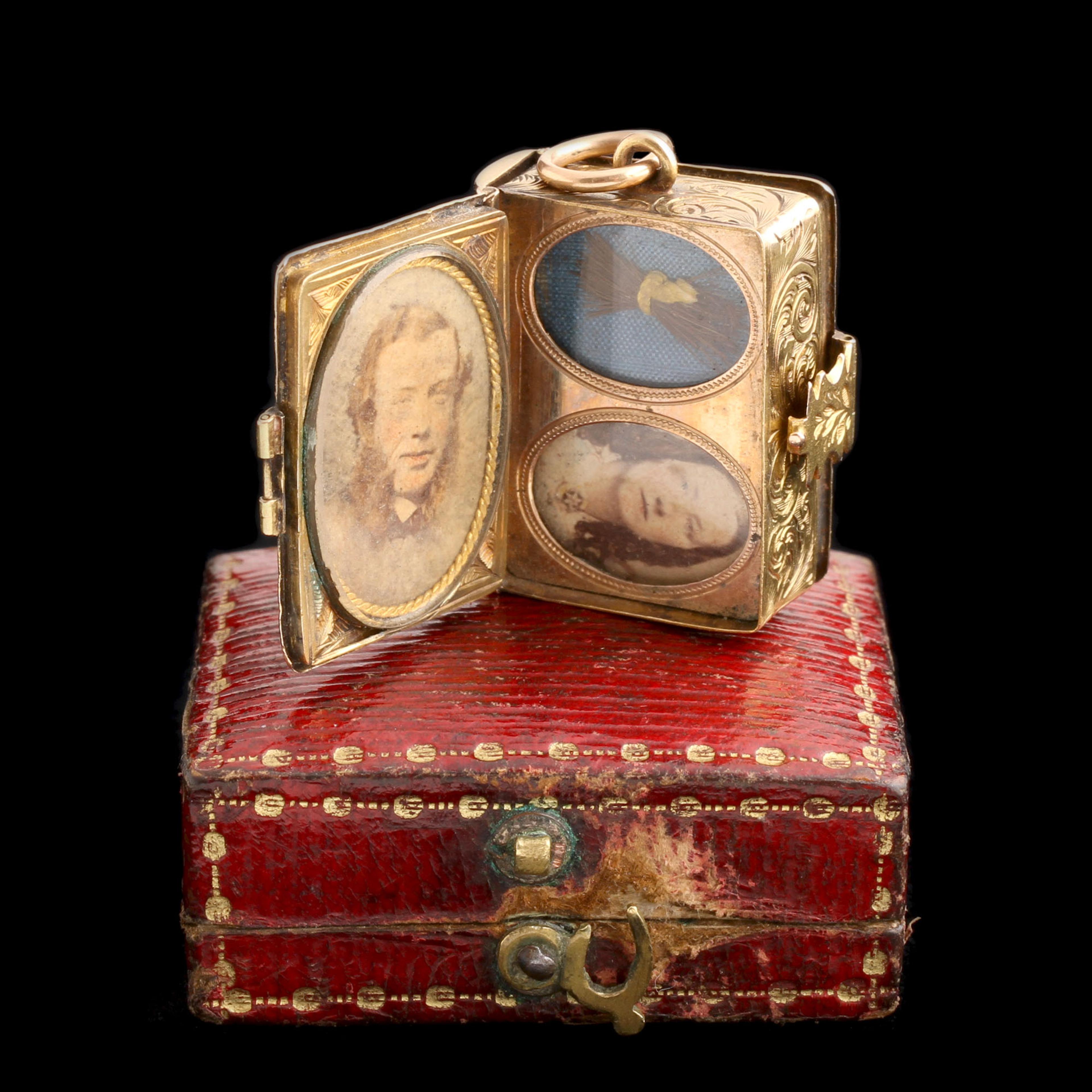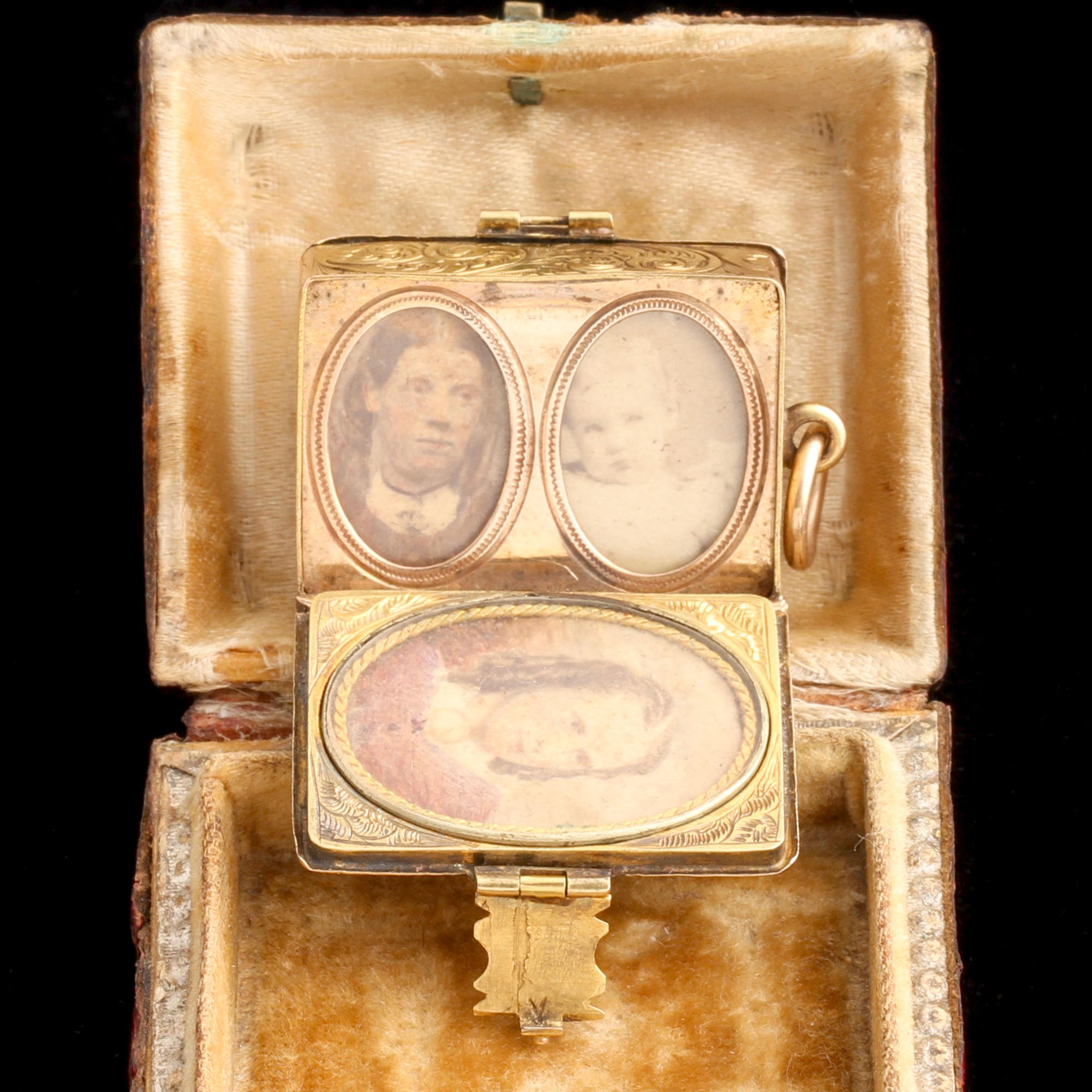 14k gold (tests), enamel, glass lenses, hand colored photographs, lock of hair, original leatherette box