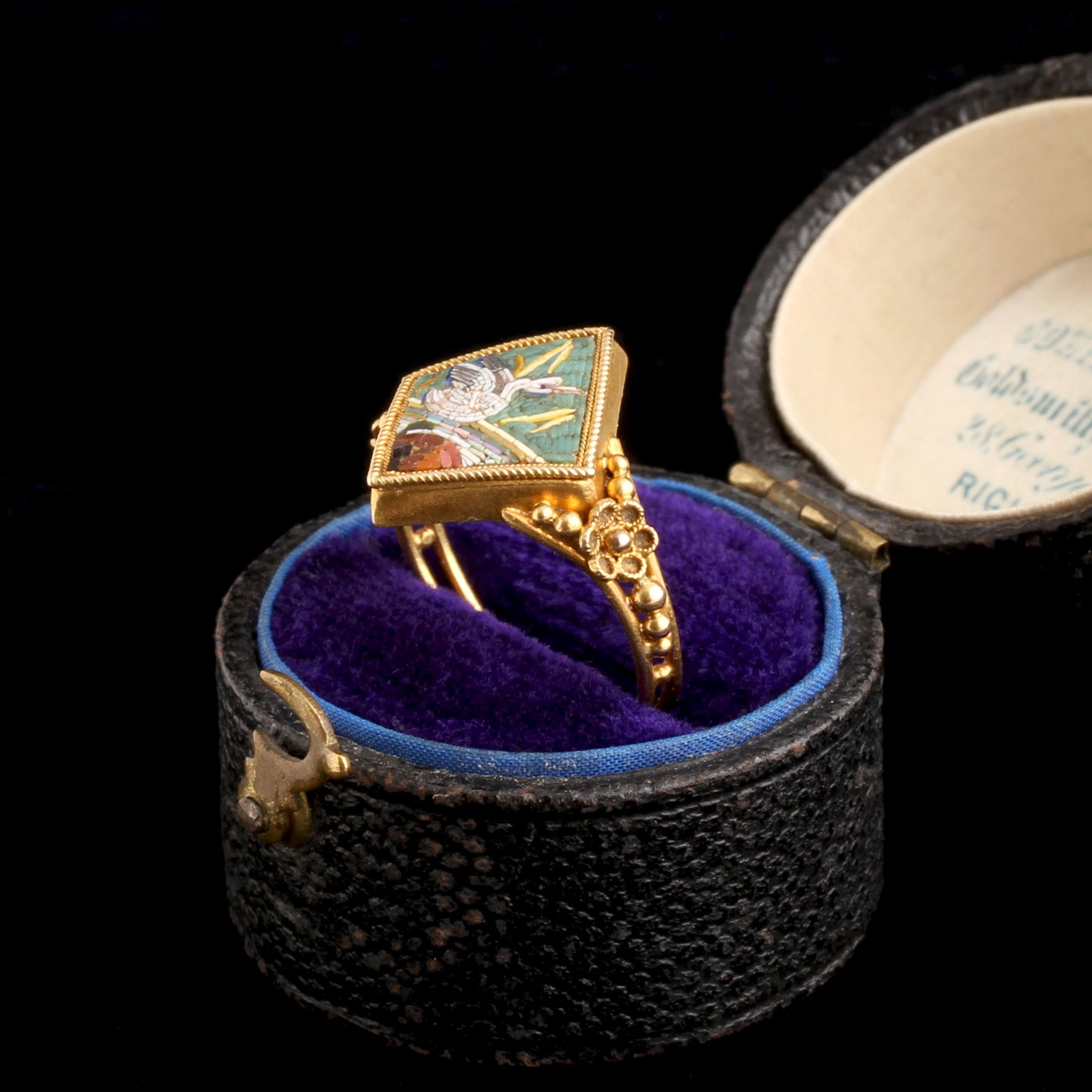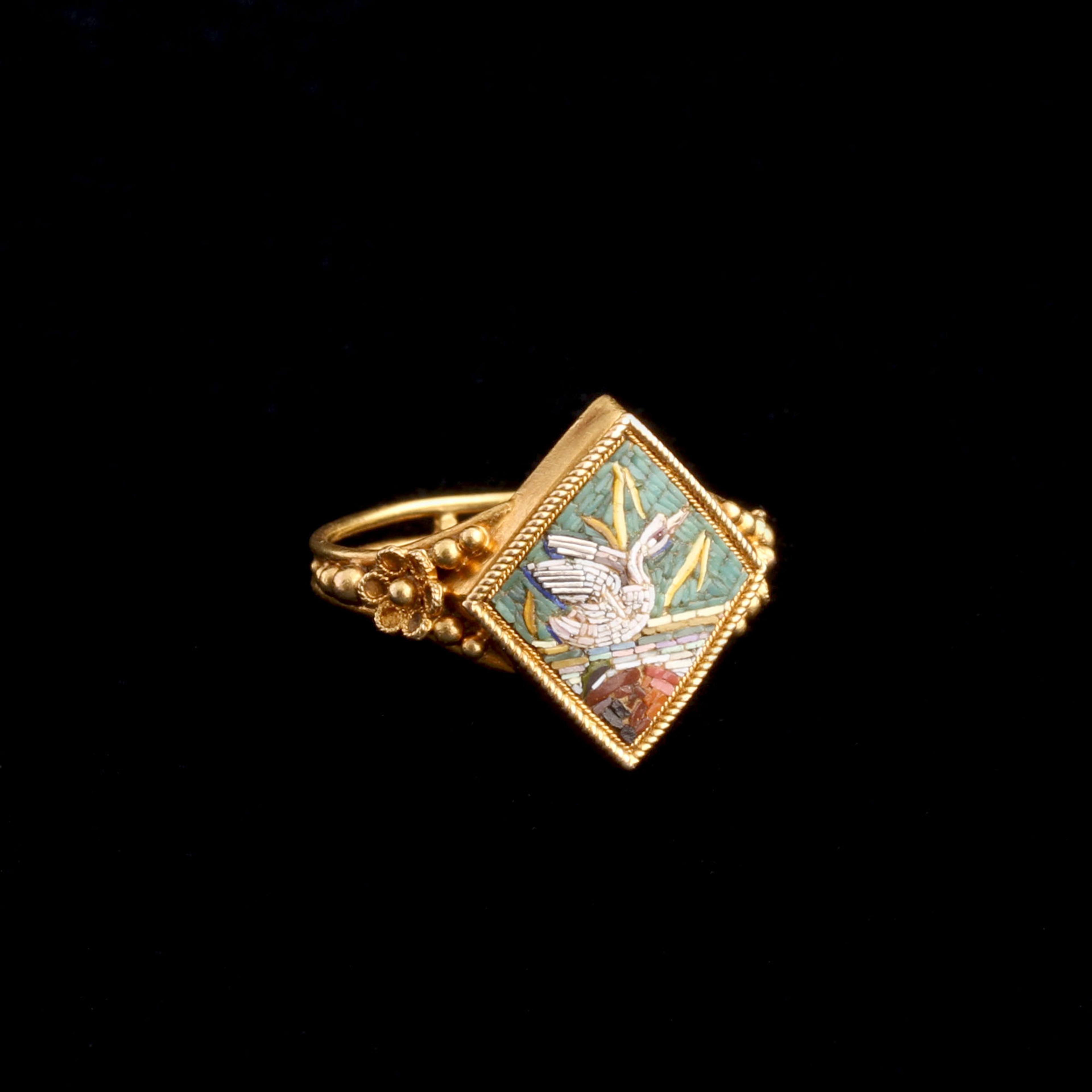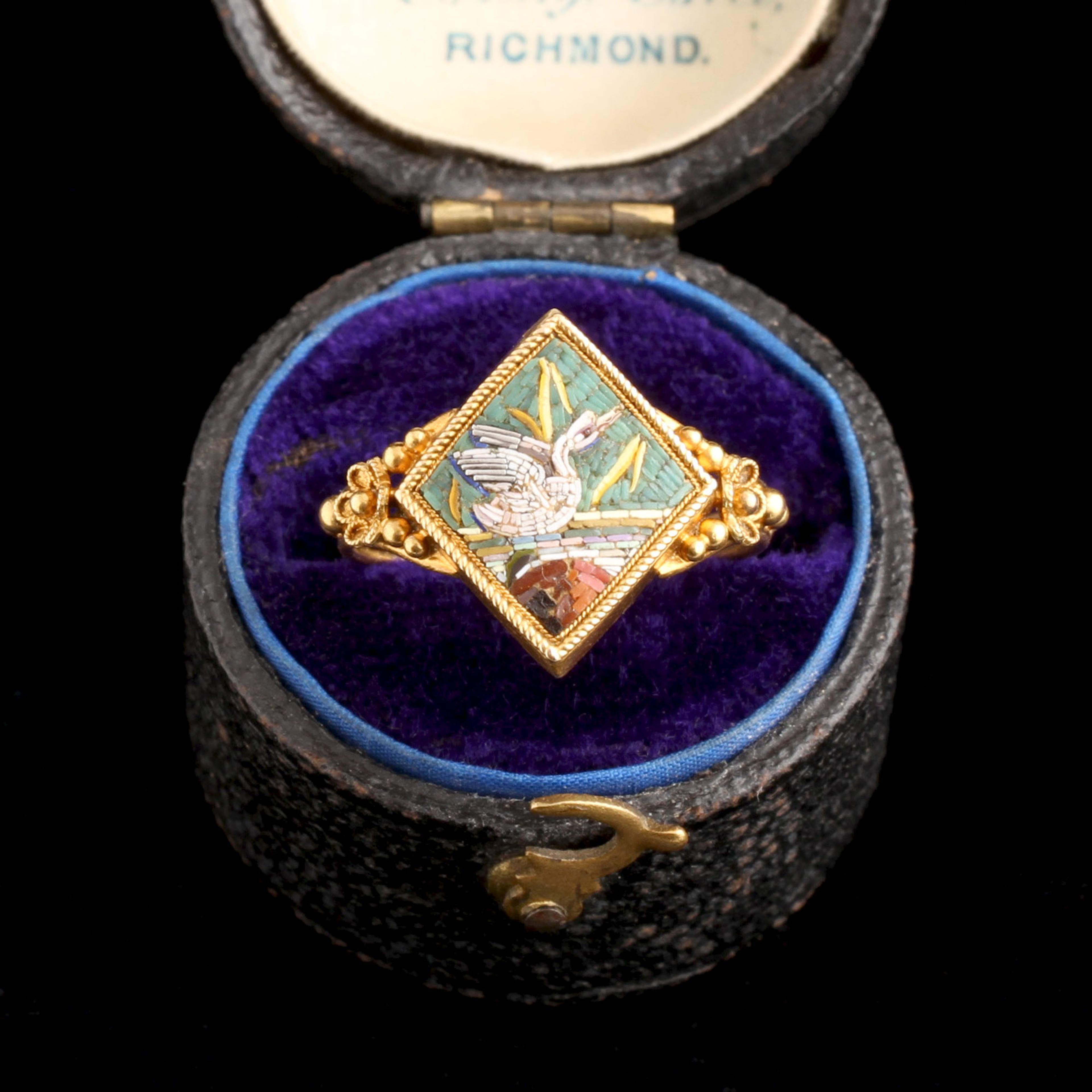 In Ancient Rome, swans were associated with Venus, goddess of love. They sometimes pulled her chariot - how sweet! The Victorians saw the swan as a romantic symbol, too. Swans mate for life, and so became shorthand for fidelity and lasting partnership. Here, set in an 18k gold mount with distinct Etruscan Revival detailing, glass tesserae form a scene of a swan settling onto water. Micromosaics, produced in Rome in the 18th and 19th centuries, were created from slender rods of colored glass (tesserae) sliced into teeny sections and set to form painterly images. The technique draws on ancient Roman floor mosaics and, by the mid-19th century, had become a hallmark of Neoclassical taste and Grand Tour souvenirs.