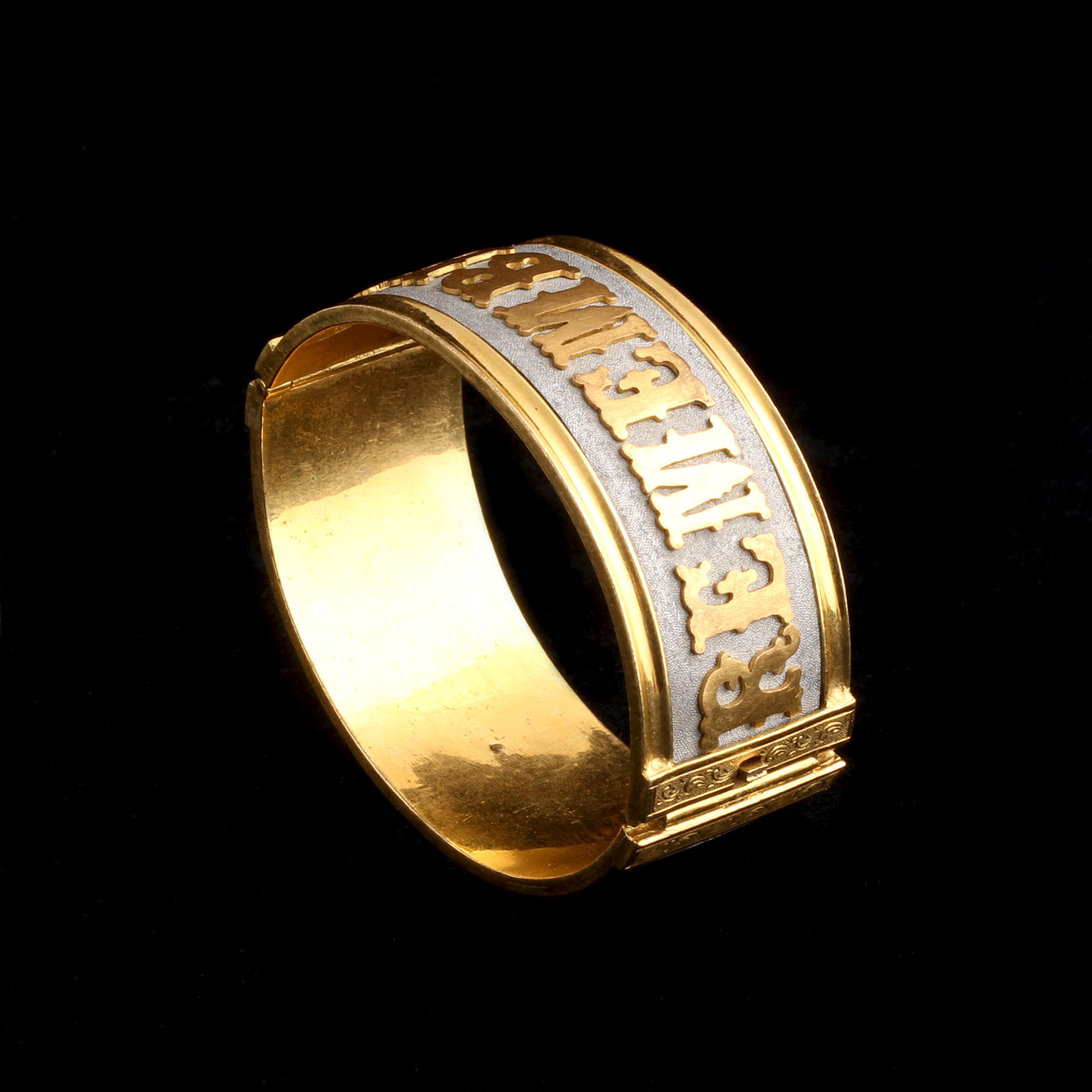 In the 1860s, aluminum - for a short period - was more valuable than gold. It was discovered in 1825, but it was difficult to extract before commercial electricity became available (around 1880.) And so for that short time, people made jewelry out of aluminum. This gilded bracelet is emblazoned "REMEMBER". I cannot overstate how rare this piece is. It was made around the time of the Paris Exposition in 1867, when all the newest inventions from around the globe were presented in one wild place.