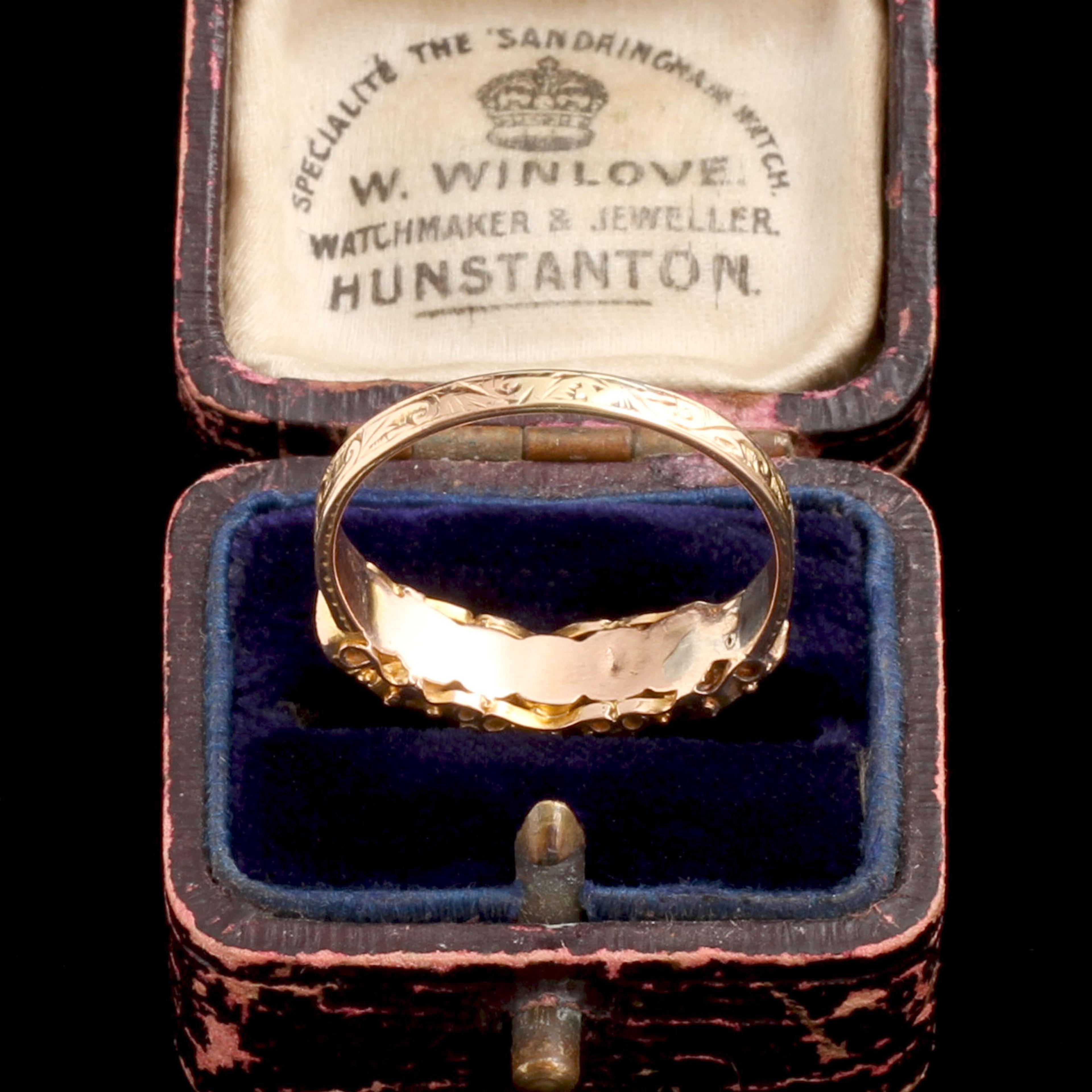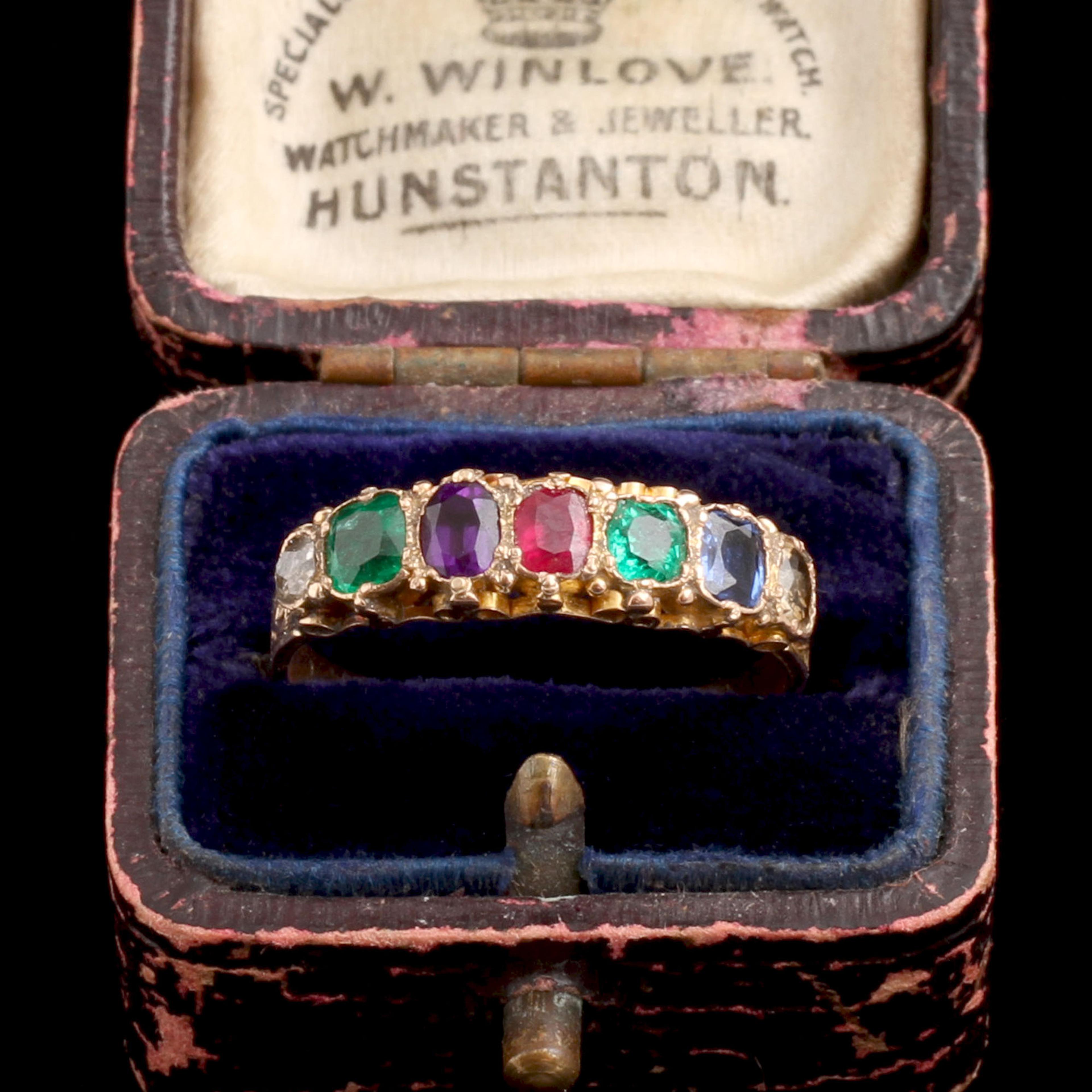 The tradition of assigning gemstones to letters of the alphabet began in France, where jewelers devised "acrostic" jewels that spelled out hidden messages of love. In 1806, Mellerio dits Meller - famed for outfitting Marie Antoinette - created an acrostic jewel that spelled out J'ADORE. The idea captured imaginations across Europe, and soon even those without royal jewelers could wear those coded adornments. In Victorian England, the most popular acrostic words were "REGARD", "ADORE", and most affectionately, "DEAREST". Here, a Diamond, Emerald, Amethyst, Ruby, Emerald, Sapphire and Topaz spell out "DEAREST" in the secret language of gemstones. Faint but legible hallmarks tell us it was made in Birmingham in 1865.