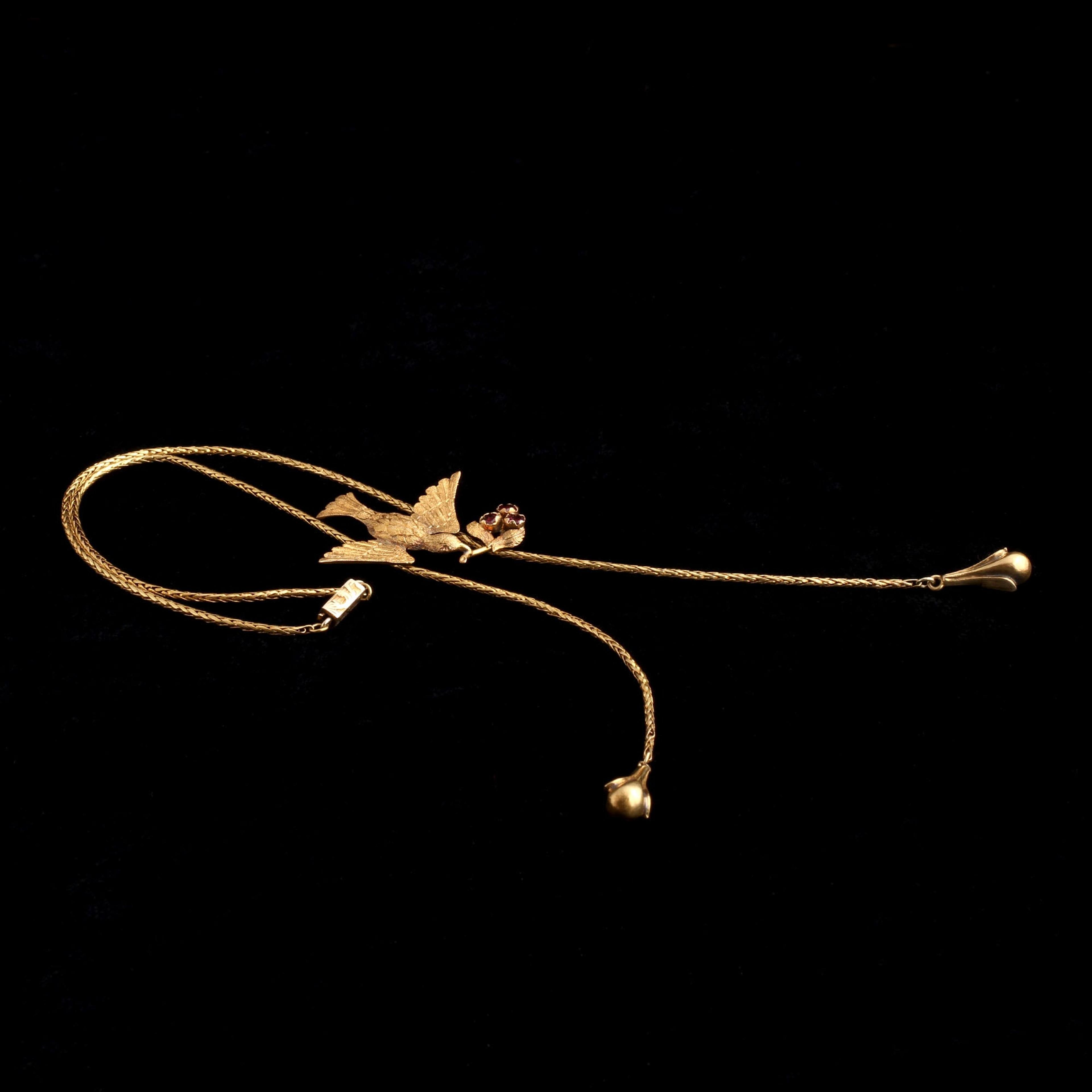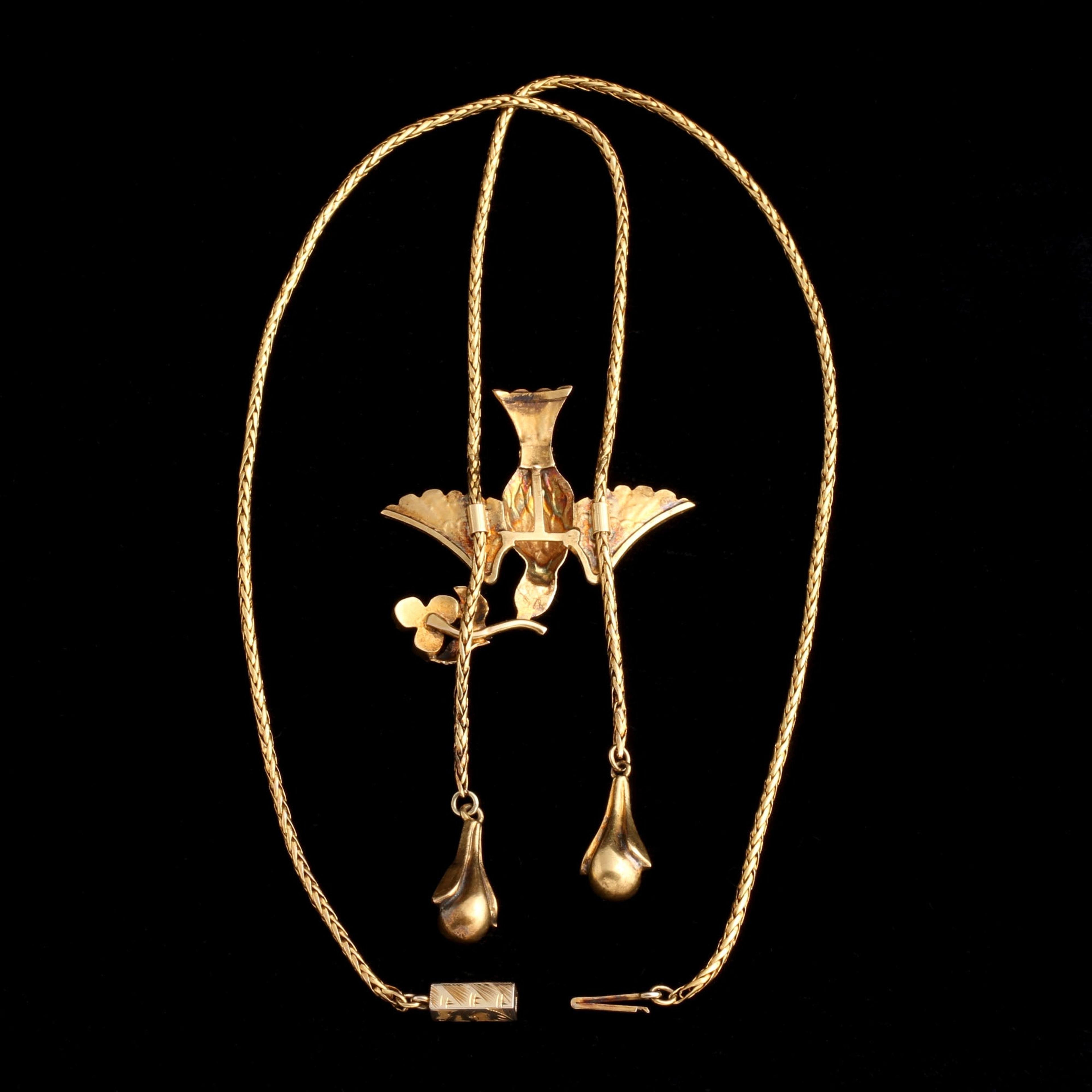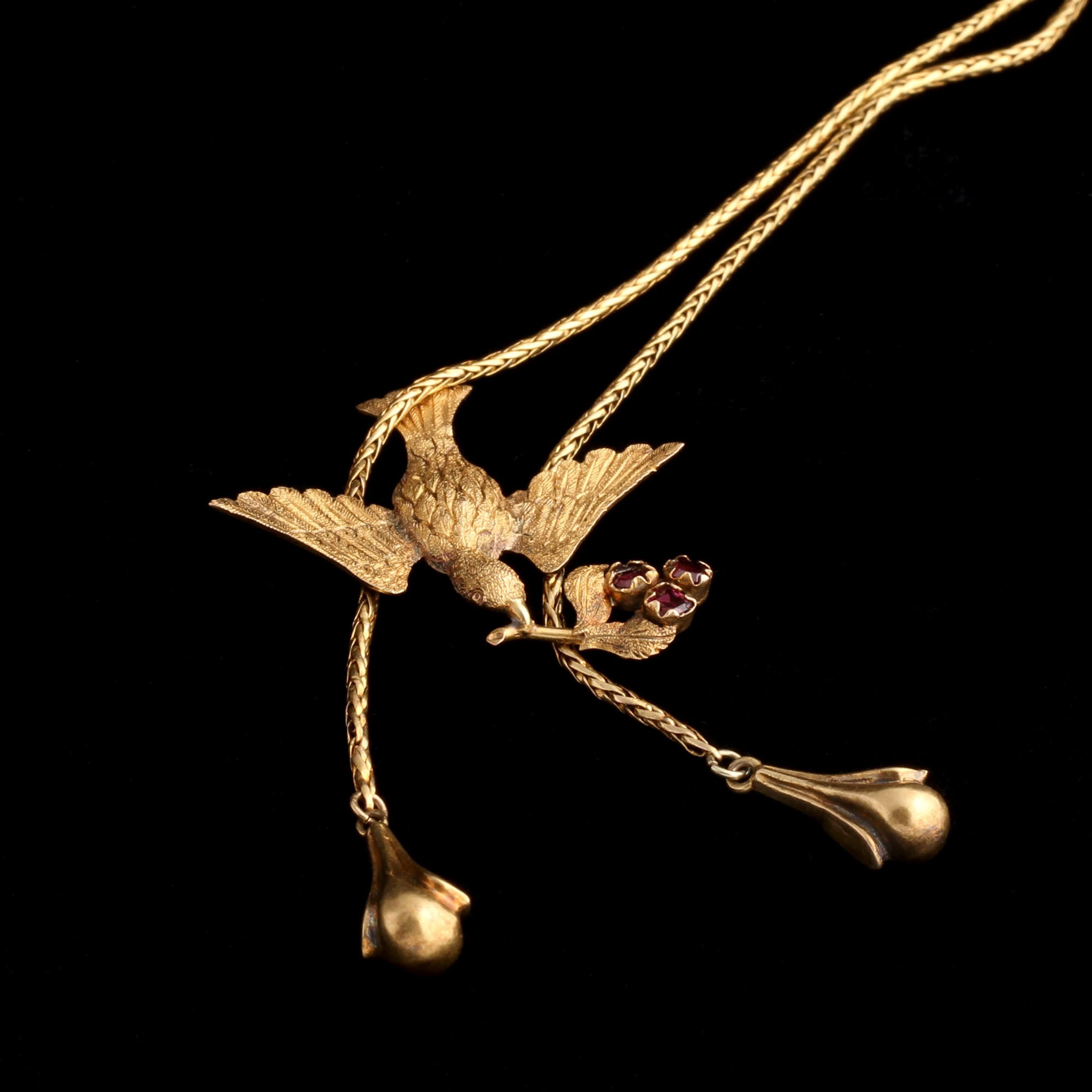 Symbolism in jewelry was by no means an invention of the Victorian age, however, the Victorians has a veritable obsession with hidden meaning and this period in history saw a dramatic expansion on the existing motifs previous centuries. In addition to the serpents, moons, wheat, etc of the past, they added a language of flowers, as well as a language of gems (acrostic jewelry), and imbued a vast array of fauna with sentiment. This exquisitely rendered dove with a flower in its beak was employed as a symbol of a few different things, it could mean love and fidelity, peace, or it could be a representation of the Holy Spirit. This dove is also a slide which allows you to adjust the length on this négligée style necklace.