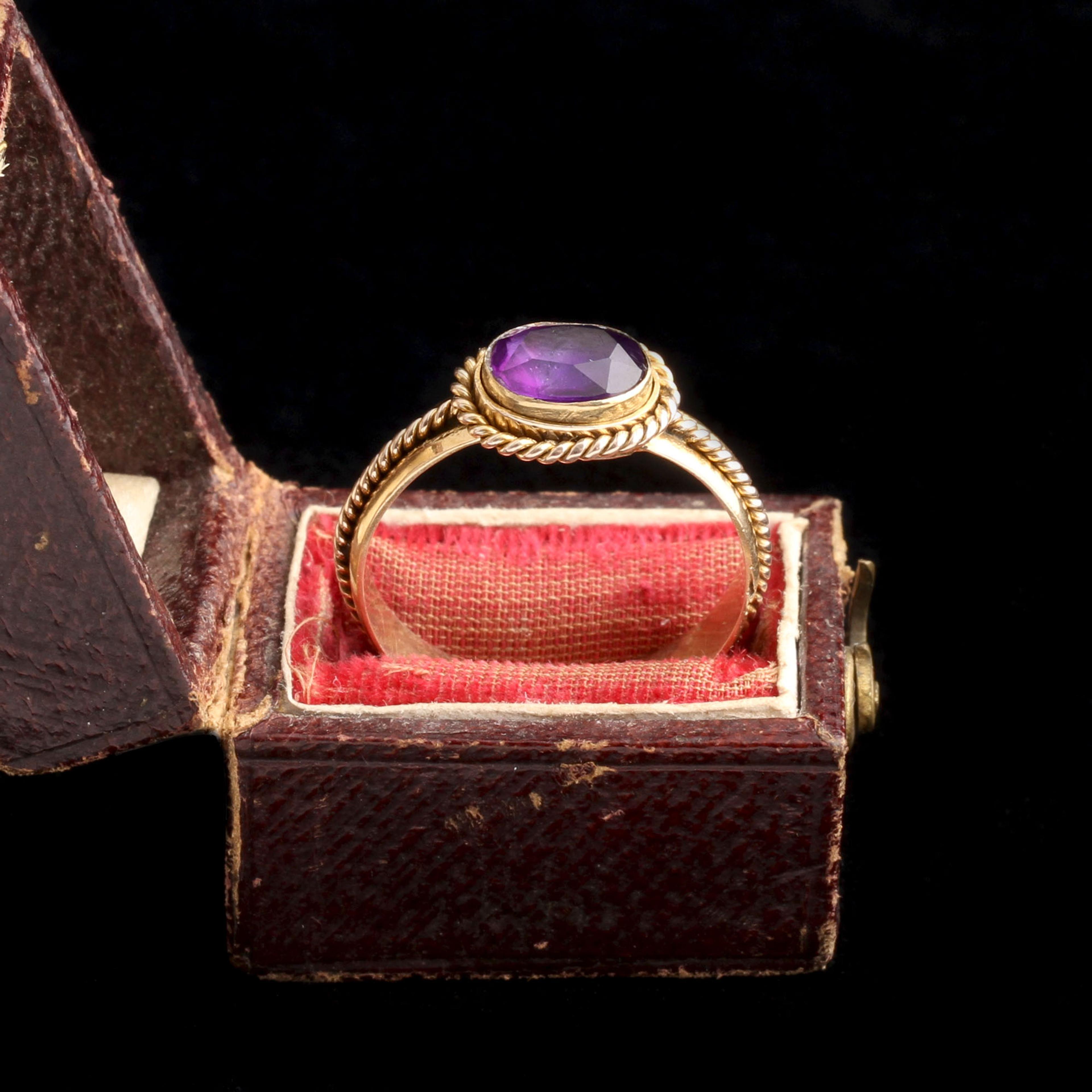 A mid Victorian (Etruscan revival vibes) ring modeled in gold with an east-west oriented amethyst. Twisted wire accents halo the the setting and shank.