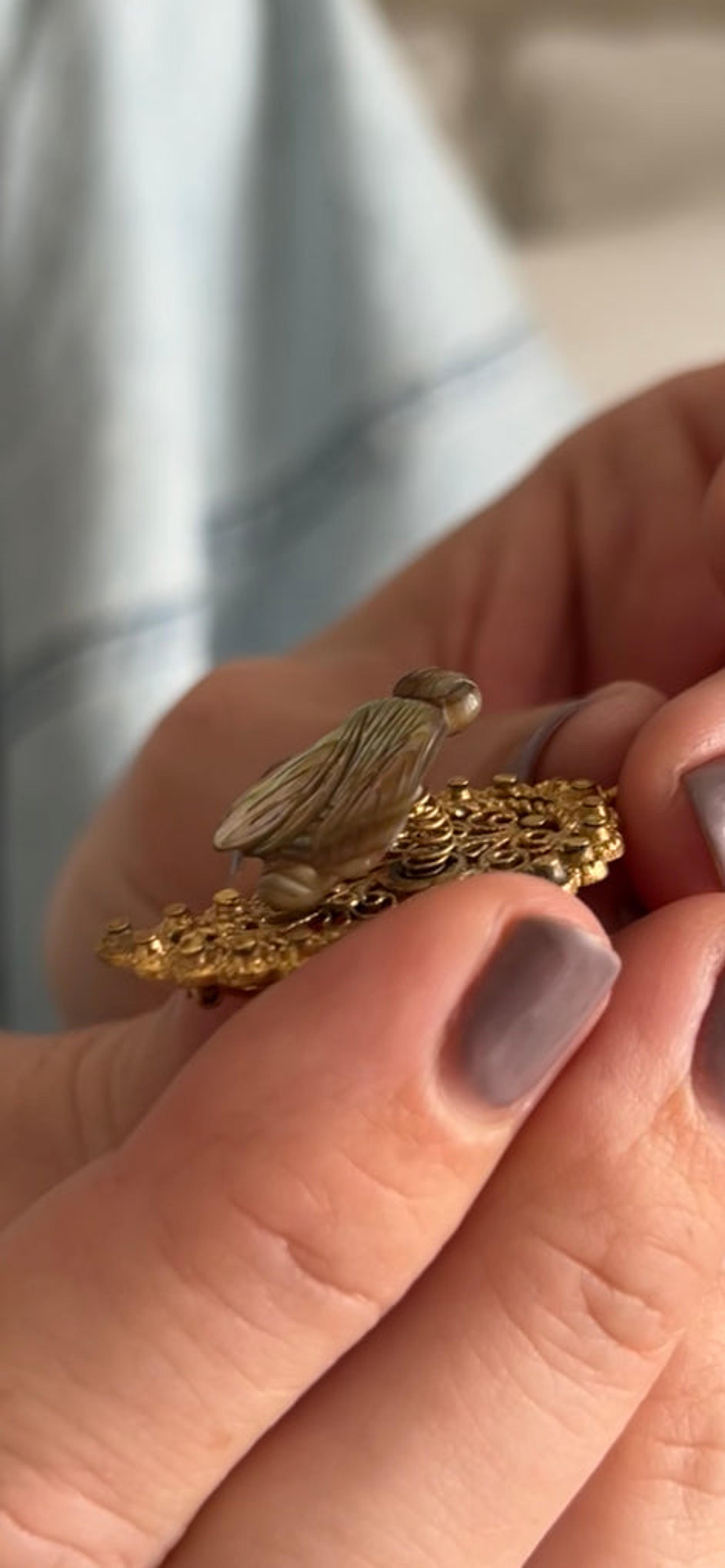 The dynamic design of this brooch is known as en tremblant (French for "to tremble"). These kinetic jewels feature elements attached to a trembler—a material that acts as a spring—to create lively movement in the jewel as it is worn. This 19th century example features a carved mother of pearl fly resting off of a gold, teardrop shaped base with lovely filigree and detailing. Gilt base metal, 1 1/2" long.