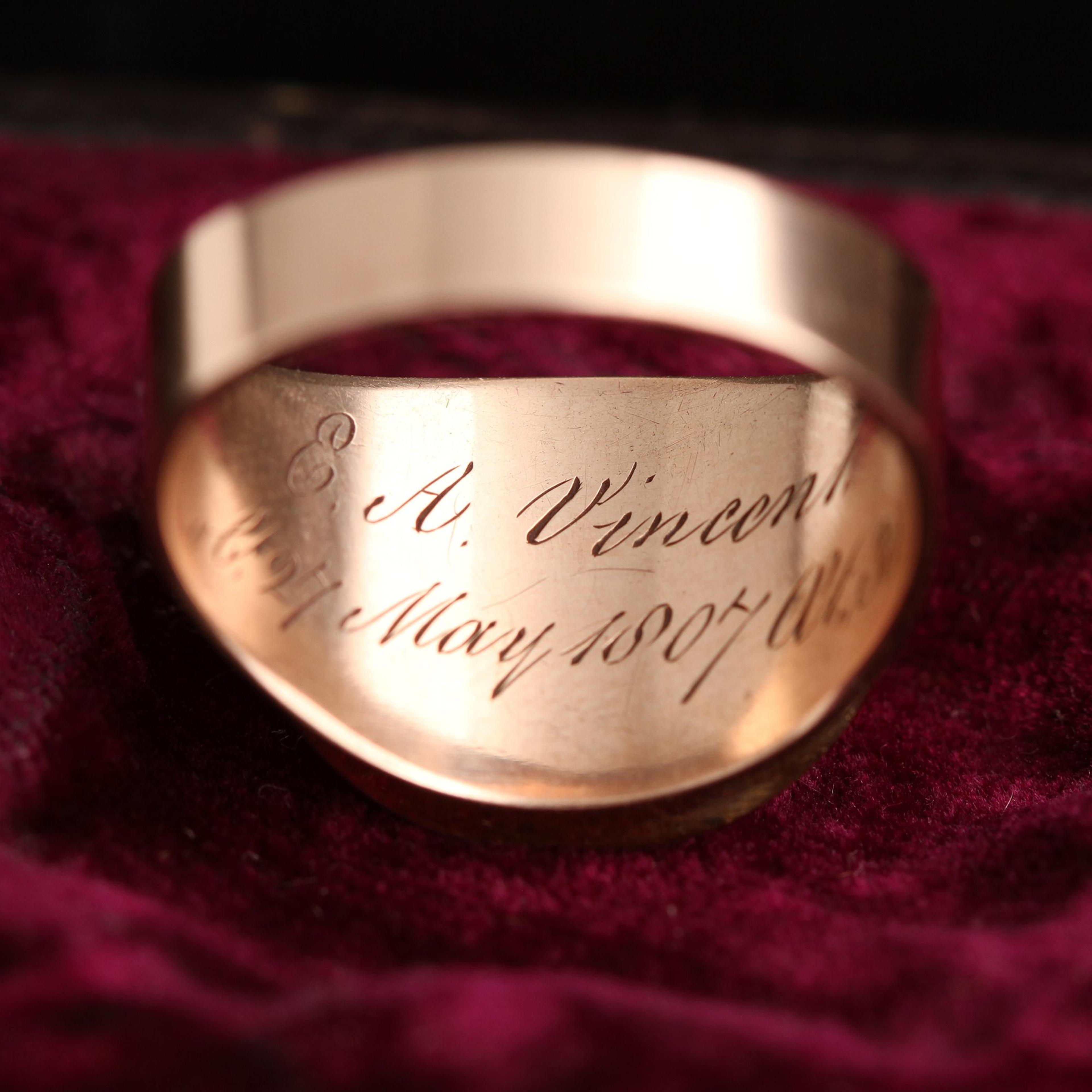 This gold and enamel Georgian mourning ring is modeled in a cigar band shape with lovely plain weave hairwork encased in rock crystal at the face. The hair locket is framed in white enamel (indicating that the deceased was unmarried) with the words “Not Lost But Gone Before.” The reverse of the head is engraved “E. A. Vincent ob 27 May 1807 At 30.”