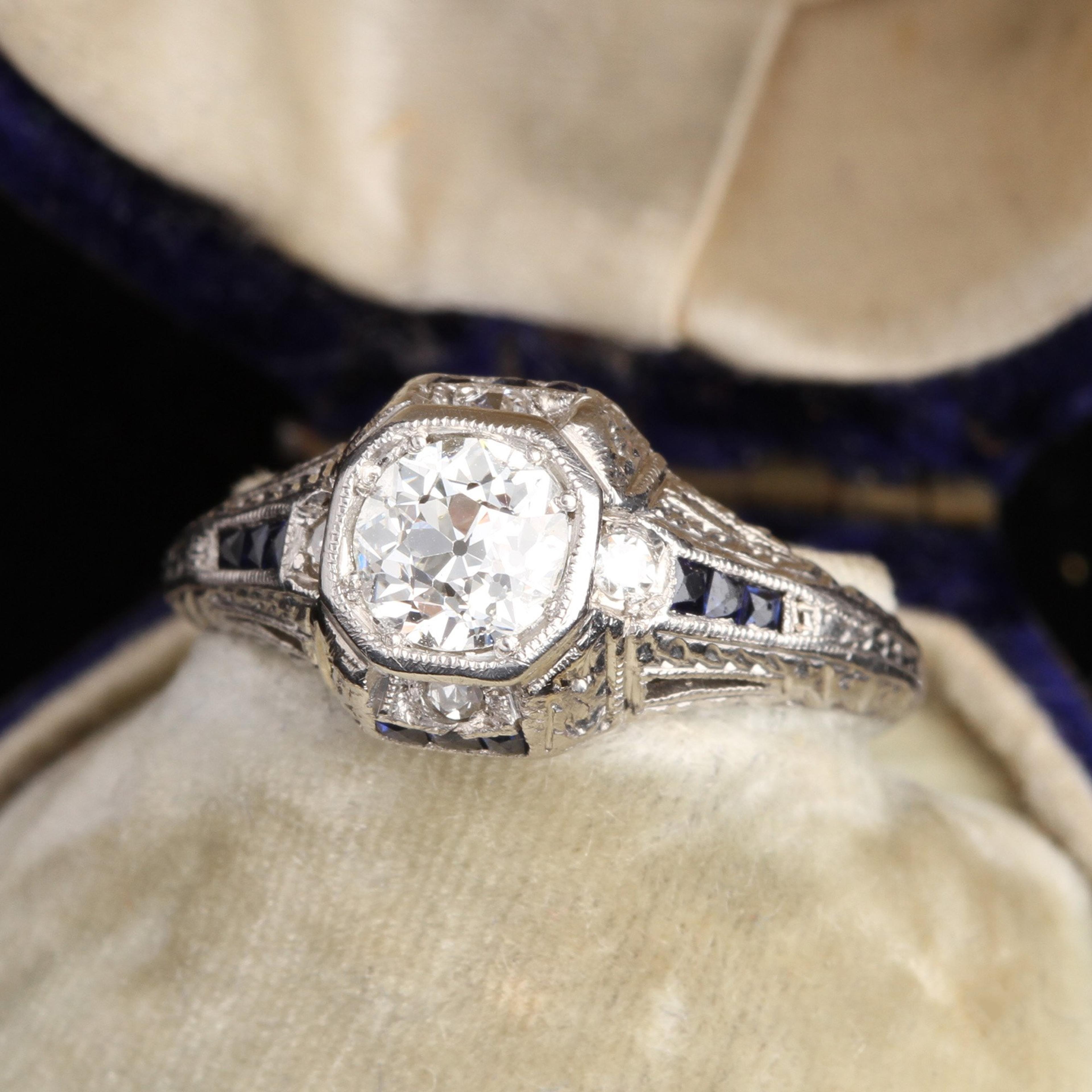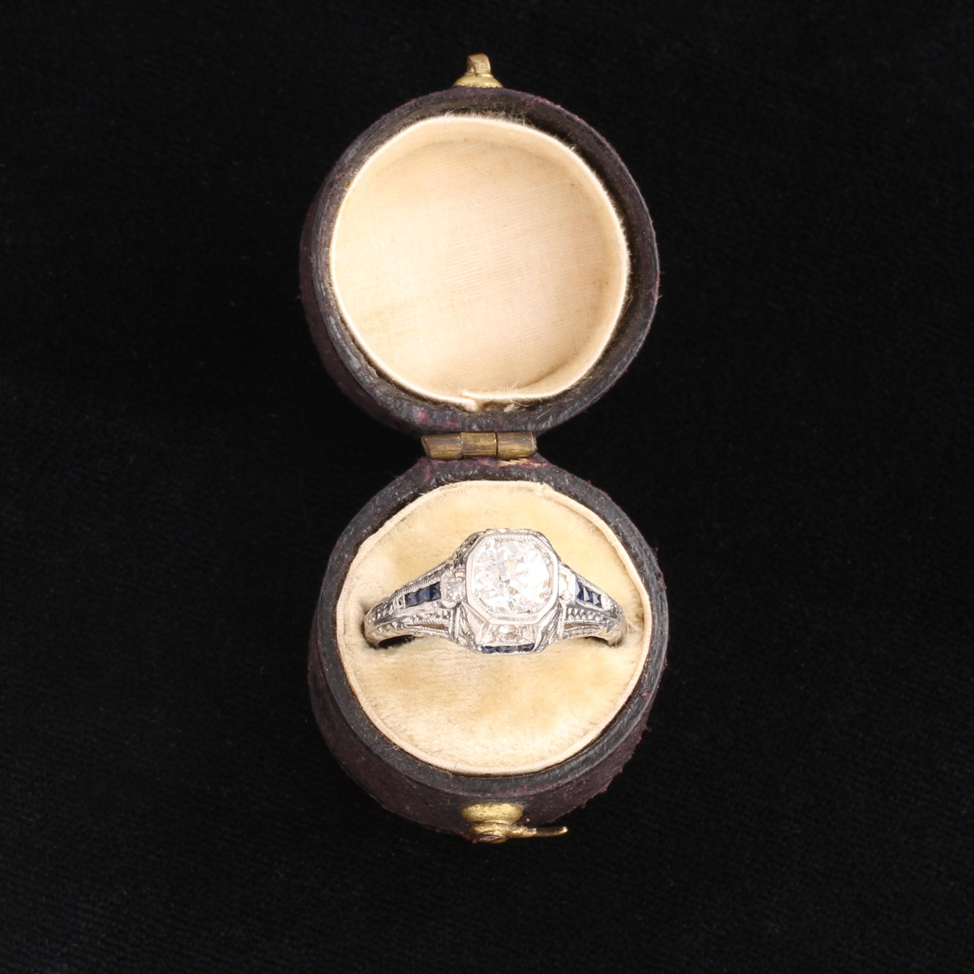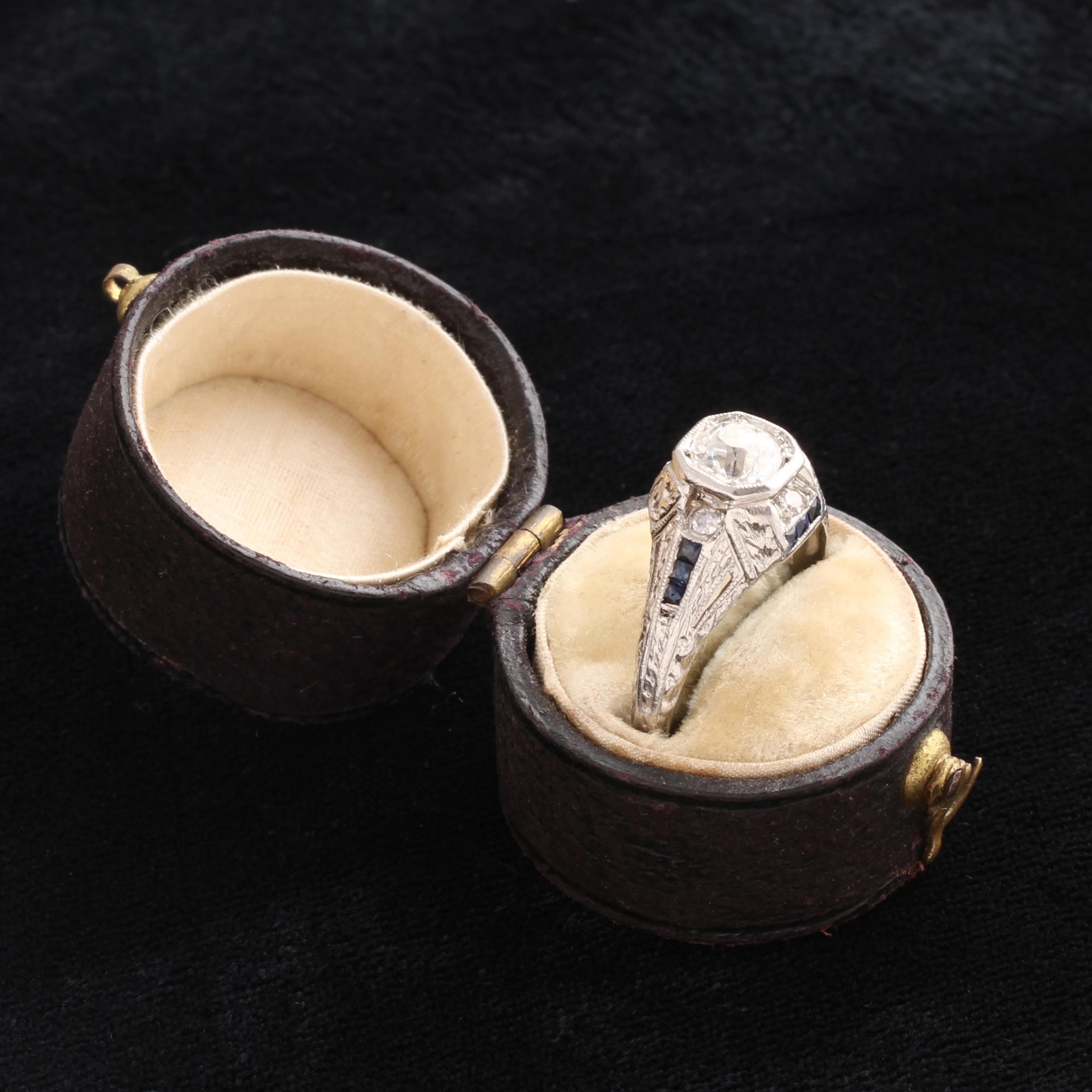 This Art Deco ring is made in platinum with a bright .63ct old European cut diamond sparkling from within an octagonal frame. Single cut diamonds accent each cardinal point of the face and stripes of French cut synthetic sapphires lend an element of dynamism to the gallery and shoulders. Foliate engraving with milgrain accents put it over the top.