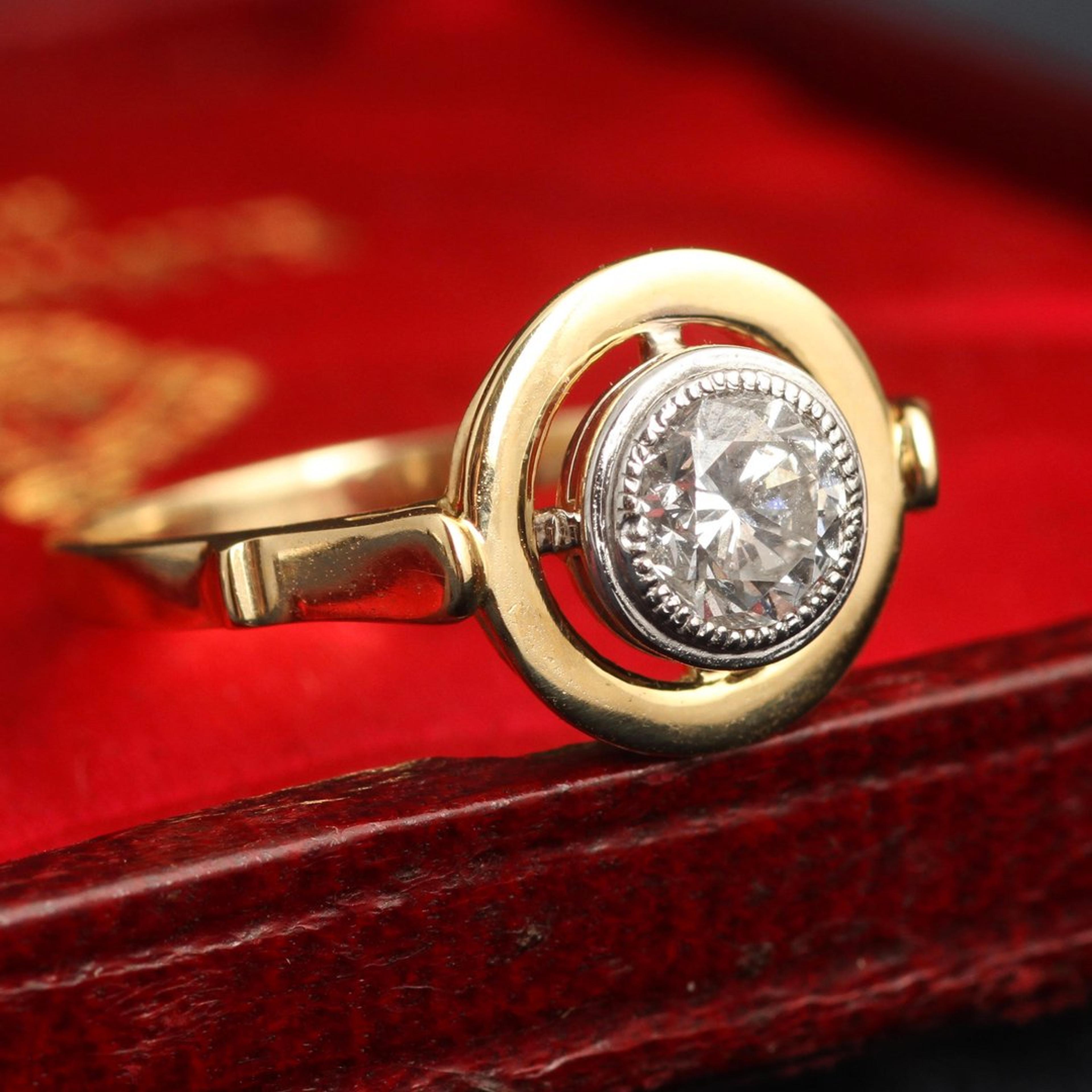 This modernist-style solitaire sparkles with an approximately .50ct old European cut diamond in a two-tone 18k gold mounting. Set in a milgrain-edged white gold bezel, the bright stone is secured by golden crosshairs within its yellow gold halo. The face of the ring is offset by gently angled shoulders and features a 1.8mm flat hoop.