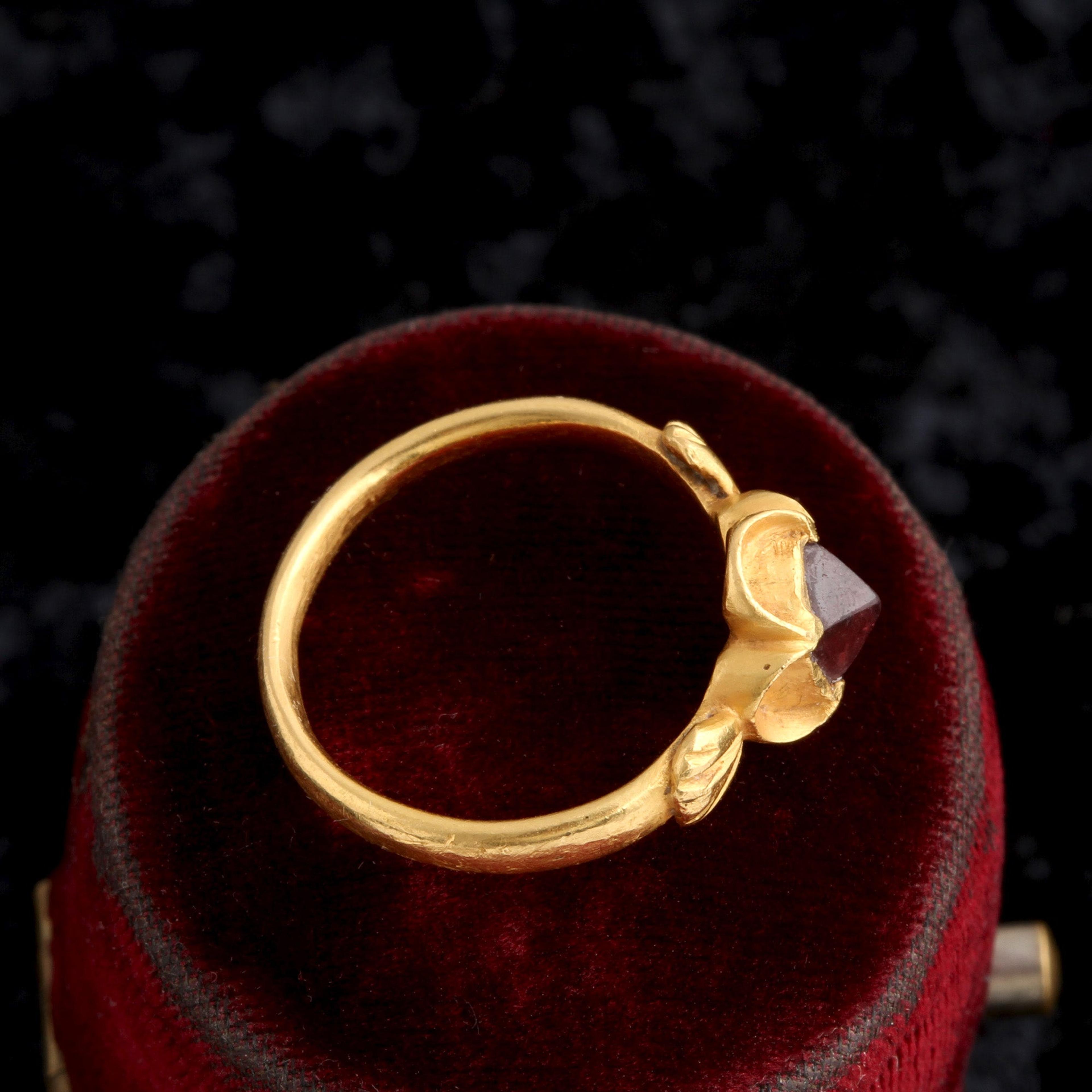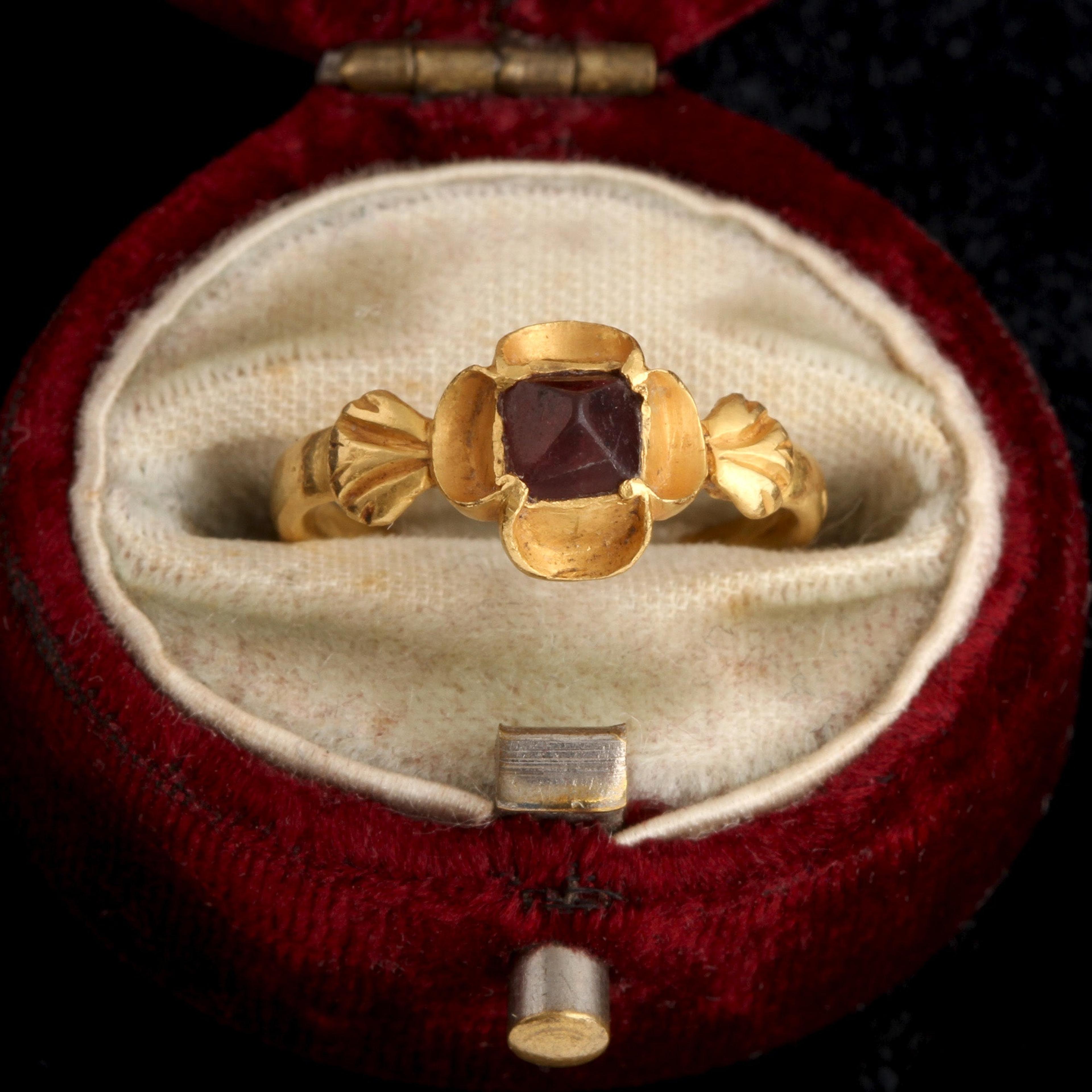 What was happening in the world around the time that this ring was made? Vasco de Gama sailed to India, Leonardo da Vinci painted the Mona Lisa, Henry VIII became the King of England and the Protestant Reformation began. Somewhere in the midst of all of that, this outstanding post medieval ring was made. Fashioned in 22k gold, the ring features a quatrefoil face set with a point cut garnet and belled foliate shoulders. c. 1500.