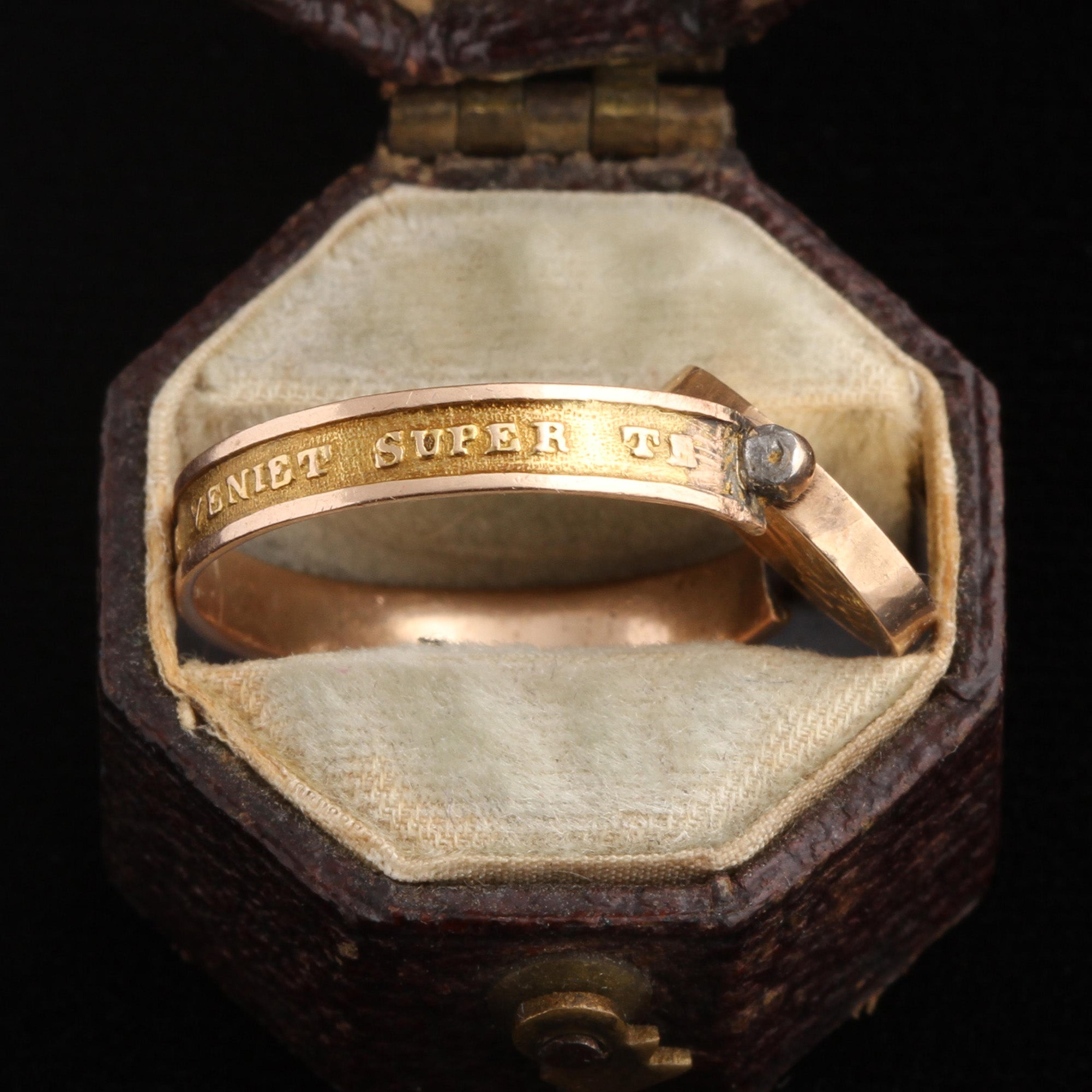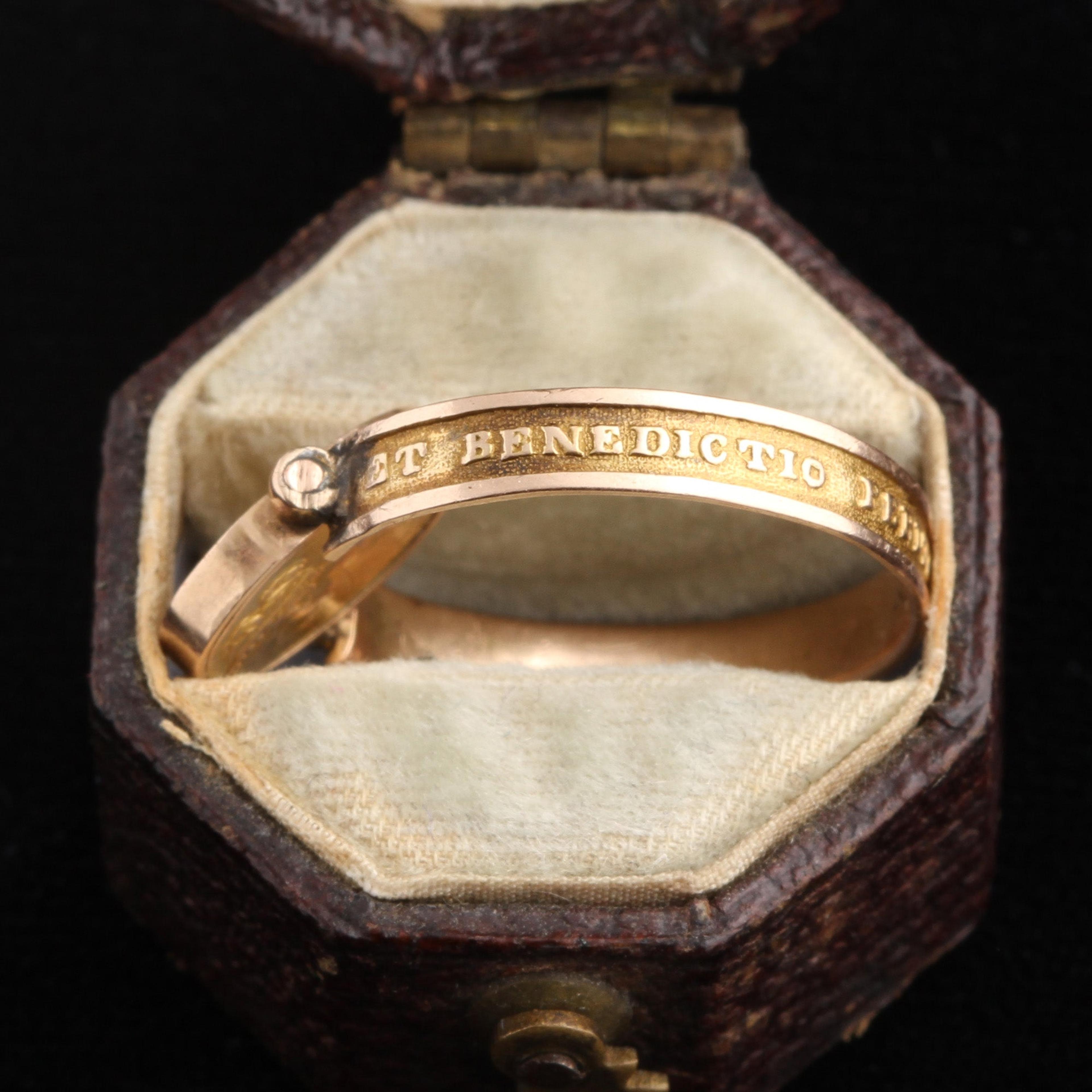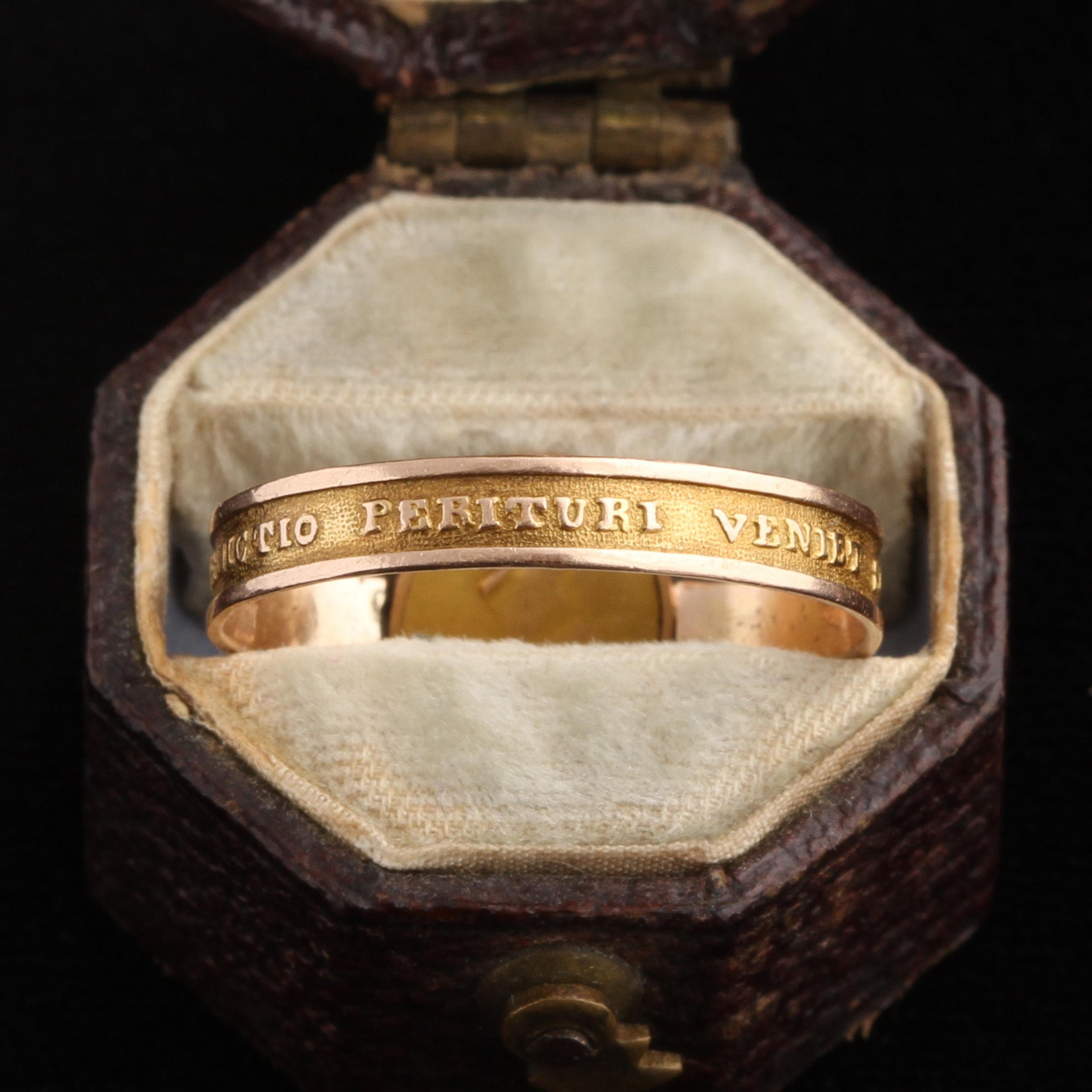This ring celebrates Stephanie de Beauharnais. Born in Versailles during the French Revolution, she was the cousin to Josephine's kids, who became Napoleon's step-kids. Stephanie's "Uncle" Napoleon crowned himself Emperor of the French in 1804 and Stephanie got to live a fabulous life in the Tuileries Palace. Josephine and Napoleon couldn't conceive children of their own, so Napoleon adopted Stephanie and gave her the title of "Princesse Française". This was a power move; he quickly married her off to create a strategic alliance with the Grand Duke of Baden. Regarding the words "Stephanie FV 1814": The FV stands for Filia Verum, or "True Daughter". Apparently, Napoleon had real feelings of affection for Stephanie; adopting her was at least partially out of love. 1814 is the year Napoleon abdicated the throne and went into exile in Elba. The text on the band appears to be based on a passage from the Book of Job which reads "the blessing of him who was about to perish came upon me", but slightly modified to "And the blessing of him who who about to perish came upon YOU". Does this refer to Napoleon's blessing of his adoptive daughter and his supporters' hopes that she would continue his legacy?