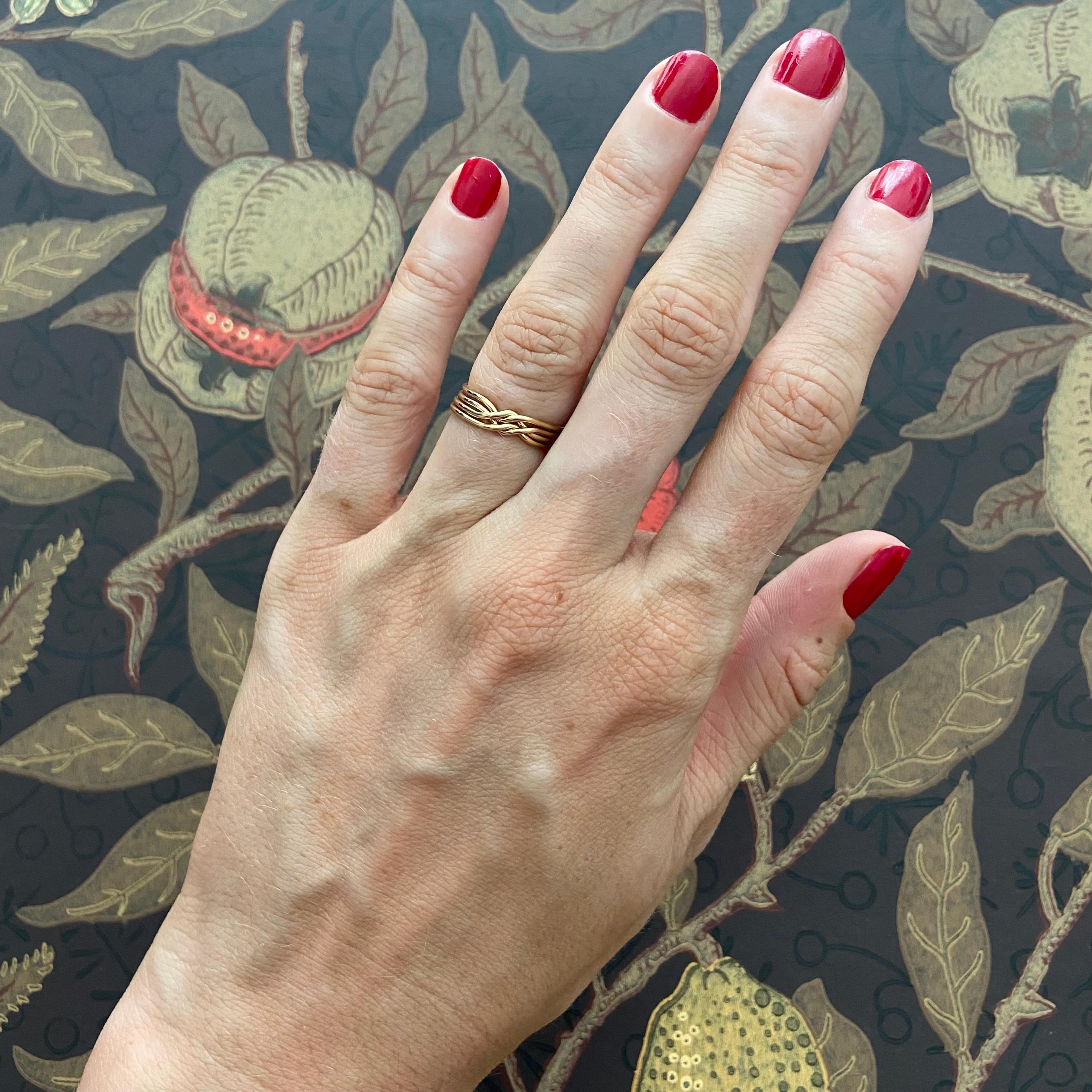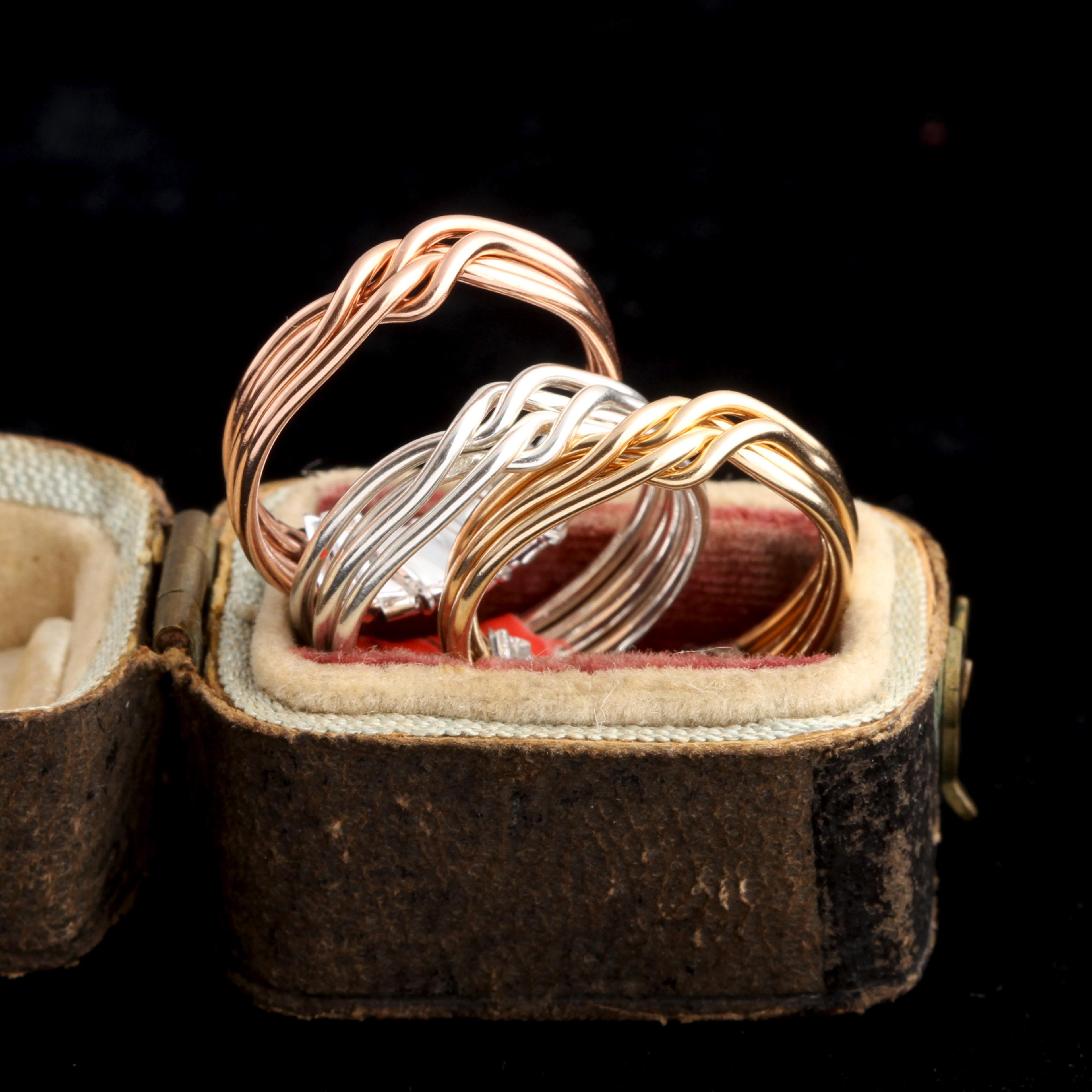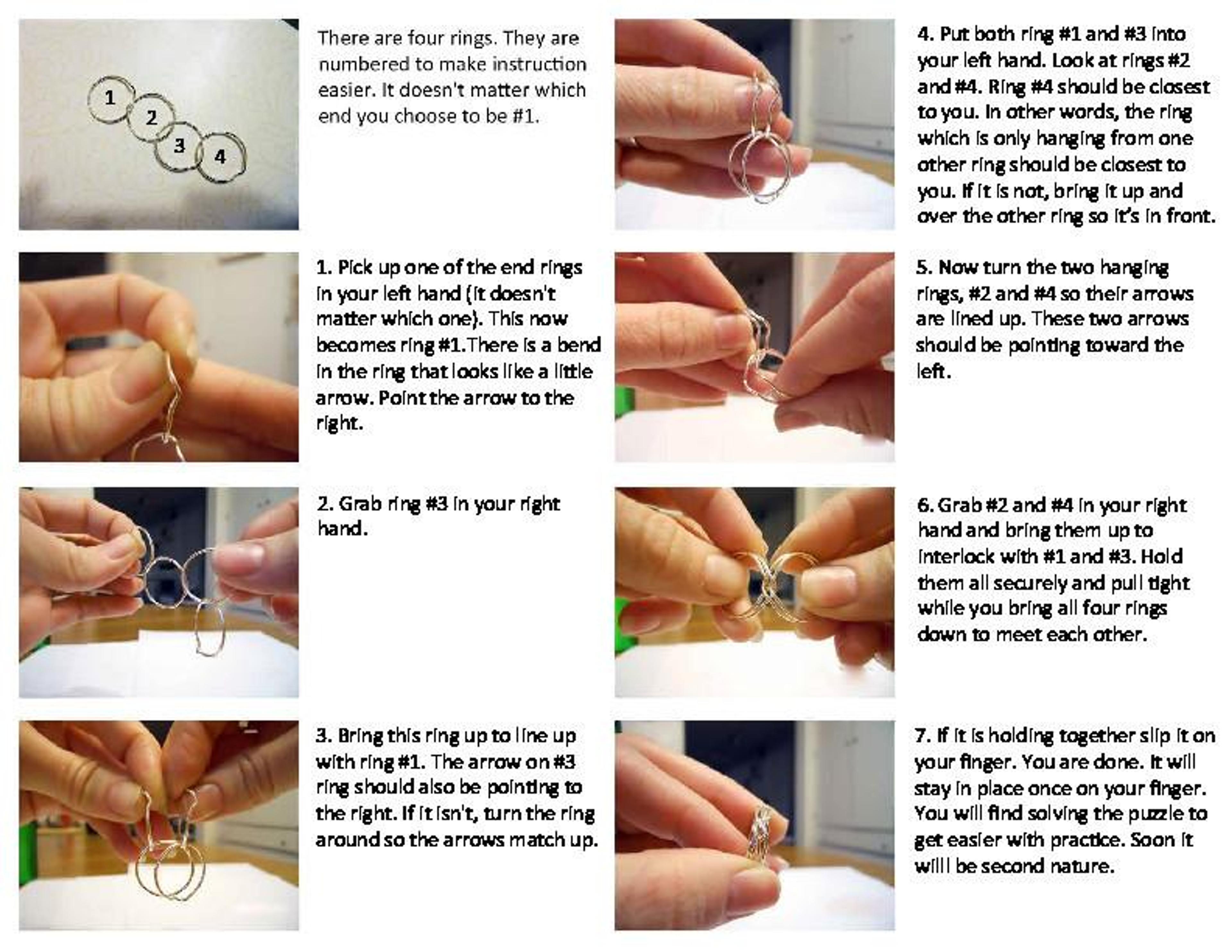 The earliest puzzle rings were found on the Silk Road, and were thought to have been popular in China as early as the year 0 AD. There's an unlikely-sounding myth about a medieval Turkish merchant who commissioned the very first one as a wedding ring for his gorgeous wife. To make sure she was faithful to him while he was away, the ring would unravel if she took it off, rendering her totally busted. We know for a fact that in 1525, Martin Luther gave his wife a puzzle ring when they were married. The poignant inscription inside read: "Whom God has joined together, let no man put asunder". Your gold-filled or sterling silver ring will arrive joined together, and good luck trying to solve the mystery when it's put asunder. To help you out, we've made a visual diagram: click on the detail photo below to get the instructions.