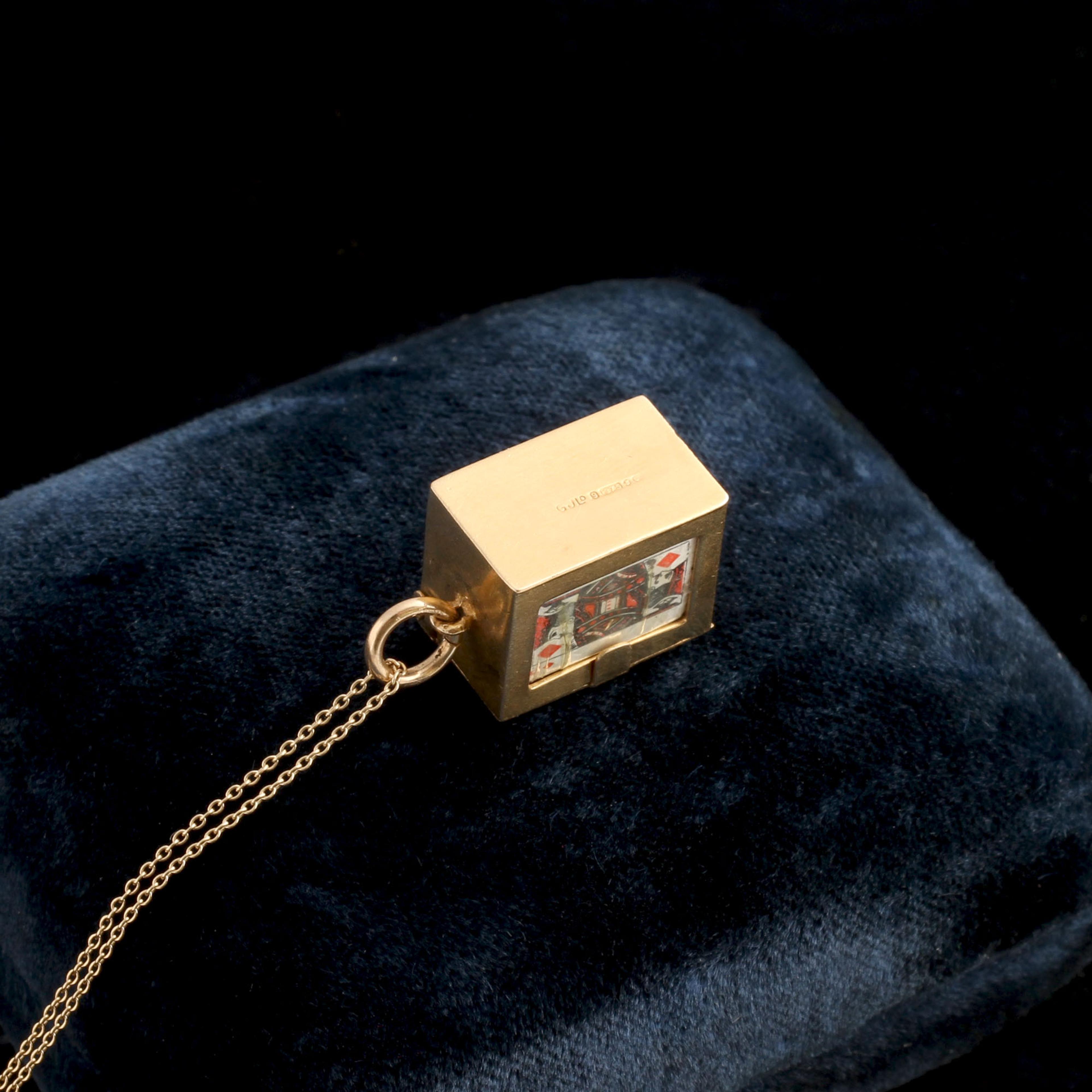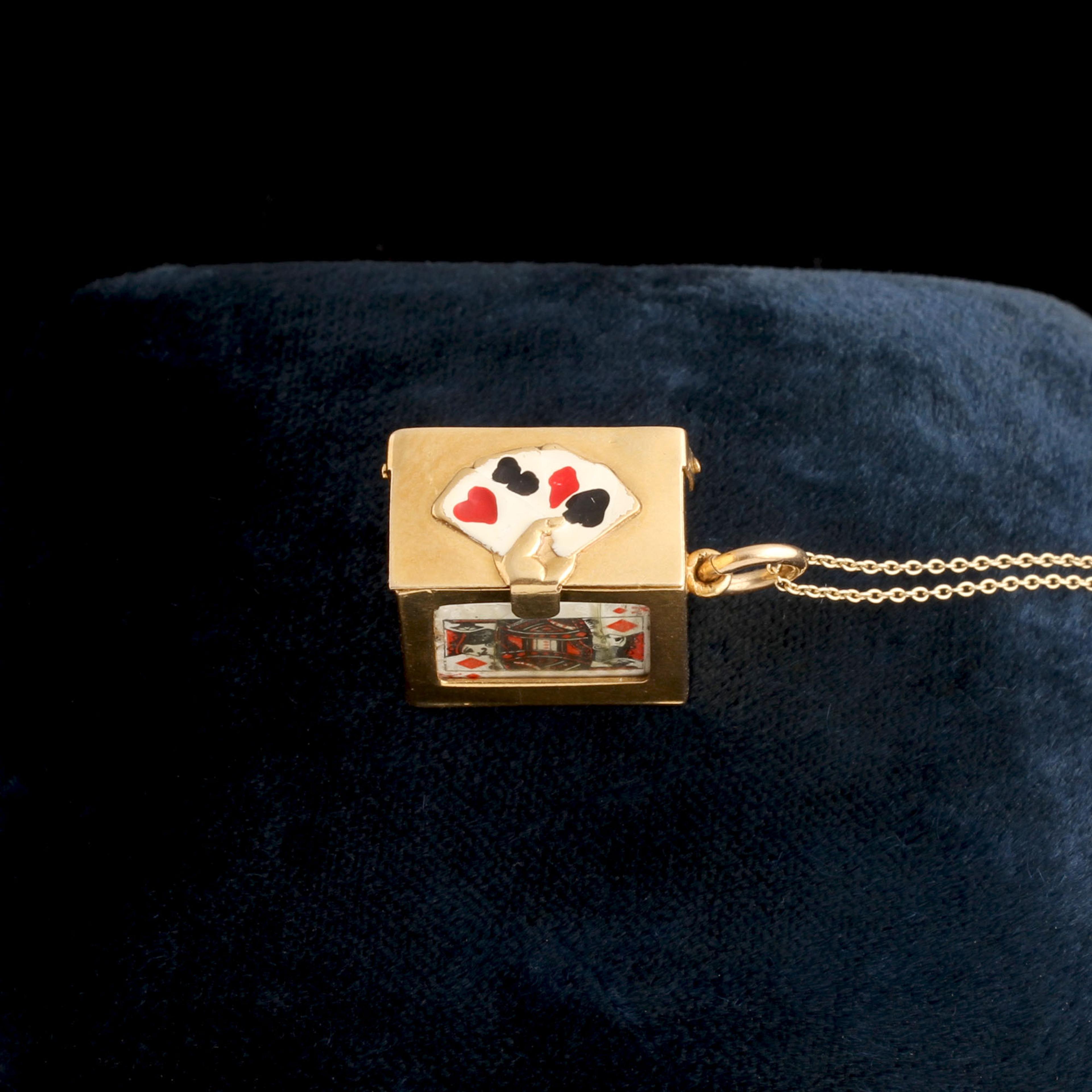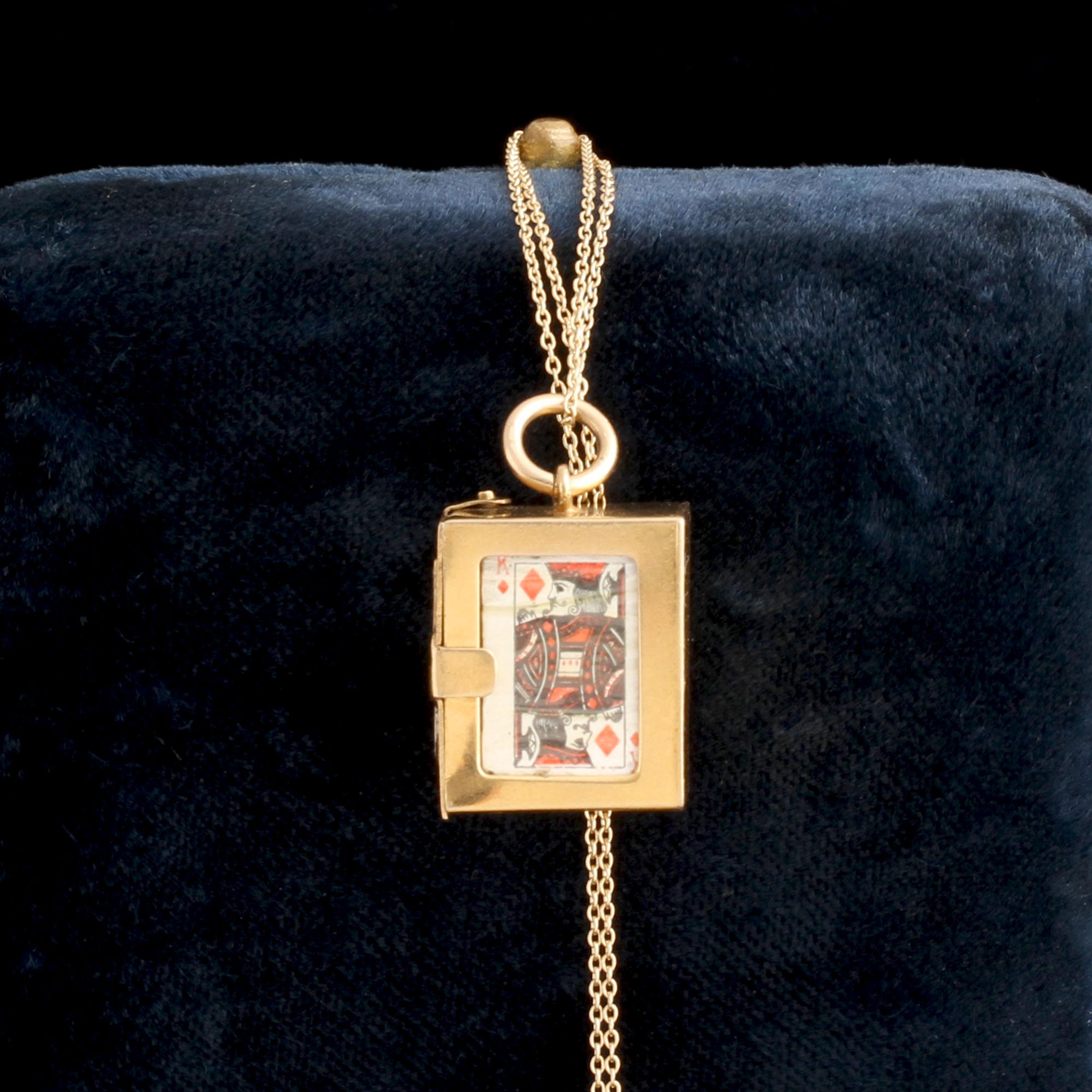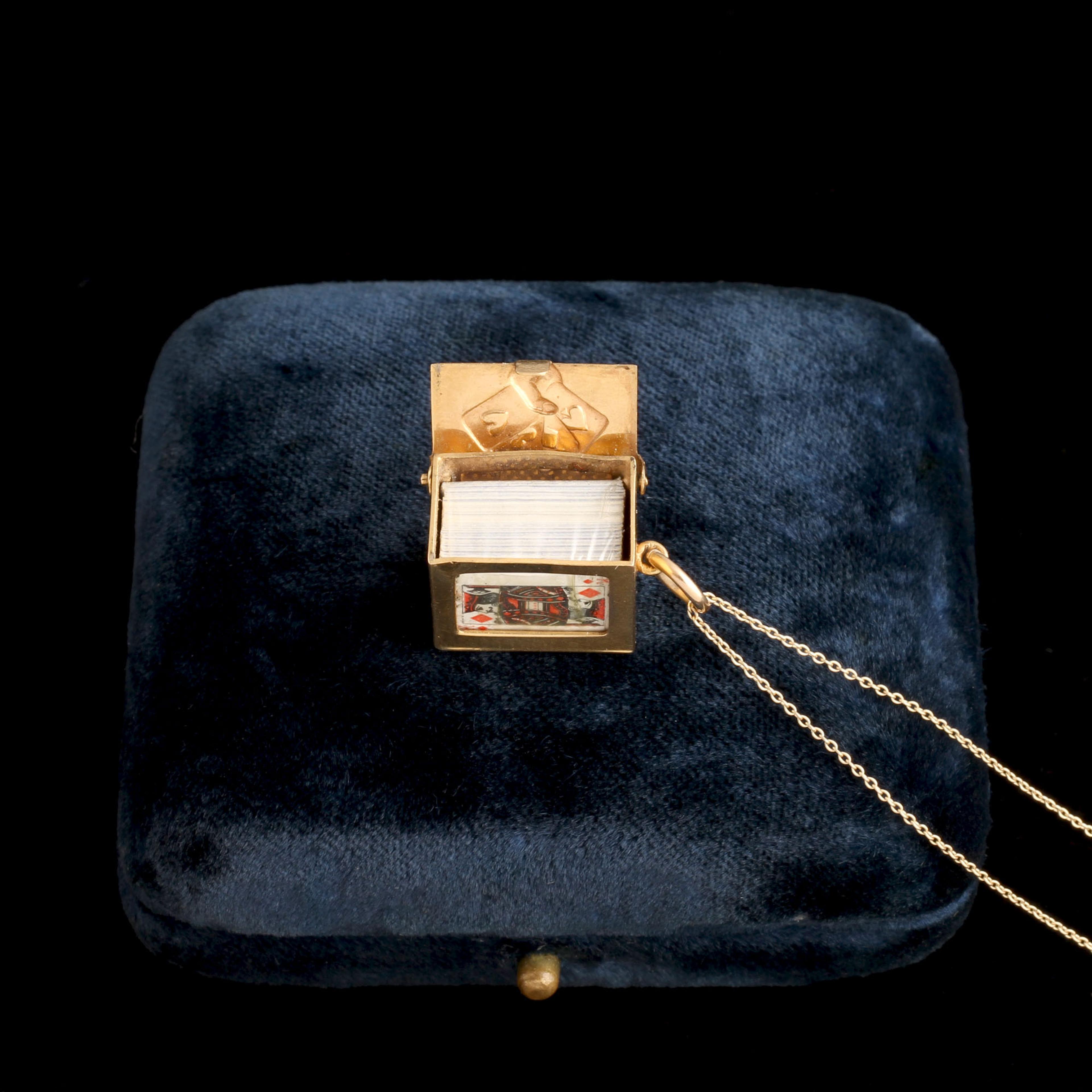 This full deck of miniature playing cards was made in the high-flying Mad Men era, where gambling and boozing was tolerated way more than it is today. It was encouraged, even. Secured in a 9k gold box with more enameled cards on one side, it was a good-luck charm meant to be kept close, perhaps on a charm bracelet. British hallmarks.